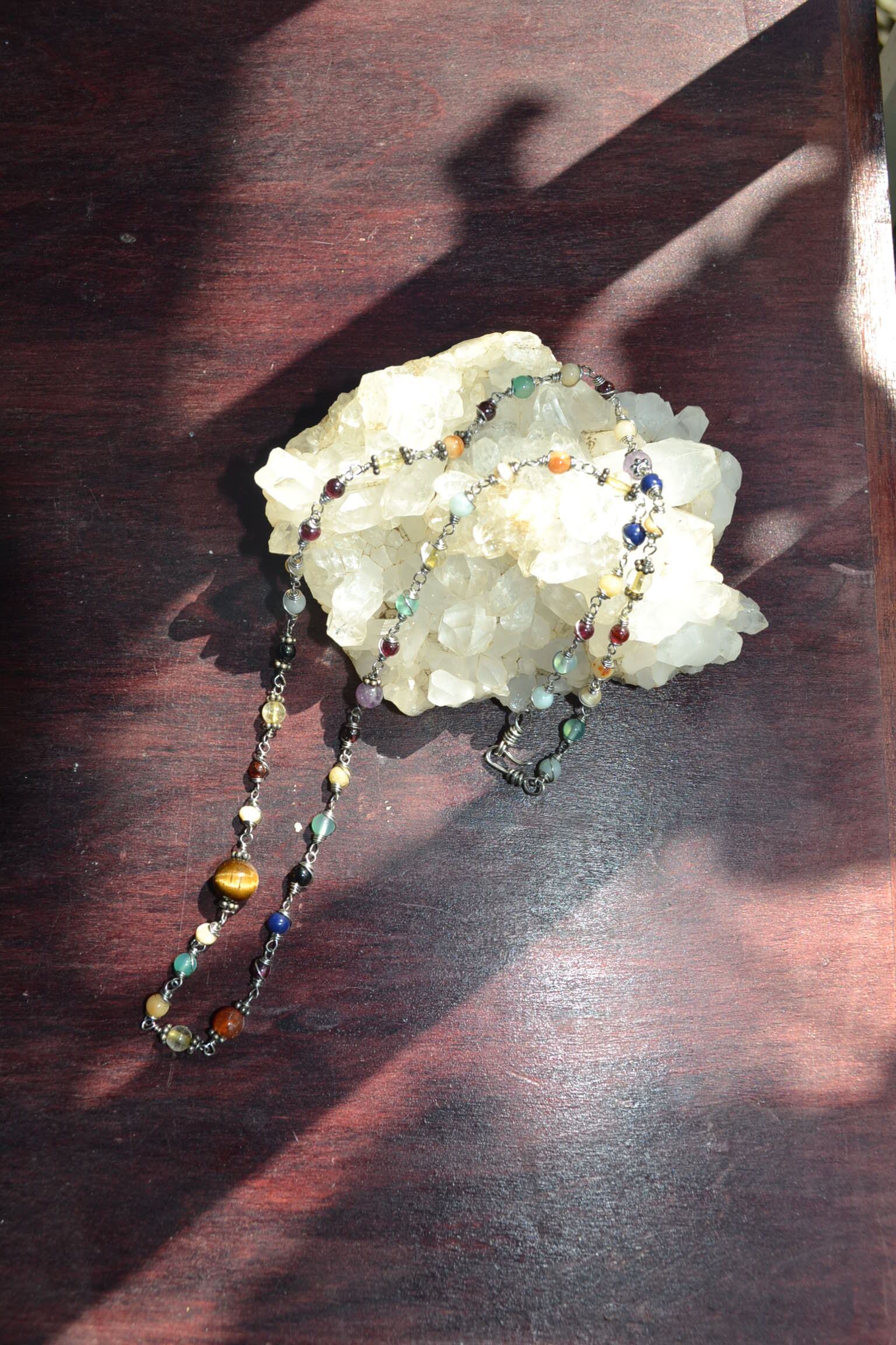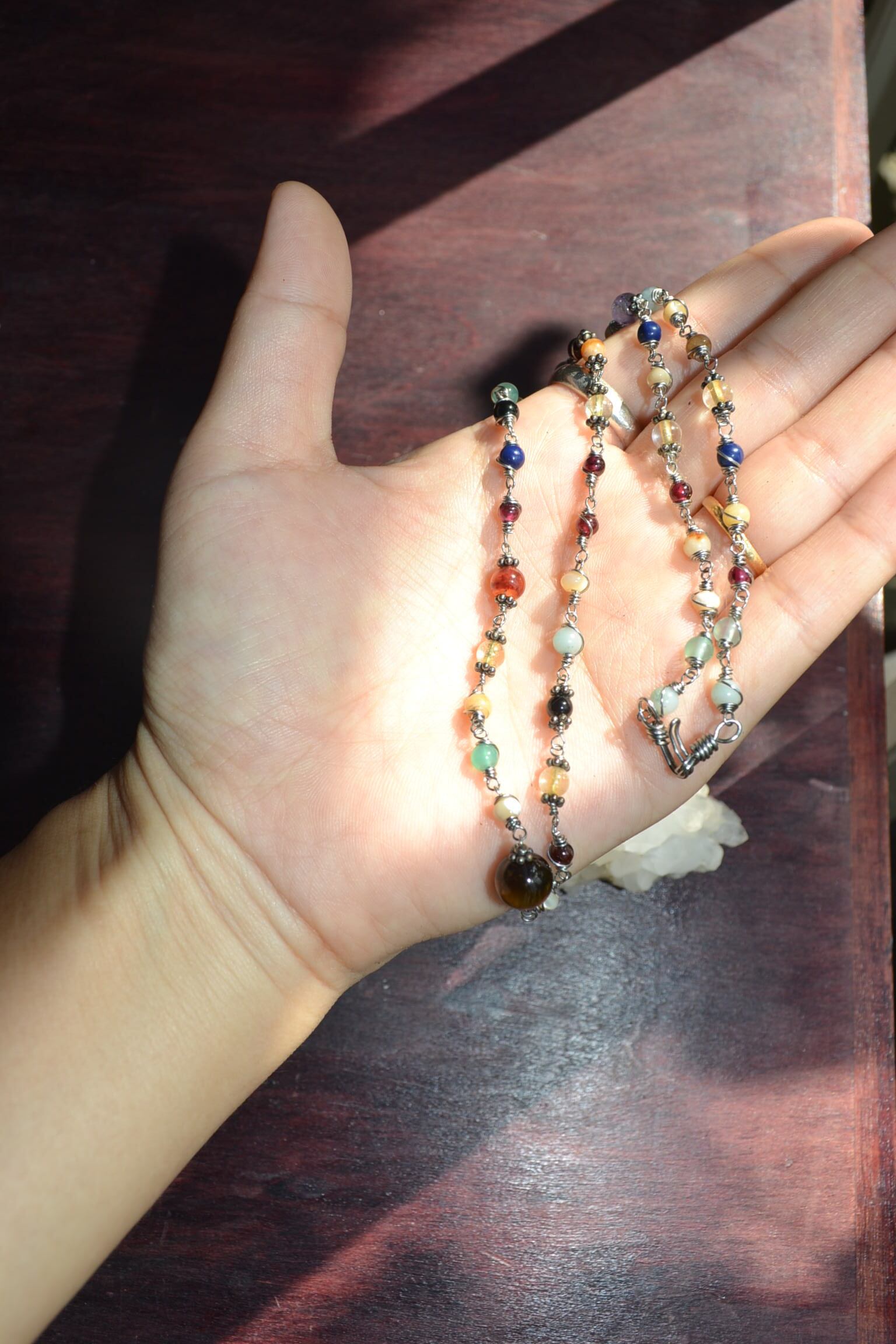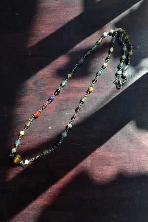 ひとつずつ、ワイヤーを頑丈に結び、繋いたネックレスになります。装着時に天然石ビーズが肌にぴったりと馴染むネックレスでもあります。