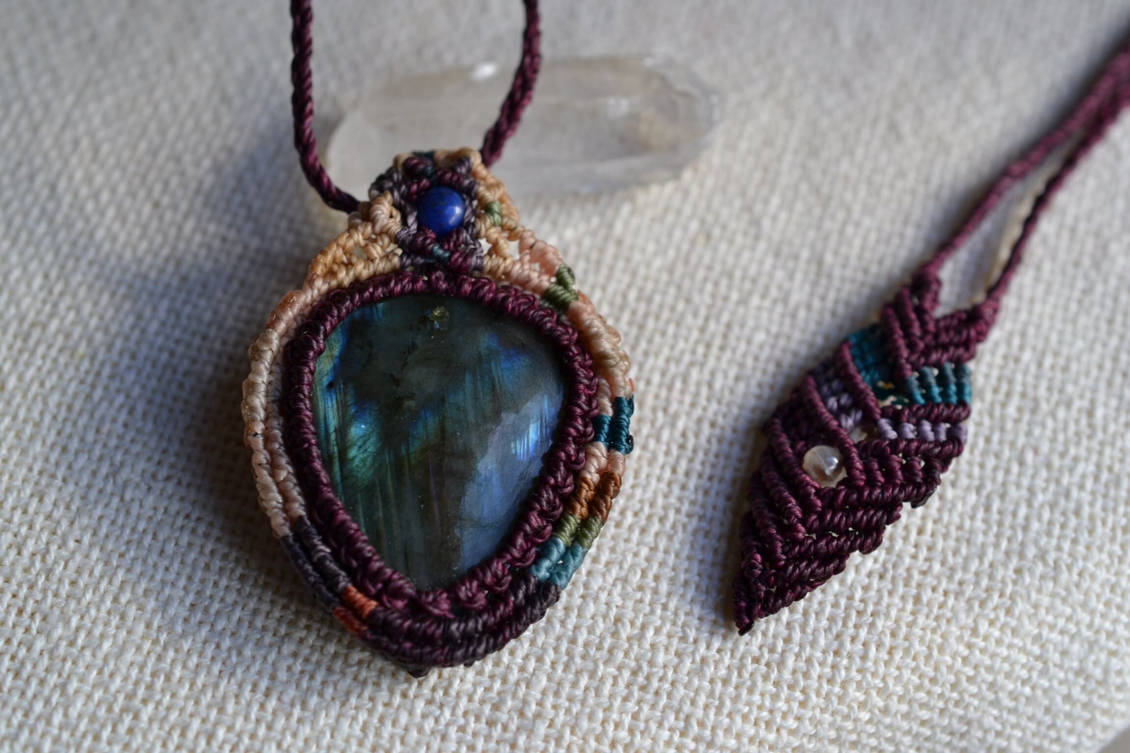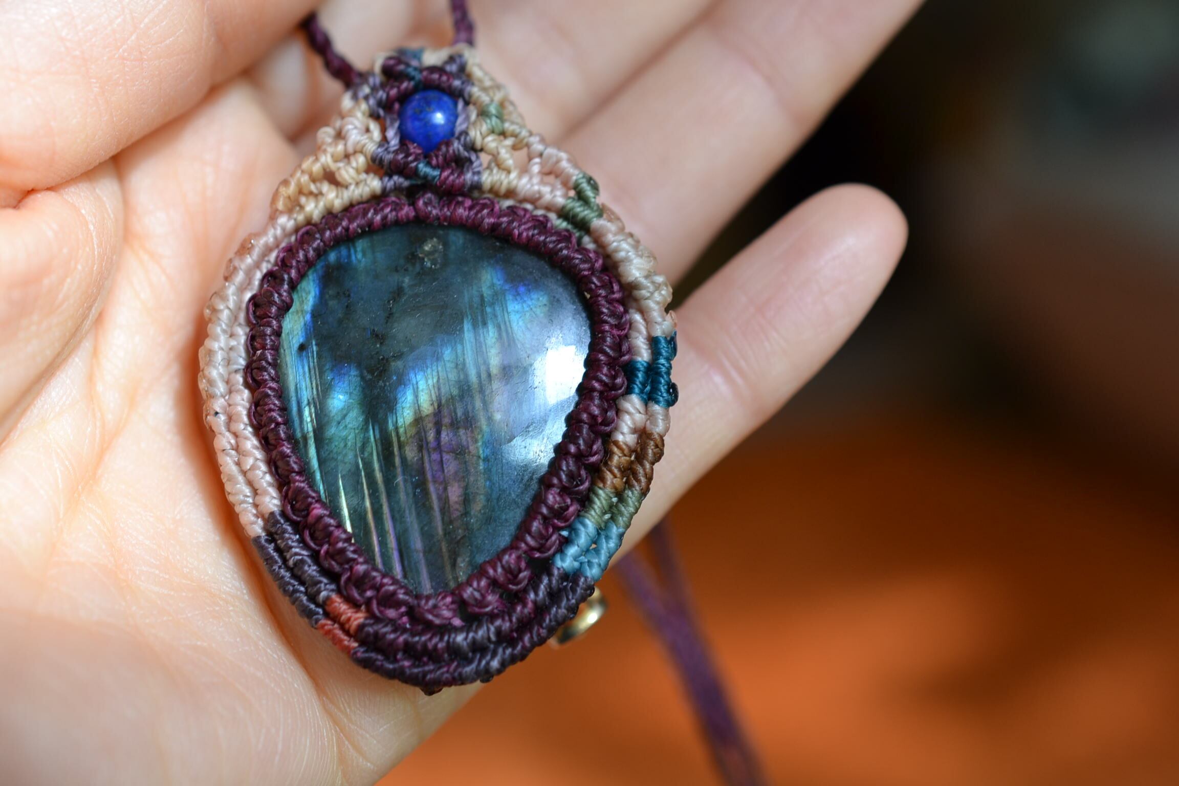 ブルーレインボー ラブラドライトマクラメ編みペンダントネックレス