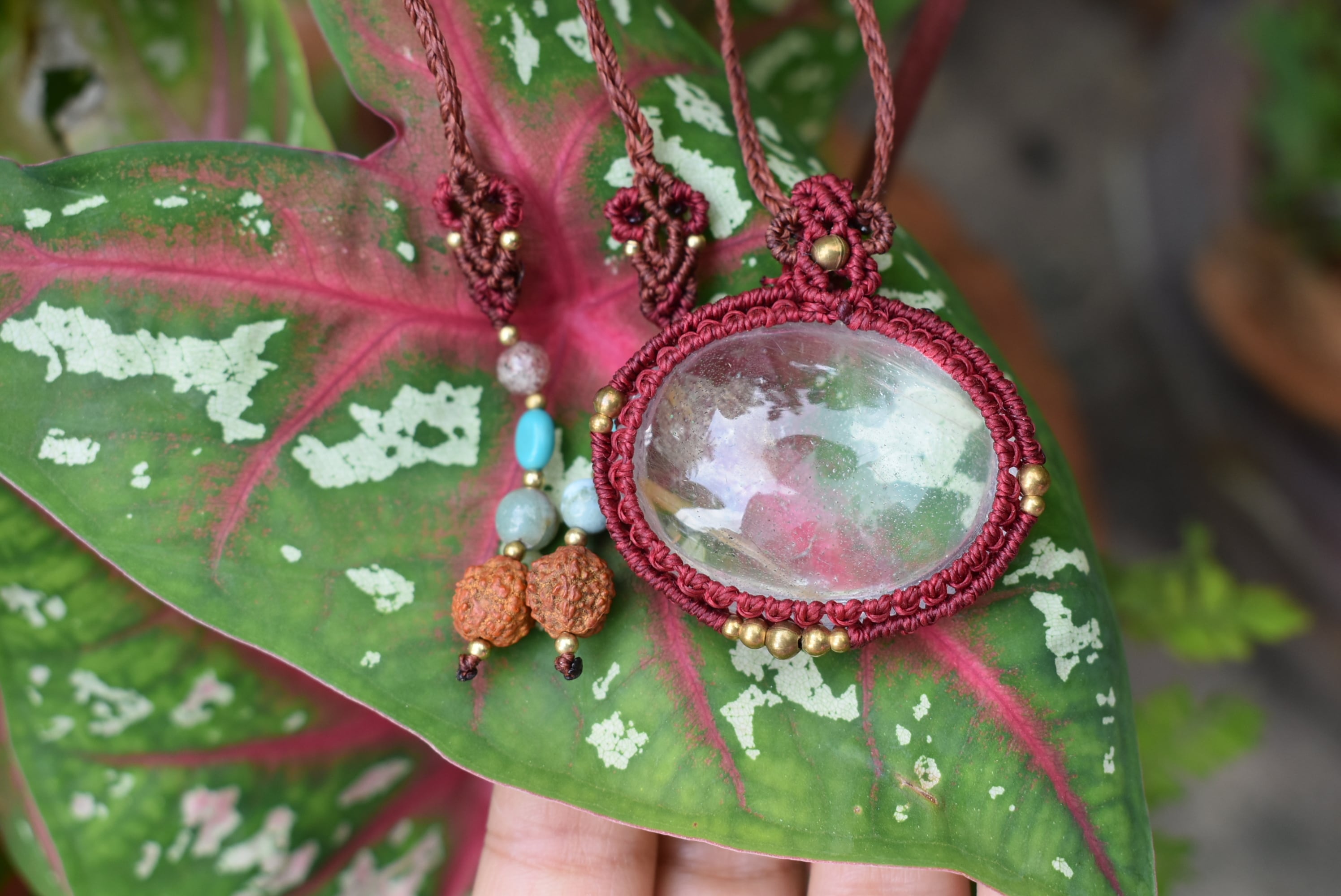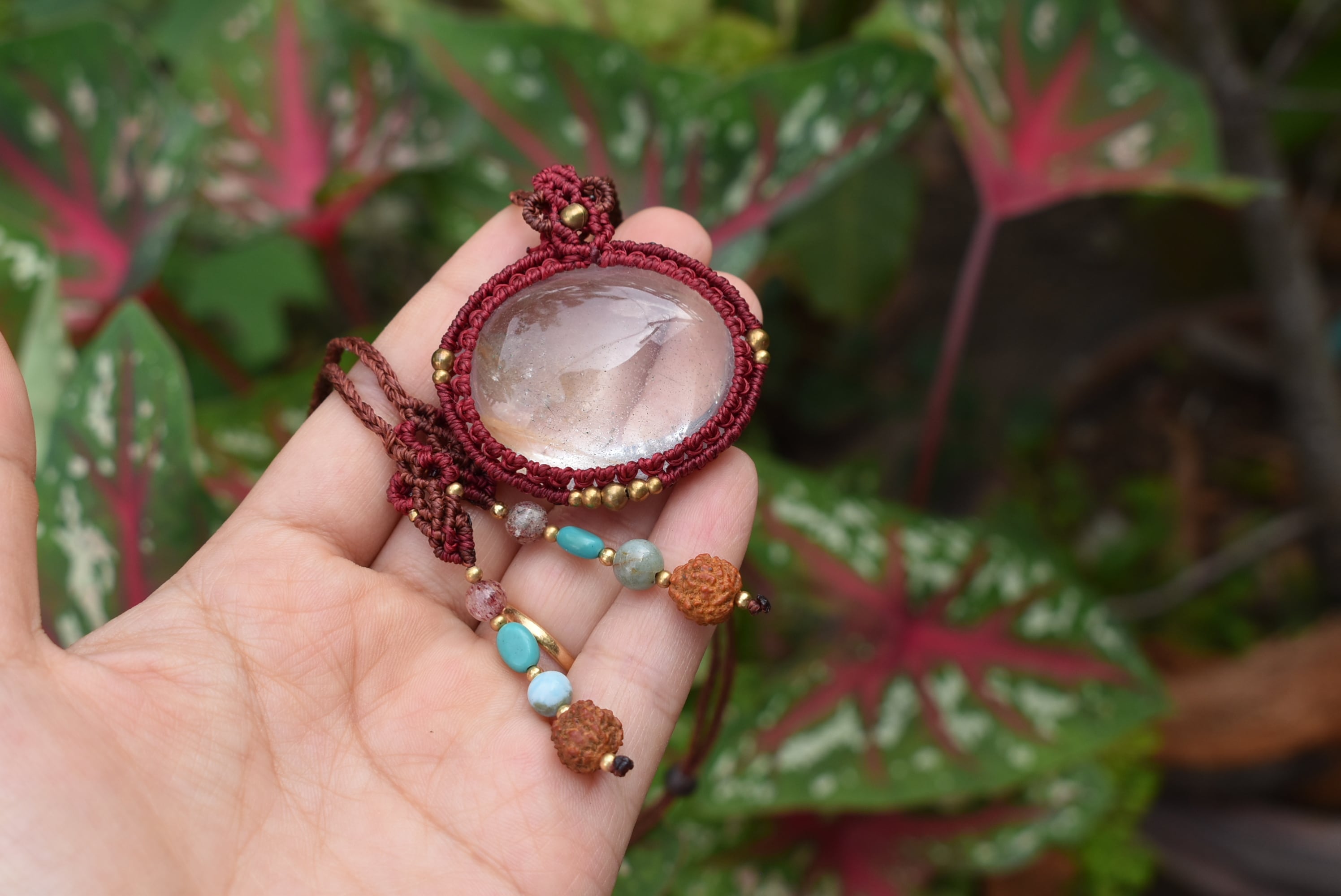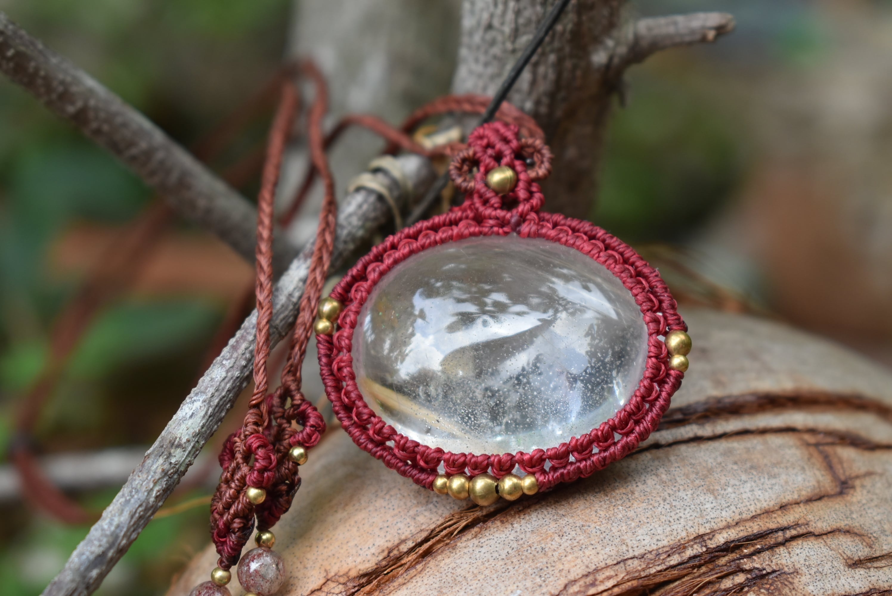 透明感や生物の気泡のありのままの姿をお探しの方に、手触りの素晴らしい研磨が施された水晶ルースをマクラメ編み装飾をシンプルに施してペンダントに仕上げました。