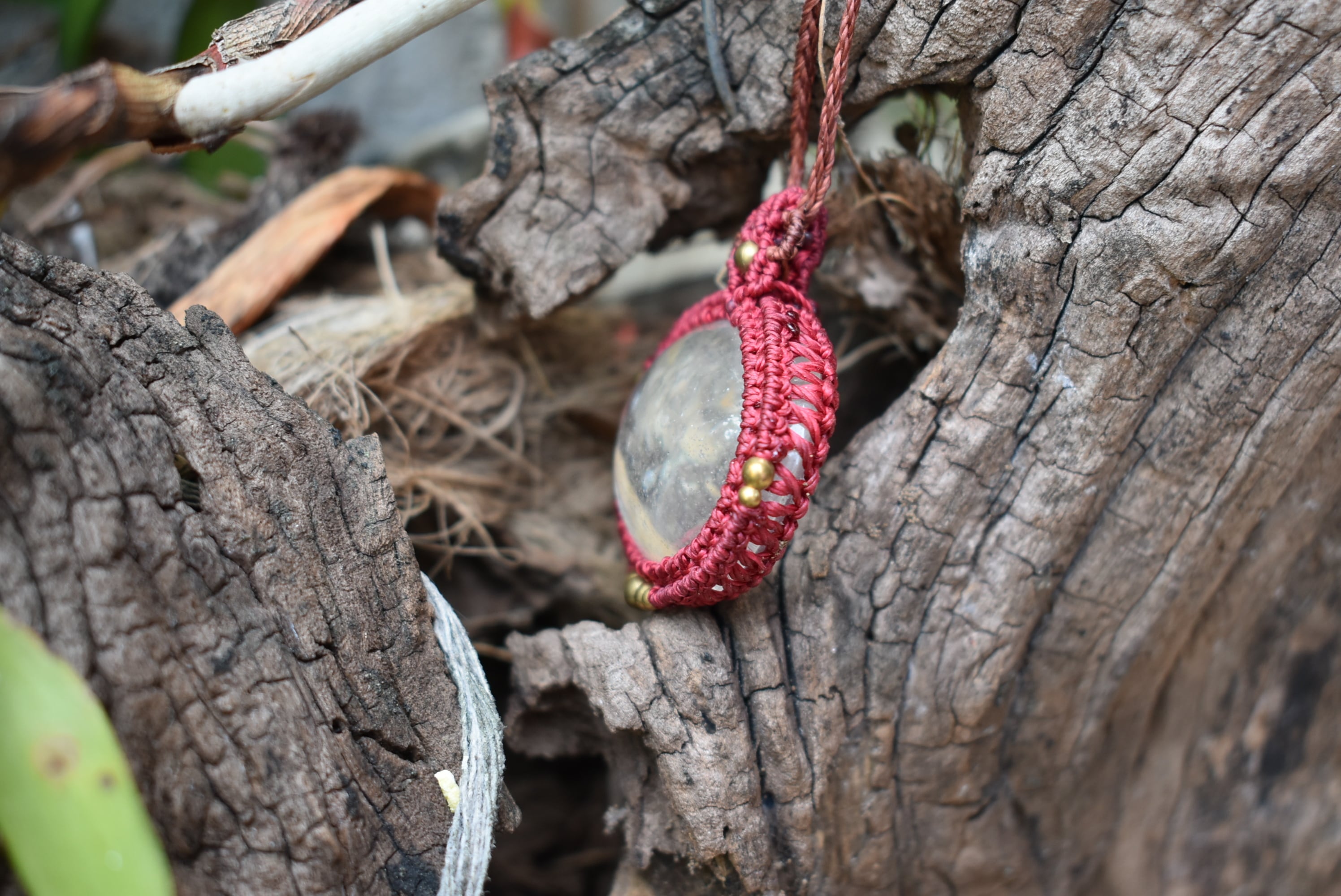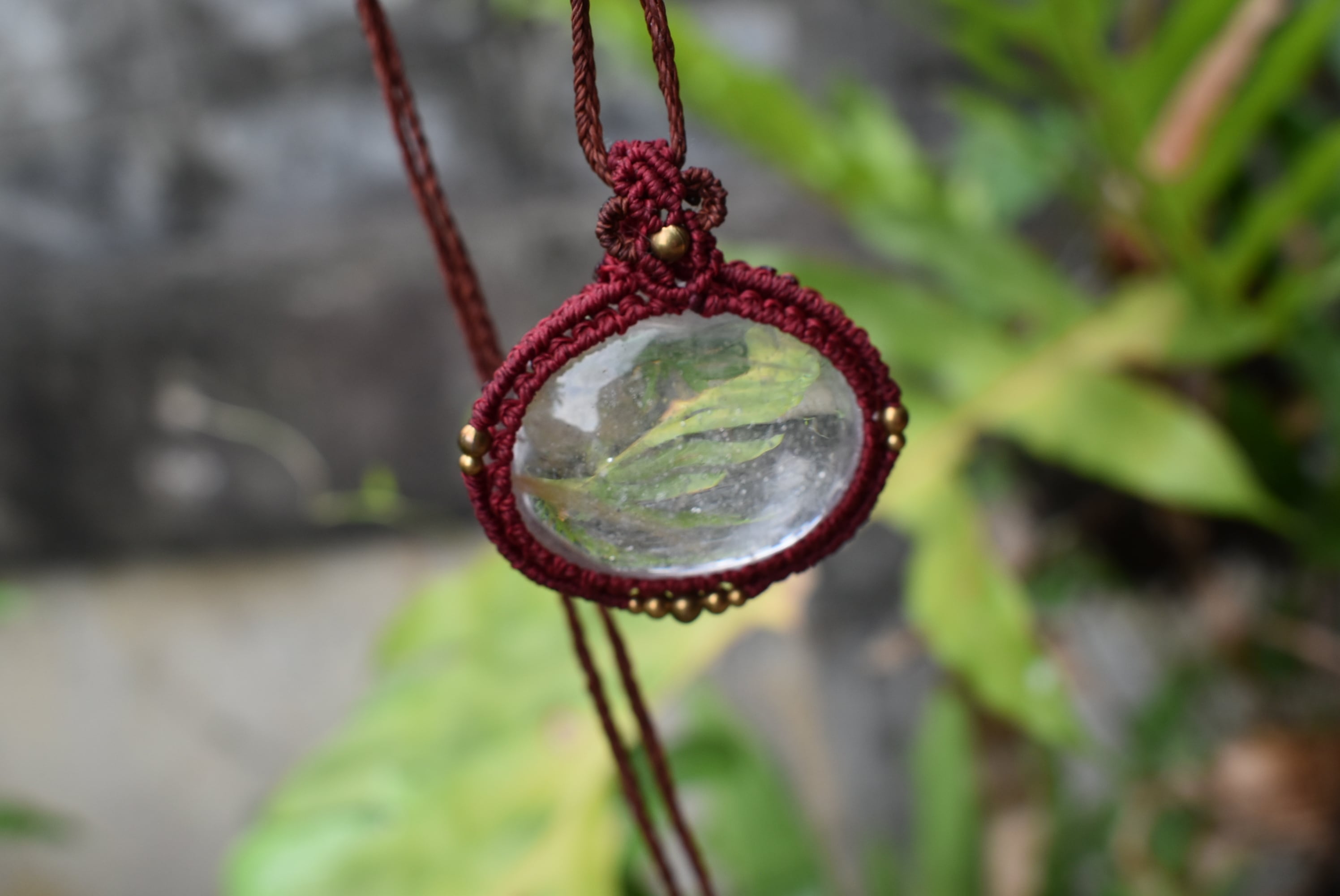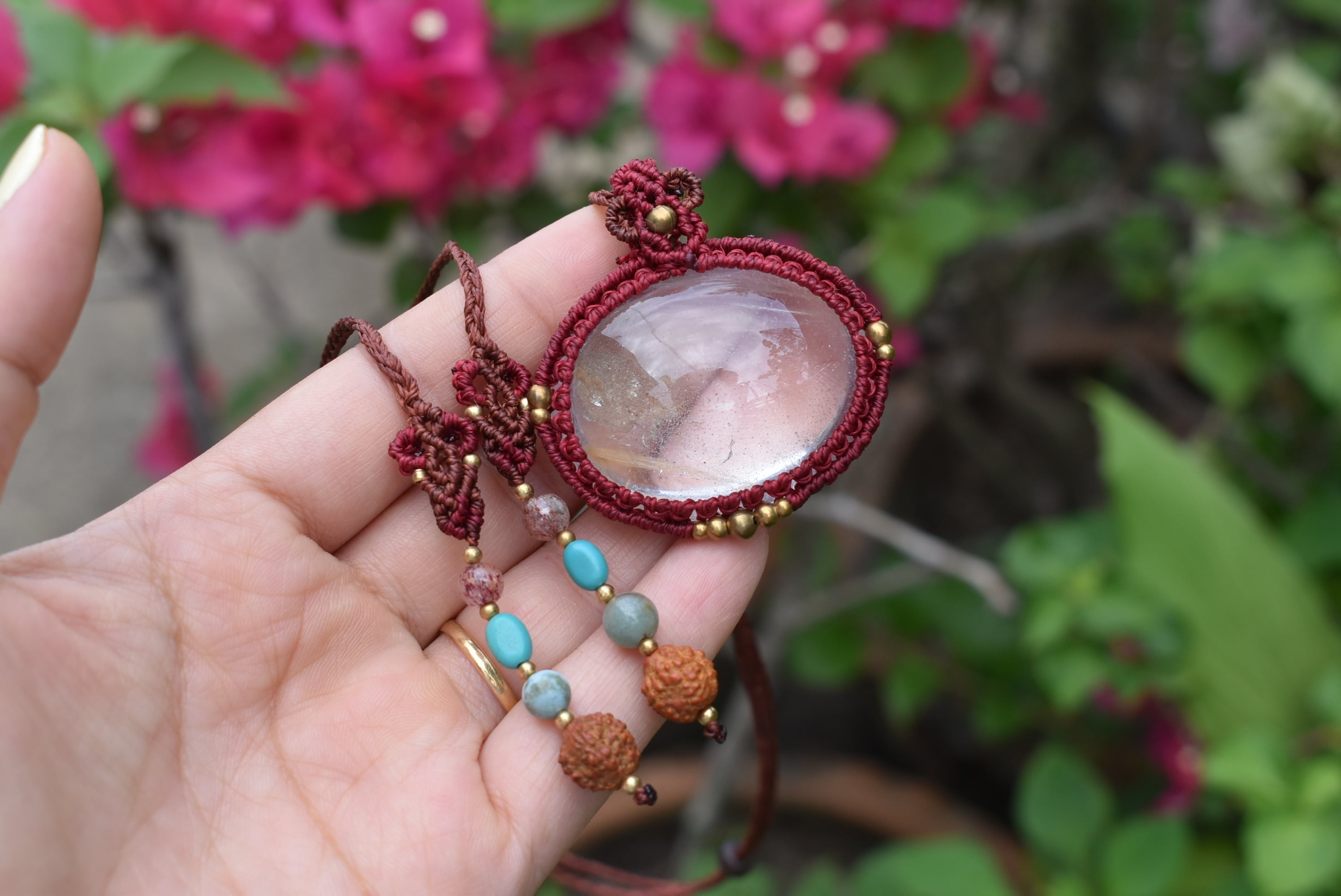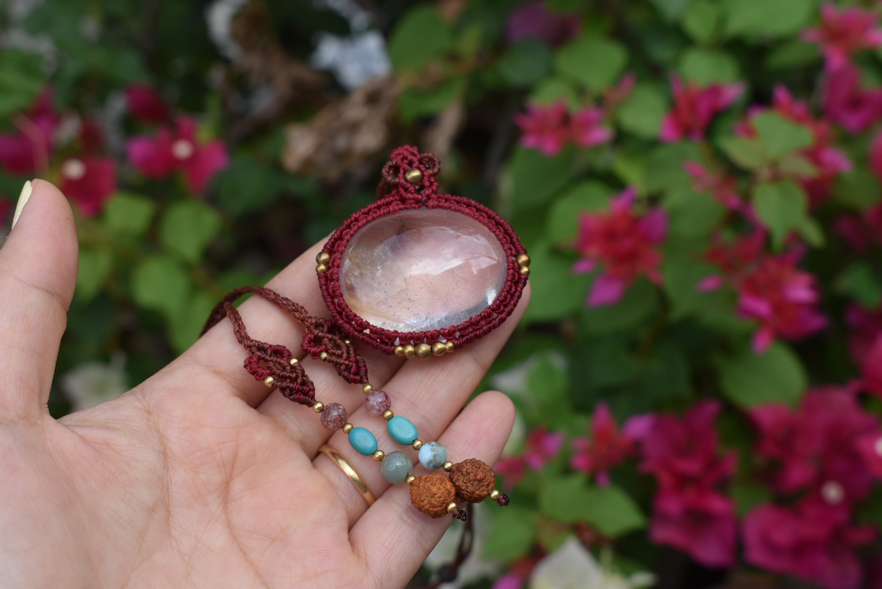 透明感や生物の気泡のありのままの姿をお探しの方に、手触りの素晴らしい研磨が施された水晶ルースをマクラメ編み装飾をシンプルに施してペンダントに仕上げました。