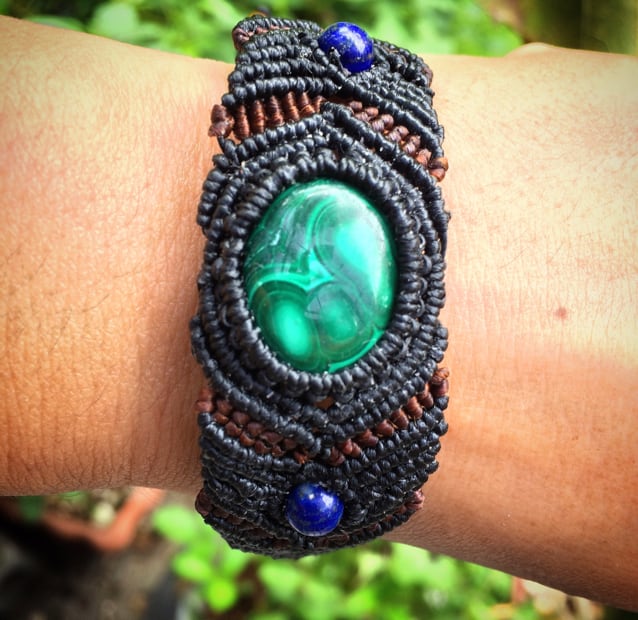 こちらのマラカイトは鋭い色合いと模様を持ちあわせた石なので、それに合わせてしっかりとマクラメ編み装飾を施しブレスレットに仕上げました。ブラックカラーの蝋引き糸に所々、ポイントとしてブラウンを混ぜ合わせ、シンプルに編み上げました。ラピスラズリ、ラバビーズとタイガーアイビーズを組み合わせてポイントをつくりました。