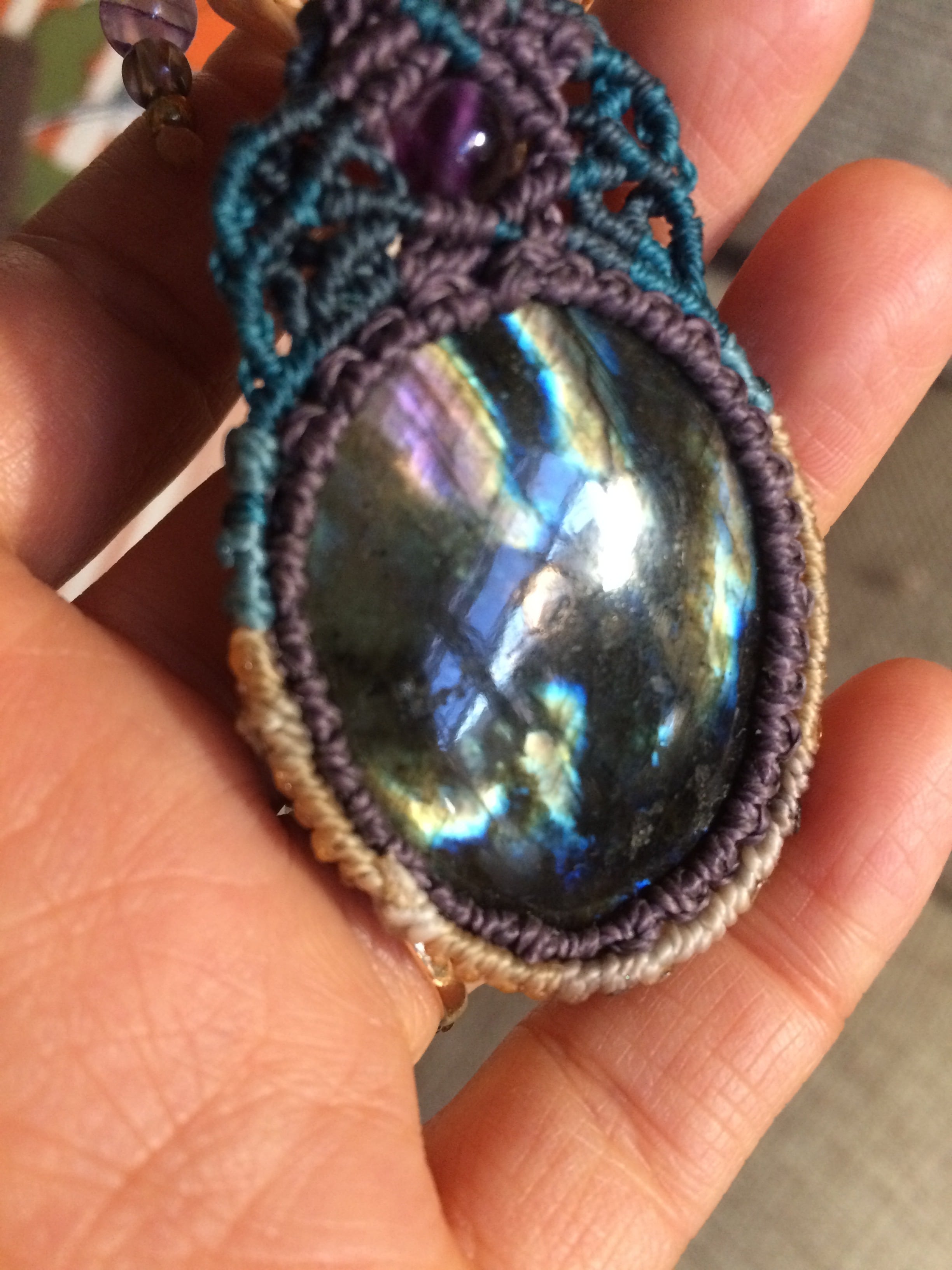 こちらのラブラドライトは満ち欠けを想像してしまうイエローカラーの稲妻模様と、それとは正反対の色味を持つパープル模様が合わさったラブラドライトを石の魅力に合わせて、いろいろな色味の蝋引き糸を合わせてマクラメ編み装飾を施しました。画像では見えにくいのですが、