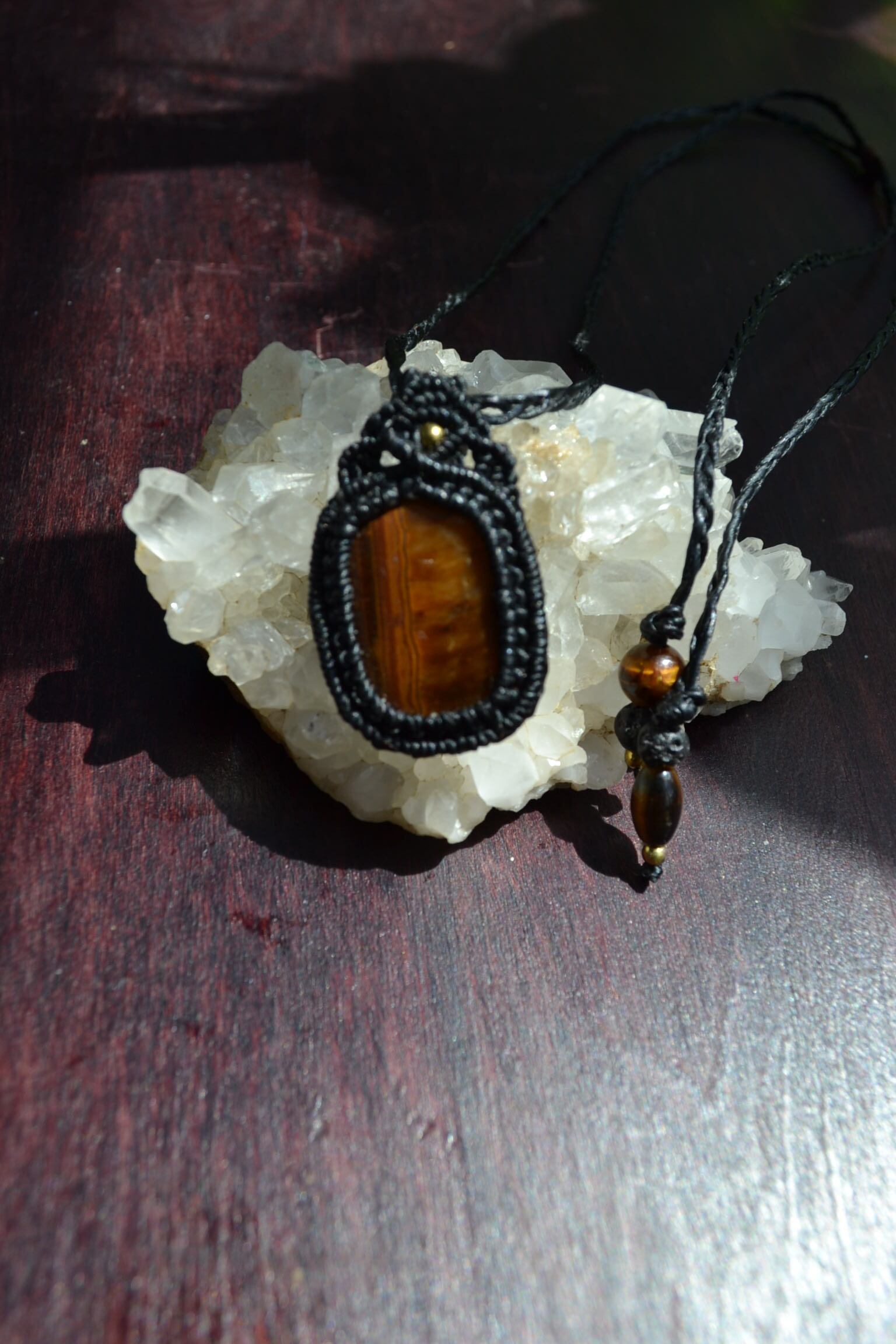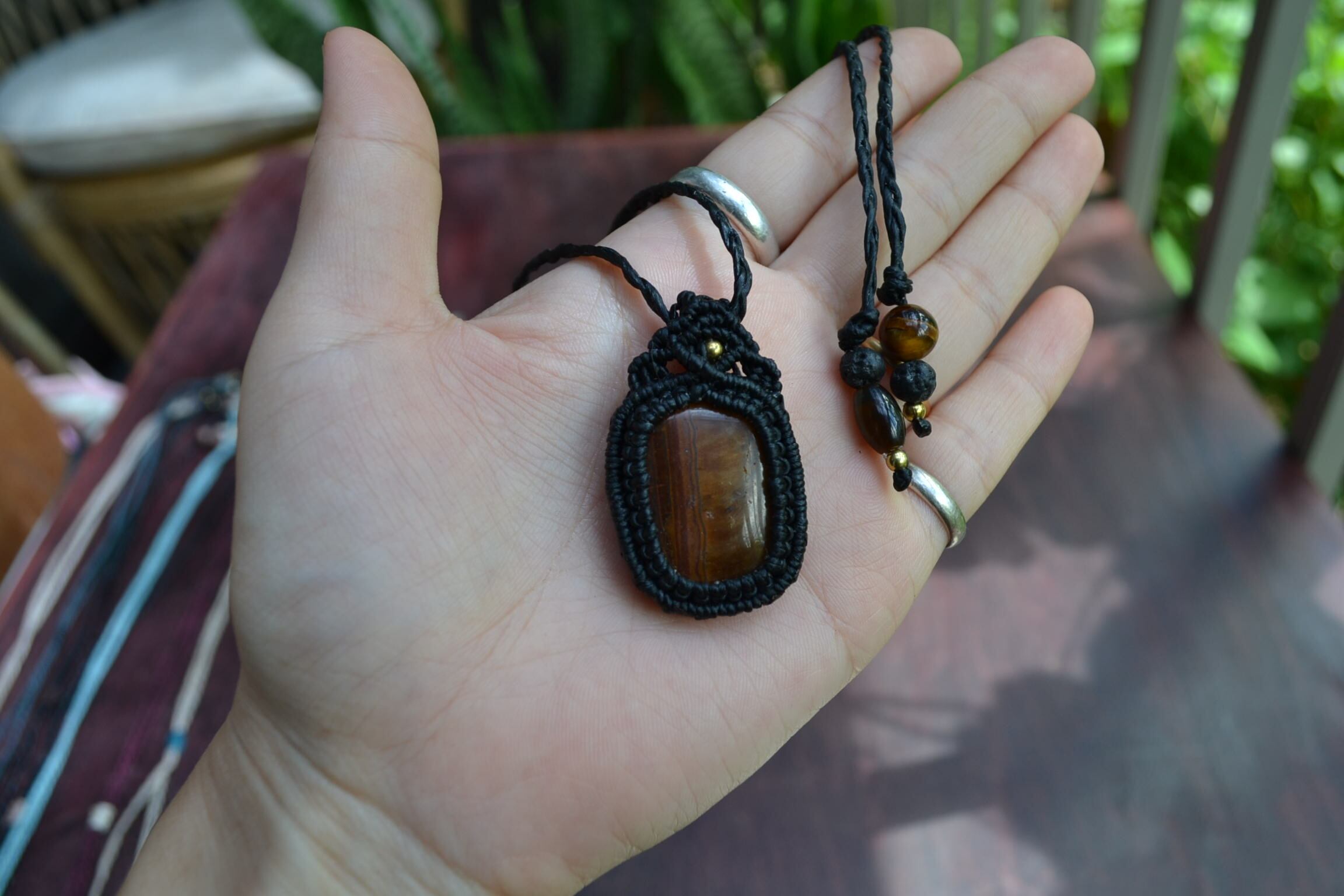 この度のタイガーアイは正面からみて、縦のラインが見えるスクエア型のタイガーアイをマクラメ編み装飾してペンダントに仕上げました。