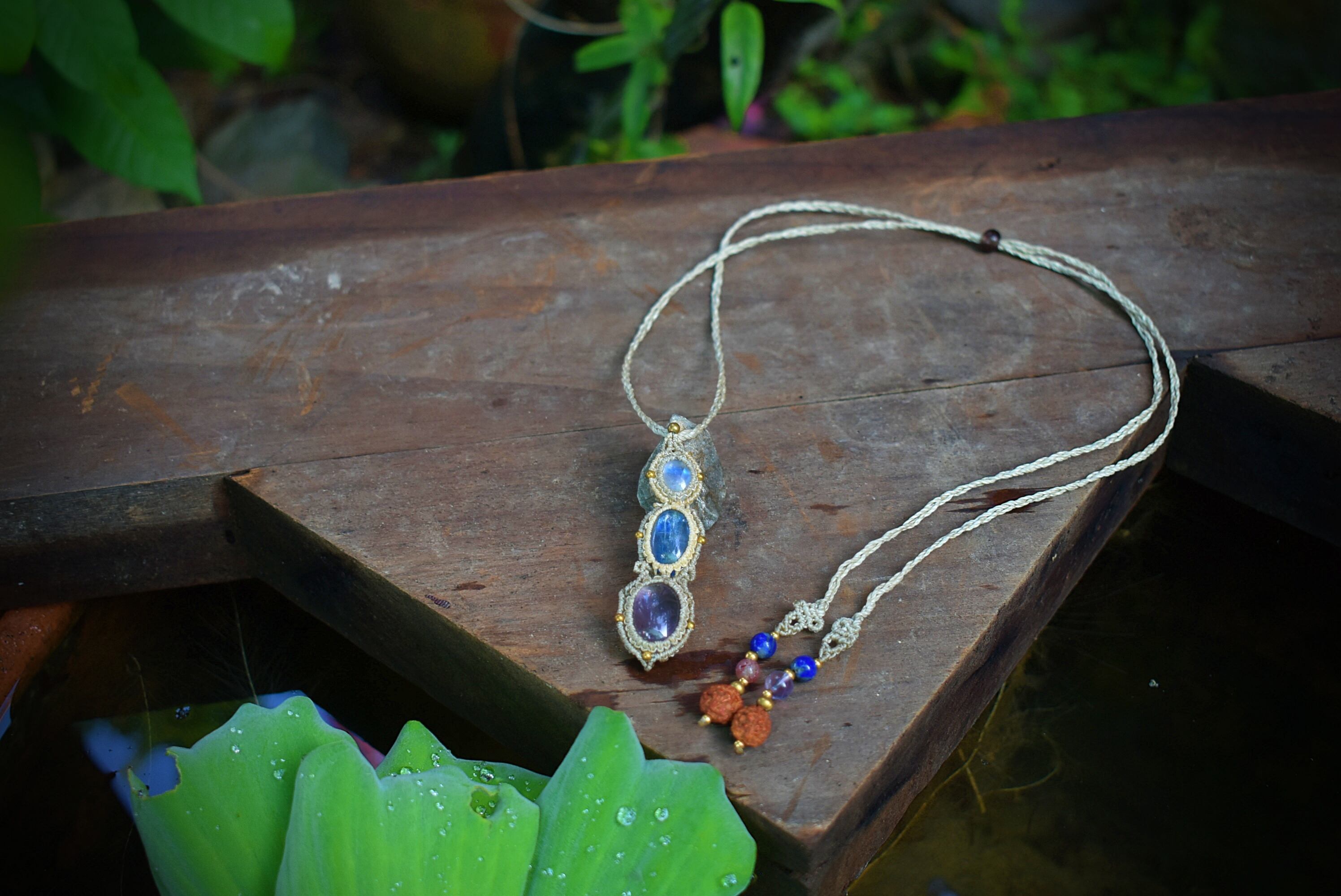 まさに蒼く輝かしい色彩を放つ高品質のカイヤナイト。そしてこの石に劣らず透明感と蒼さを魅せてくれるロイヤルカラーとも言えるホワイトラブラドライト(ムーンストーン)一番下には透明感あるアメトリン。好きな石をぎゅっと詰め込んだペンダントが仕上がりました。
