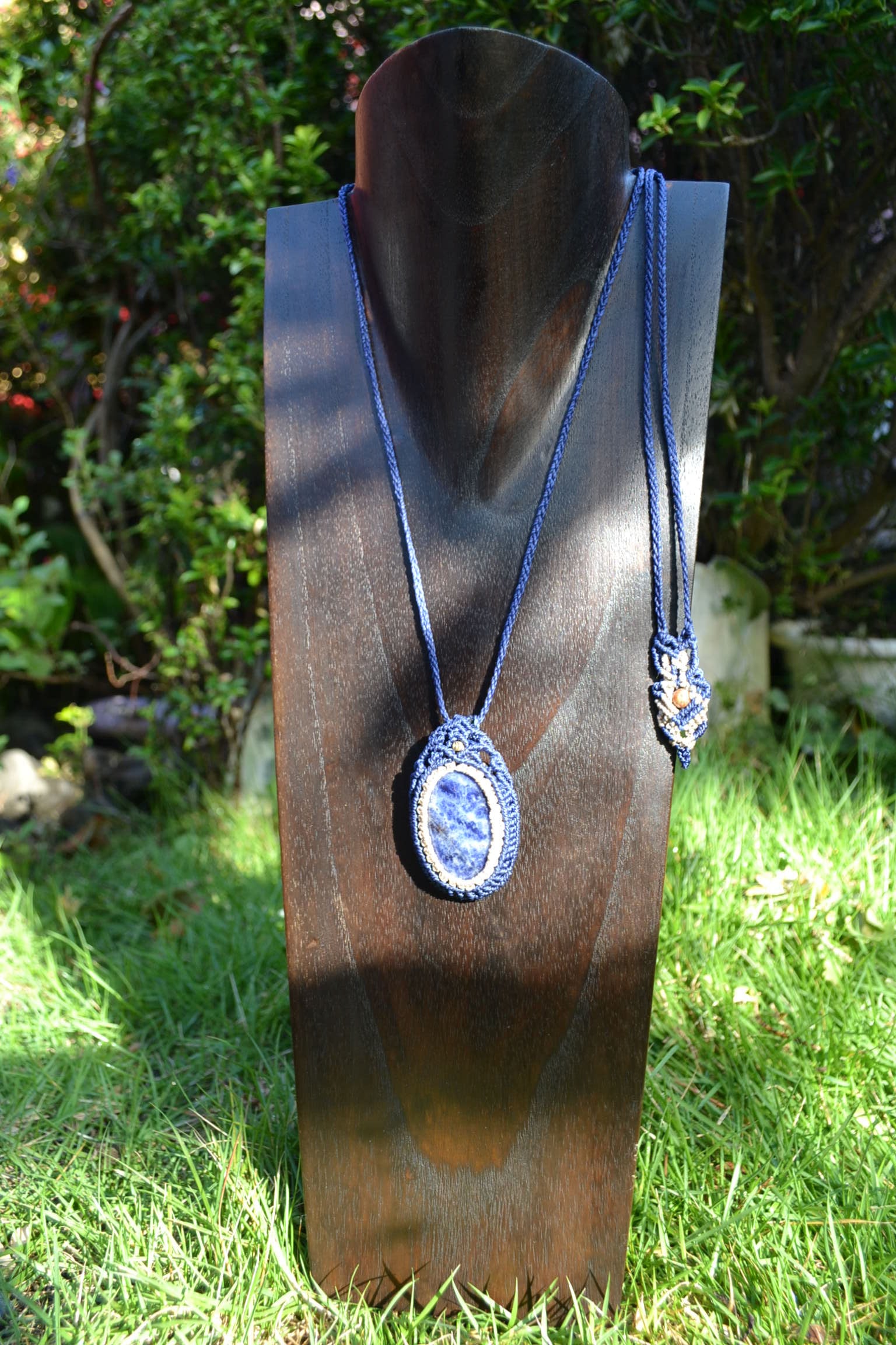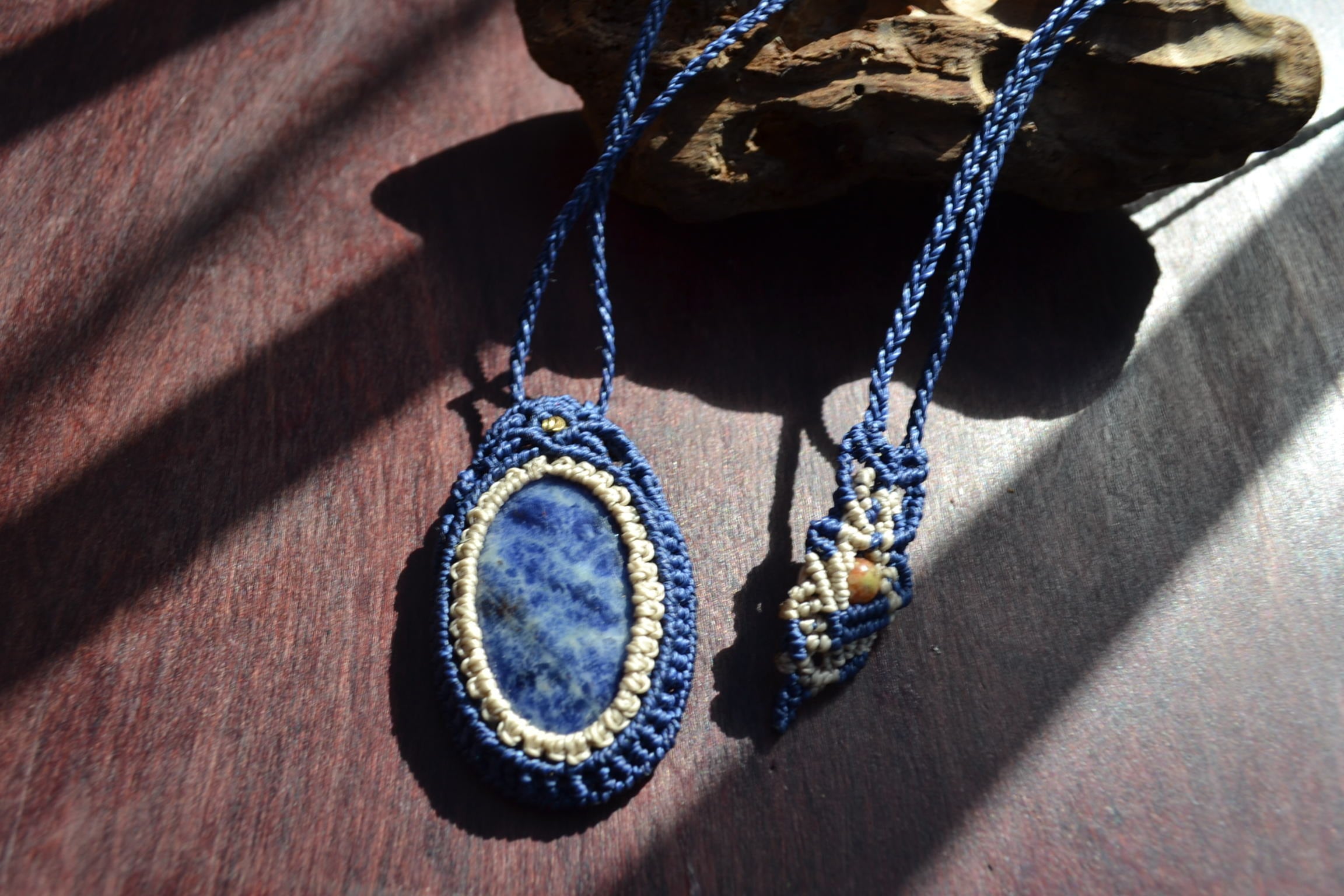 大きなサイズのソーダライトを石を守るようにしてマクラメ編み装飾し、ペンダントに仕上げました。