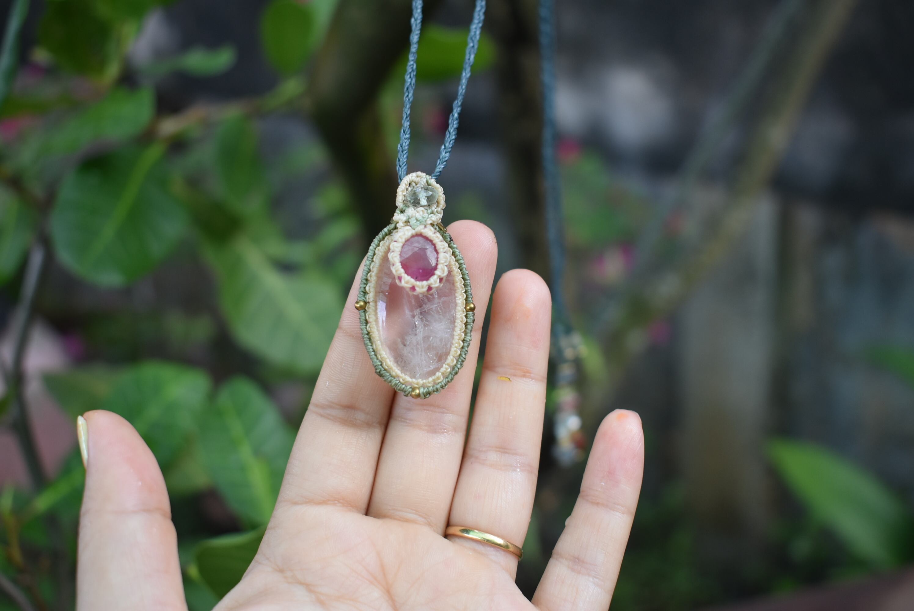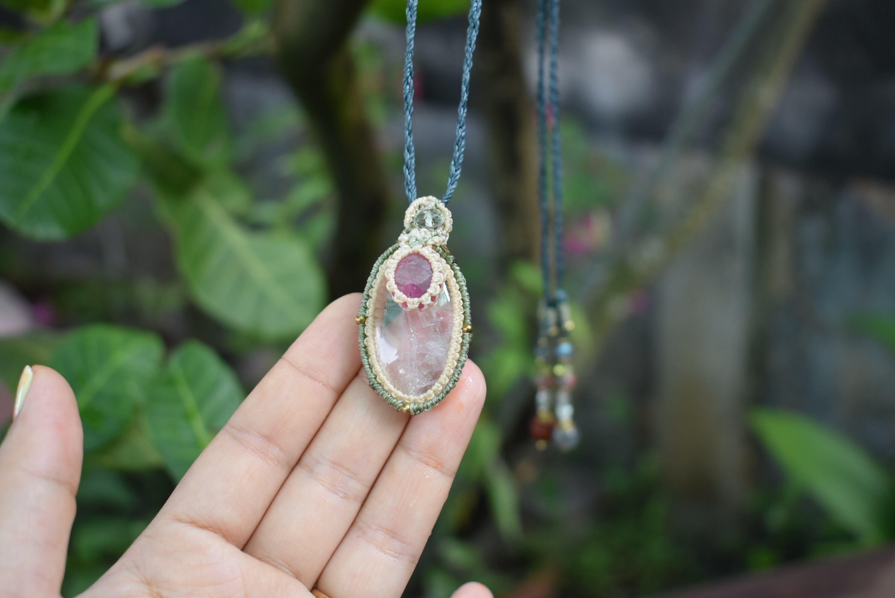 3色ピンクのお花と虹★ルビーとローズクォーツ マクラメペンダント