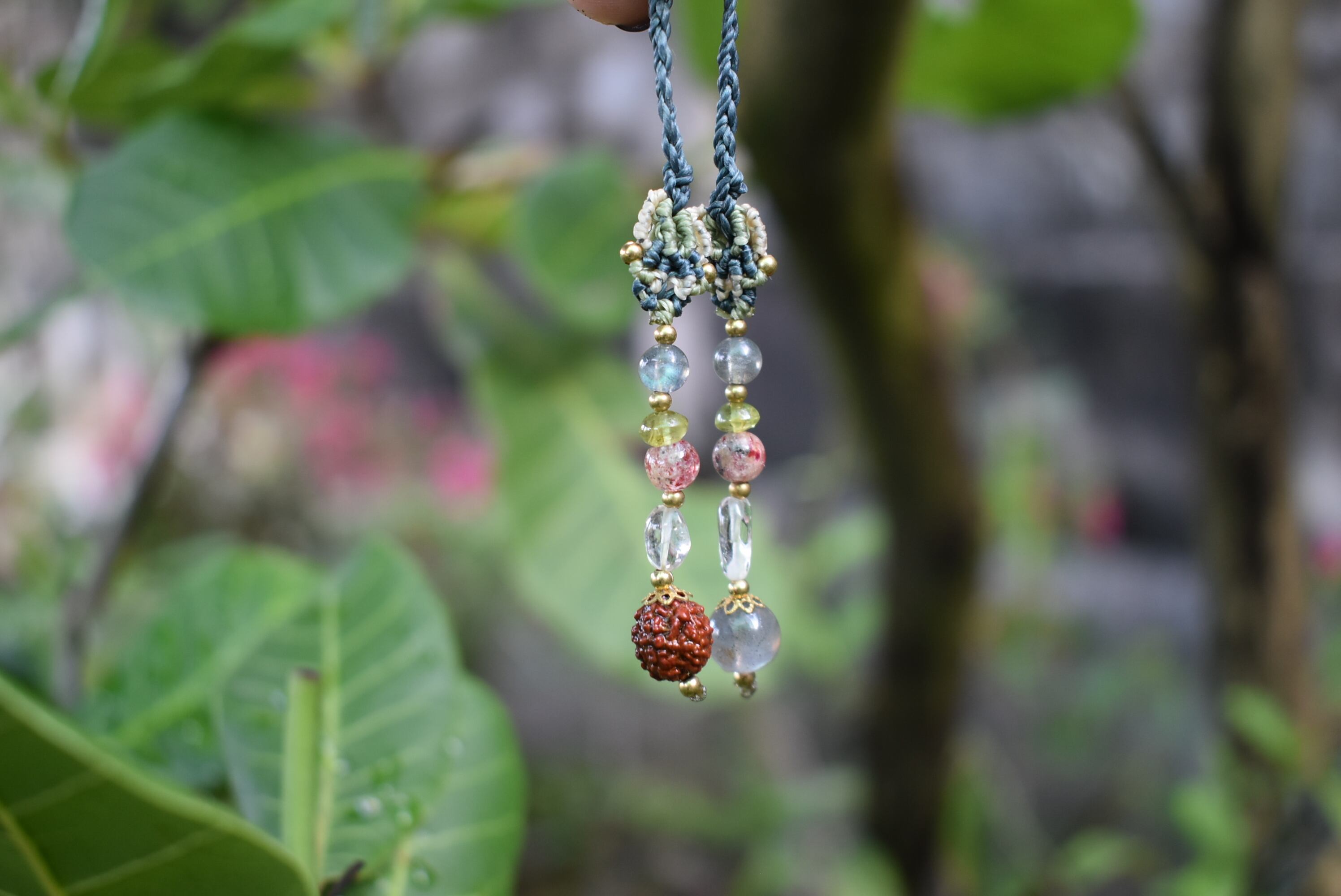 ◆このたびはナチュラル、ピーコックグリーン、差し色としてピスタチオの3色の蝋引き糸を使用しマクラメ編み装飾を施しました。
