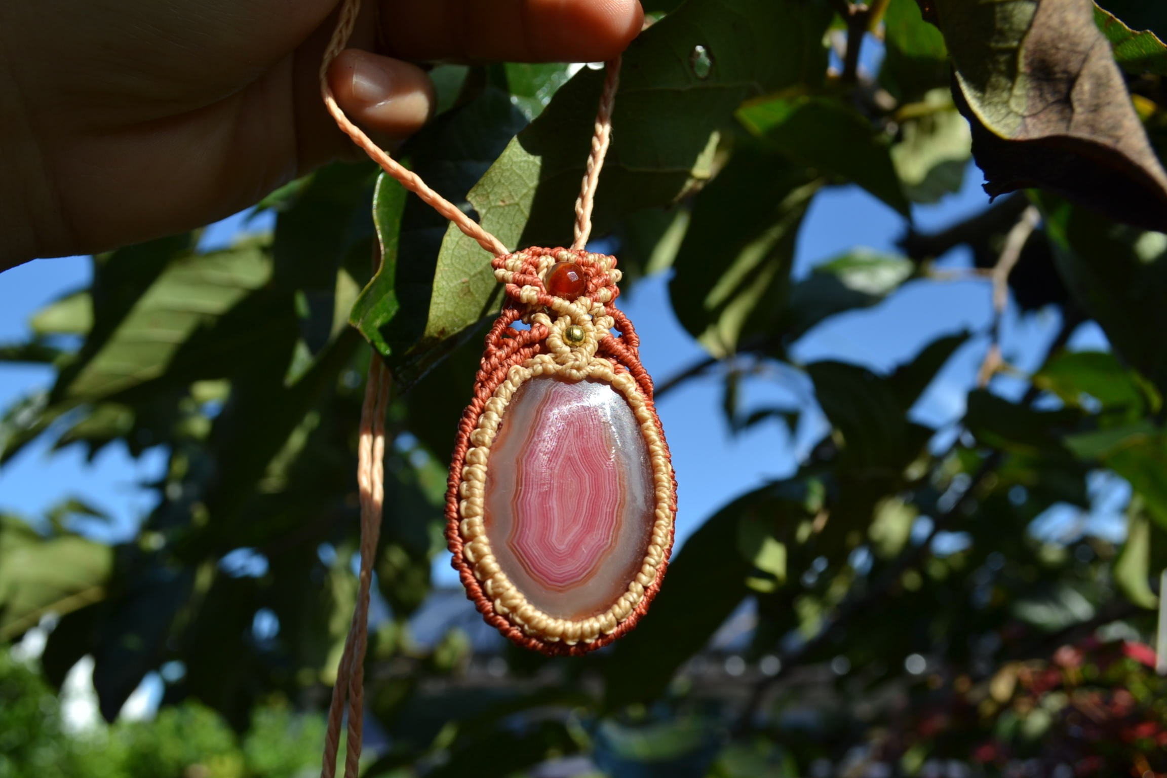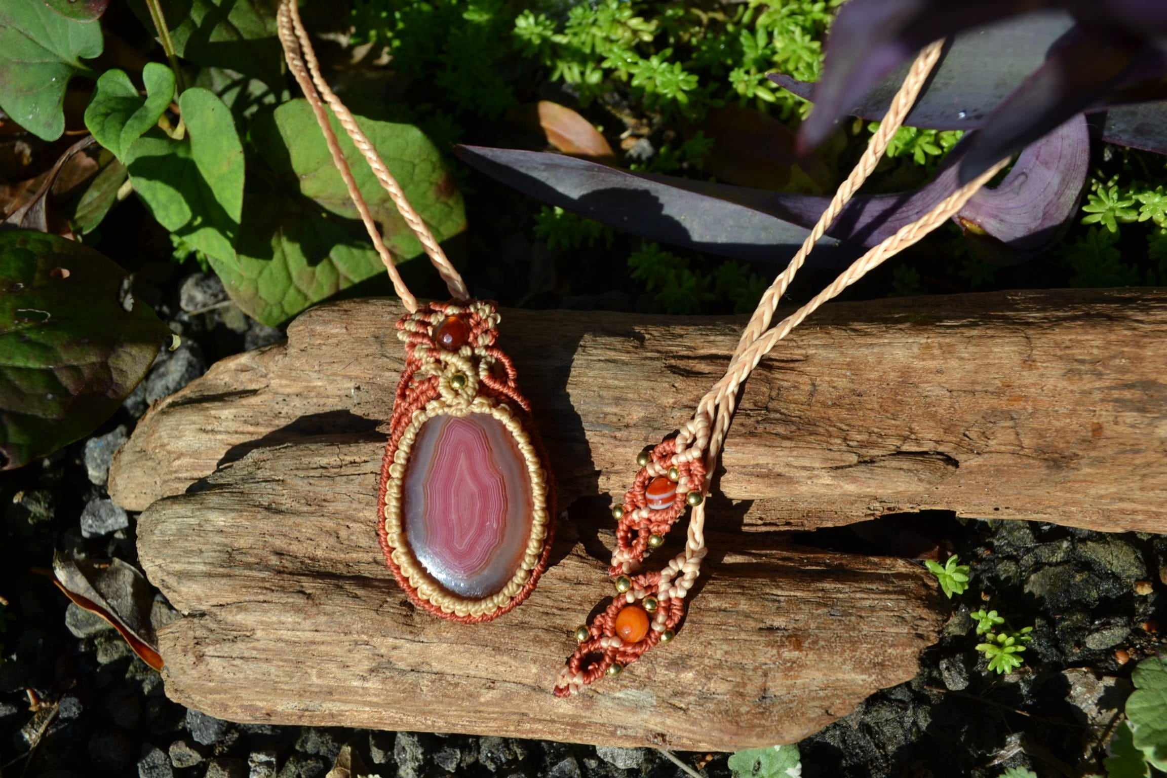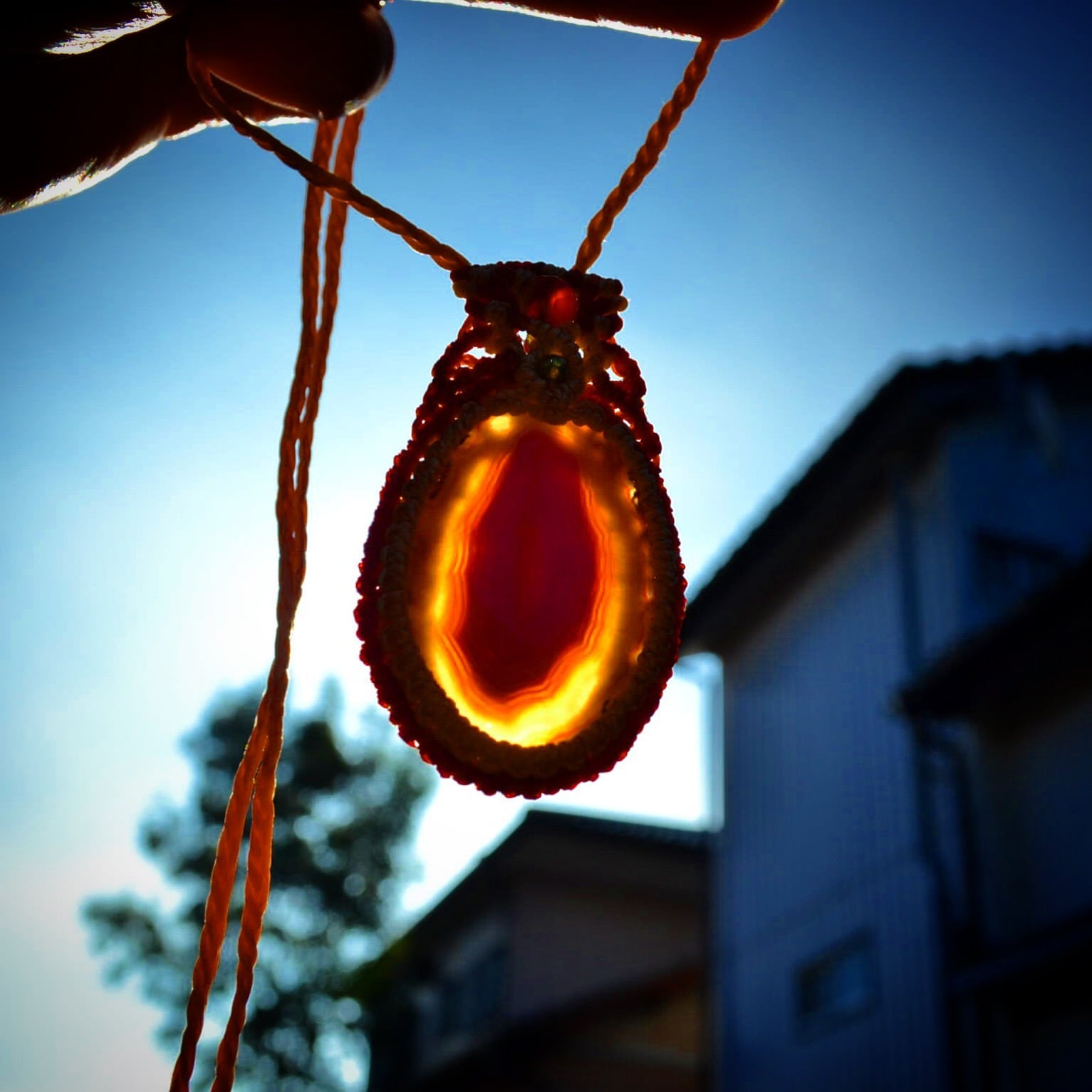 この度のアゲードジオードは自然光に照らすと美しい色彩を放ってくれる石でもあり、そのままでも自然のアートが織りだす模様は神々しいほどに芸術的な模様を見る事ができるアゲートペンダントと言えます。朱色とベージュ、2色の蝋引き糸を組み合わせ、大胆かつ、ポップな雰囲気のネックレスをマクラメ編み装飾して仕上げました。胸元を優しく素敵に彩り、幅広い年齢の方にお使いいただけるペンダントになります。