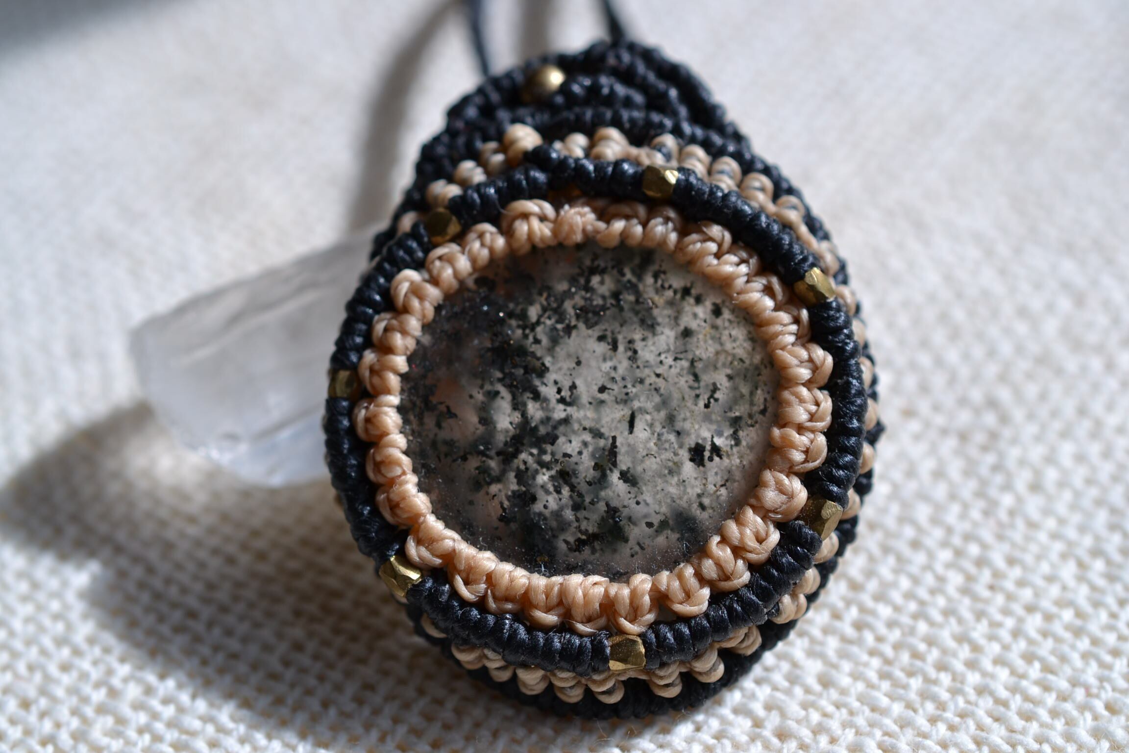 この度は石の個性を尊重し、黒とリネンカラーの蝋引き糸を使用し、洗練された和風モダンテイストを取り入れてみました。