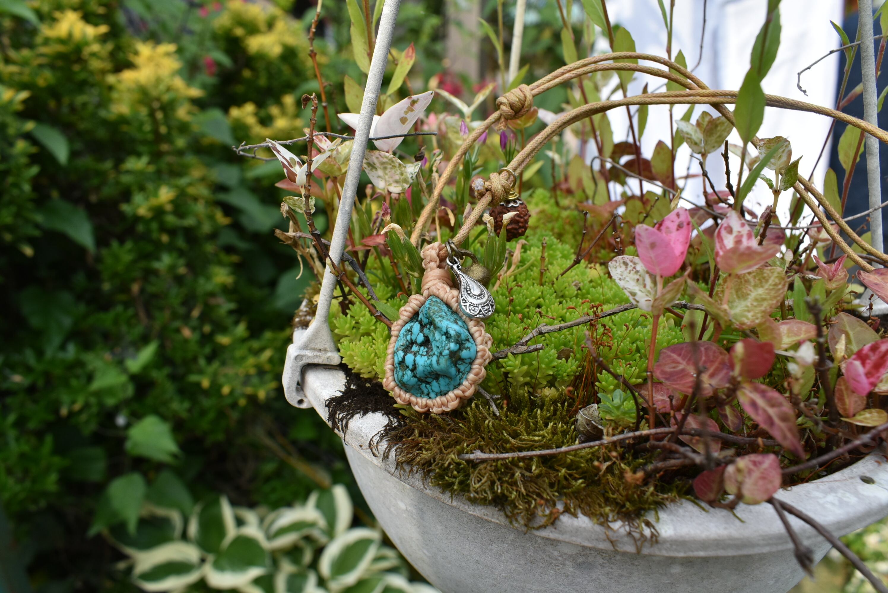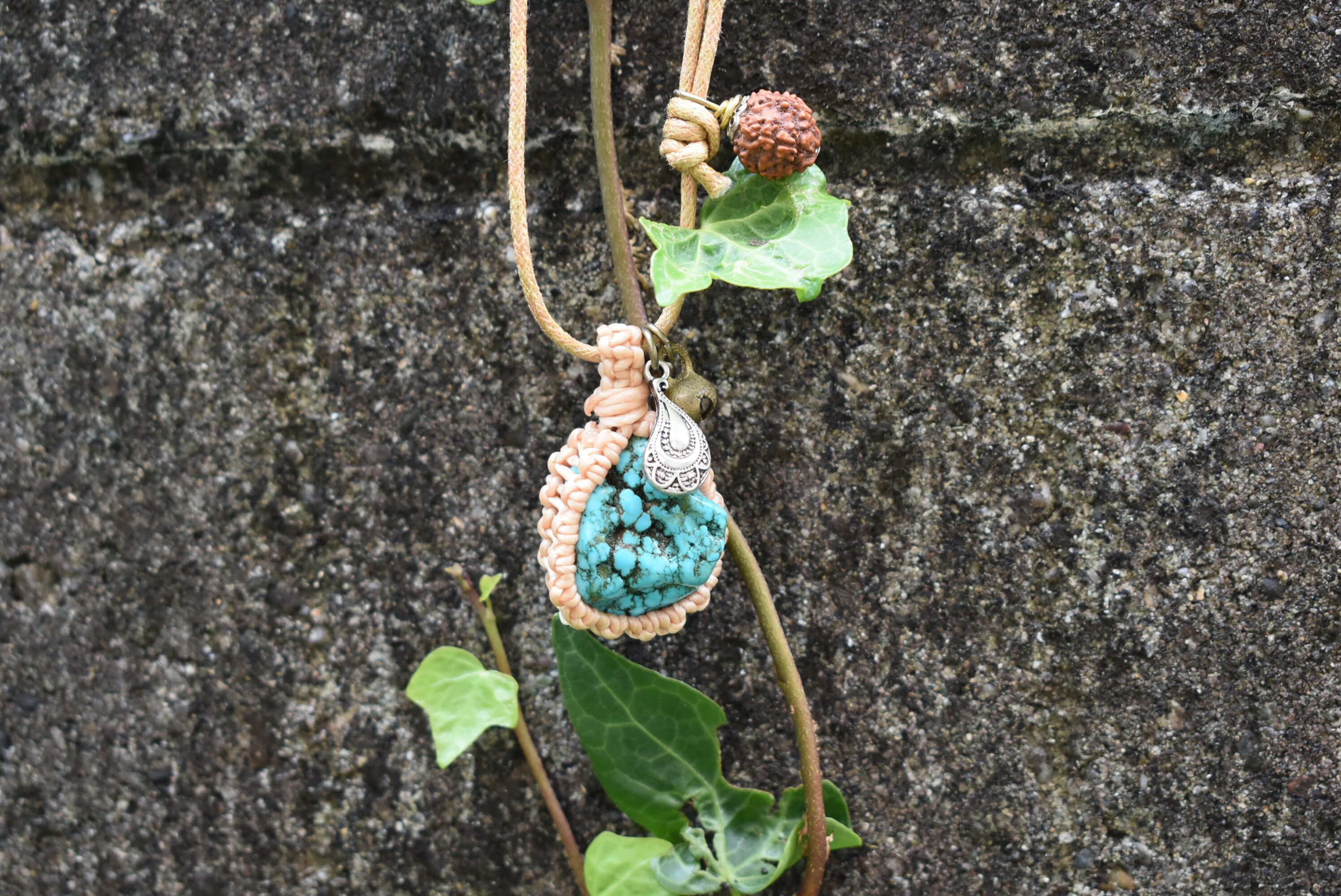 鮮やかなターコイズストーンをシンプルにマクラメペンダントに仕上げ、エスニック涙型パーツと幸福を呼び寄せると言われている実、菩提樹の実(ルドラクシャ)をパーツなどを合わせたシンプルペンダント。
