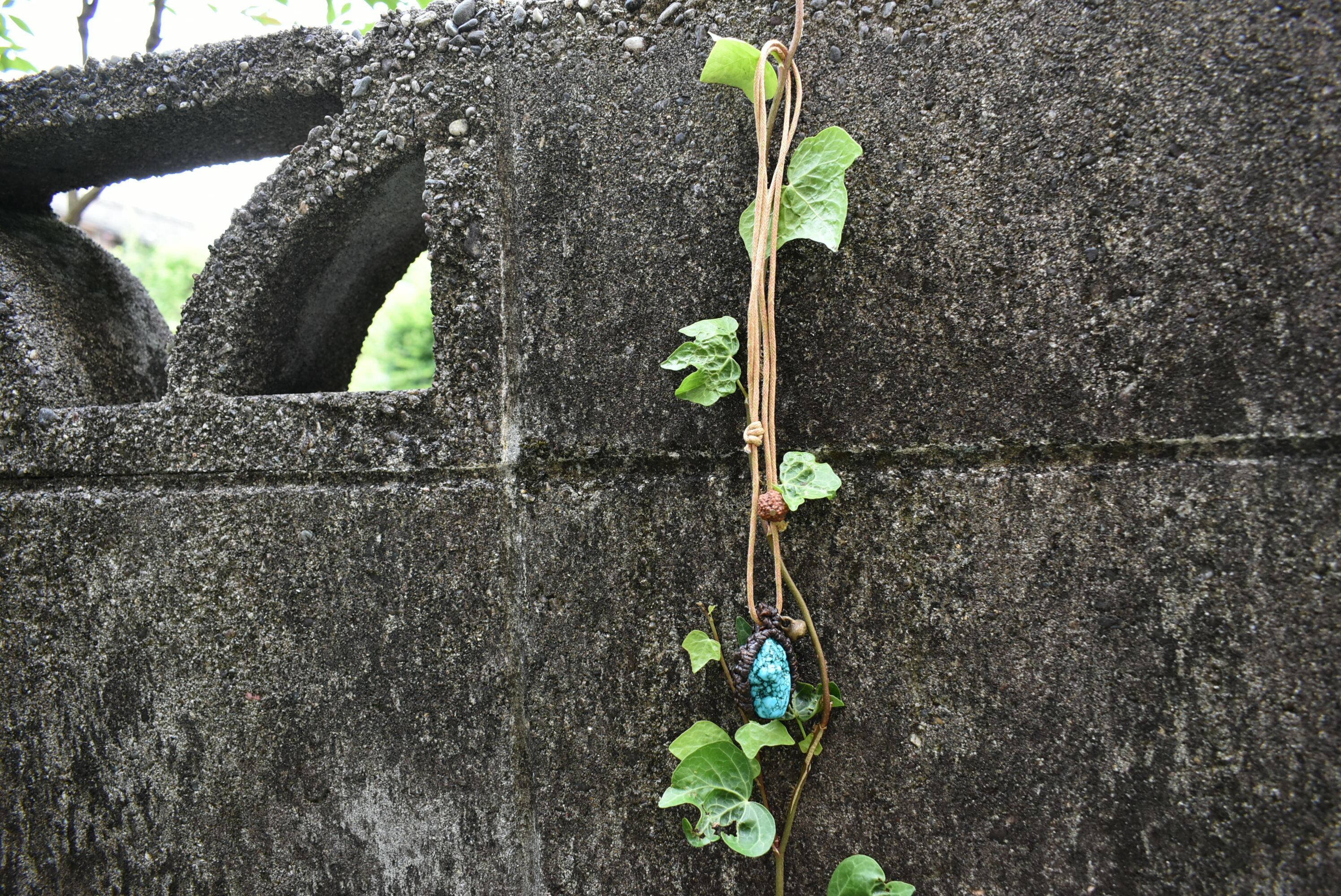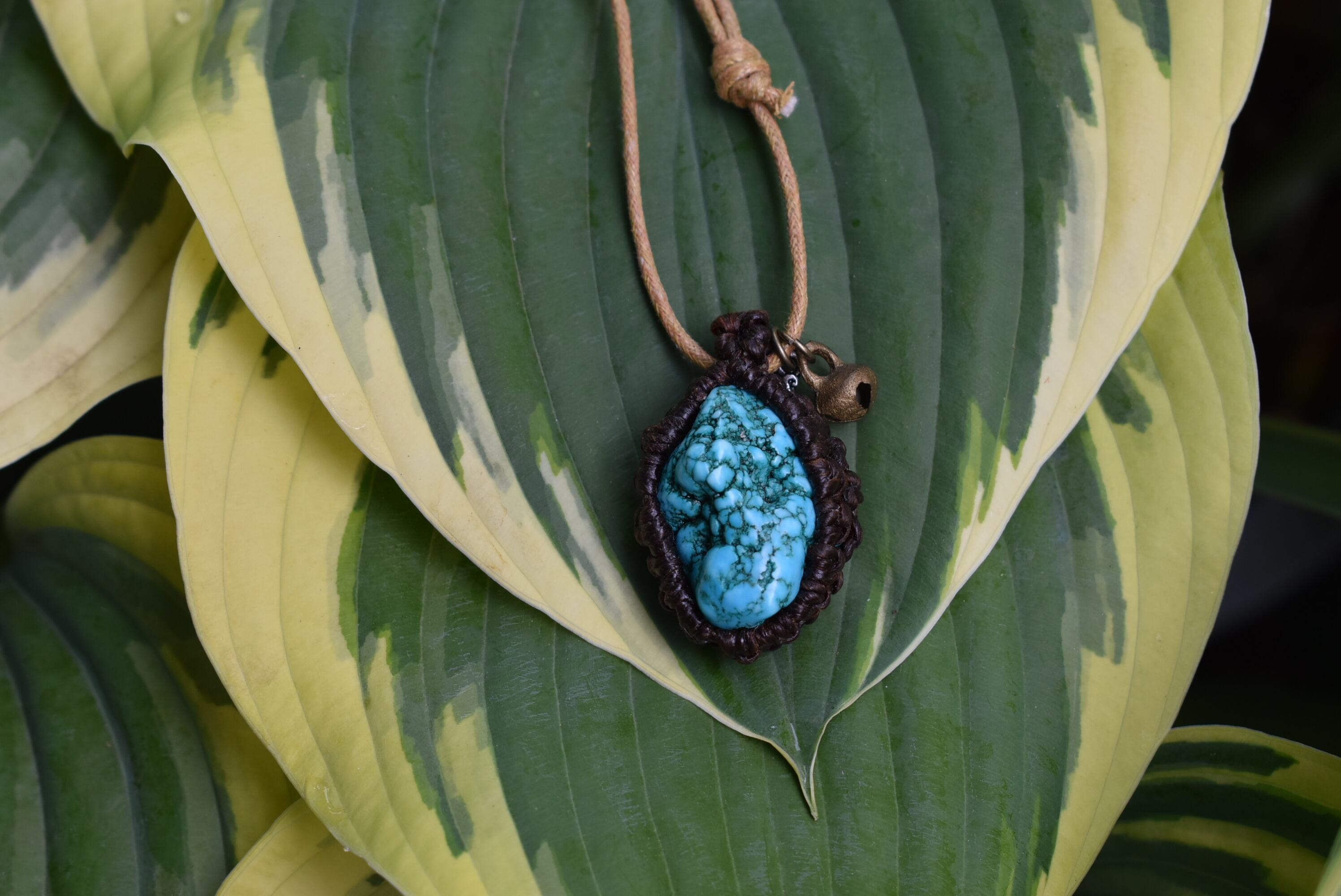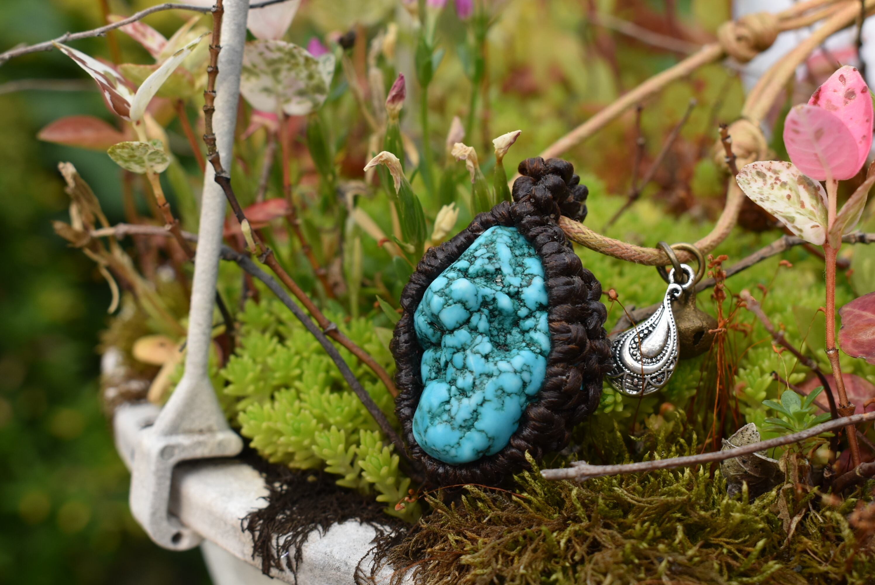 鮮やかなターコイズストーンをシンプルにマクラメペンダントに仕上げ、エスニック涙型パーツと幸福を呼び寄せると言われている実、菩提樹の実(ルドラクシャ)をパーツなどを合わせたシンプルペンダント。