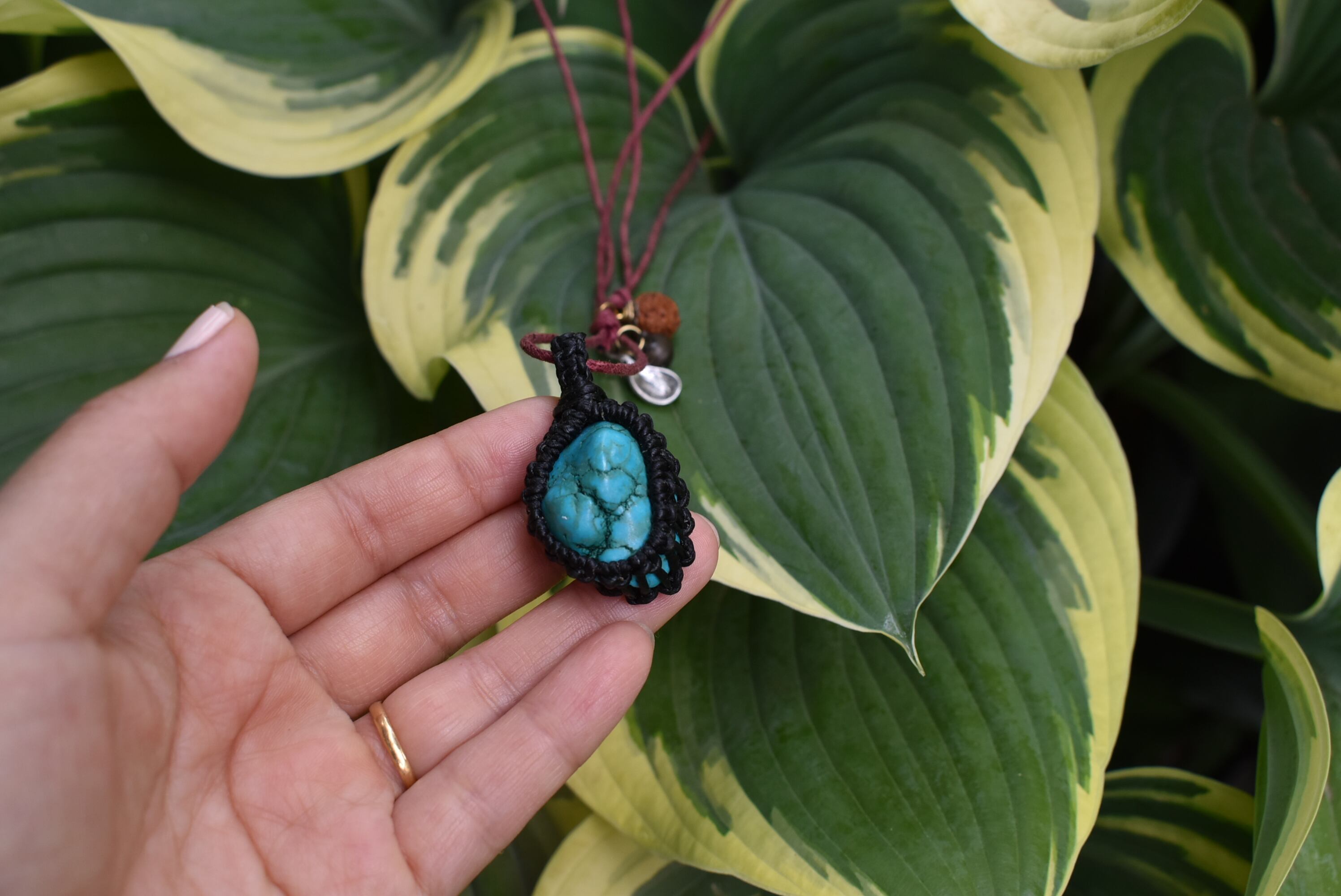 鮮やかなターコイズストーンをシンプルにマクラメペンダントに仕上げ、エスニック涙型パーツと幸福を呼び寄せると言われている実、菩提樹の実(ルドラクシャ)をパーツなどを合わせたシンプルペンダント。