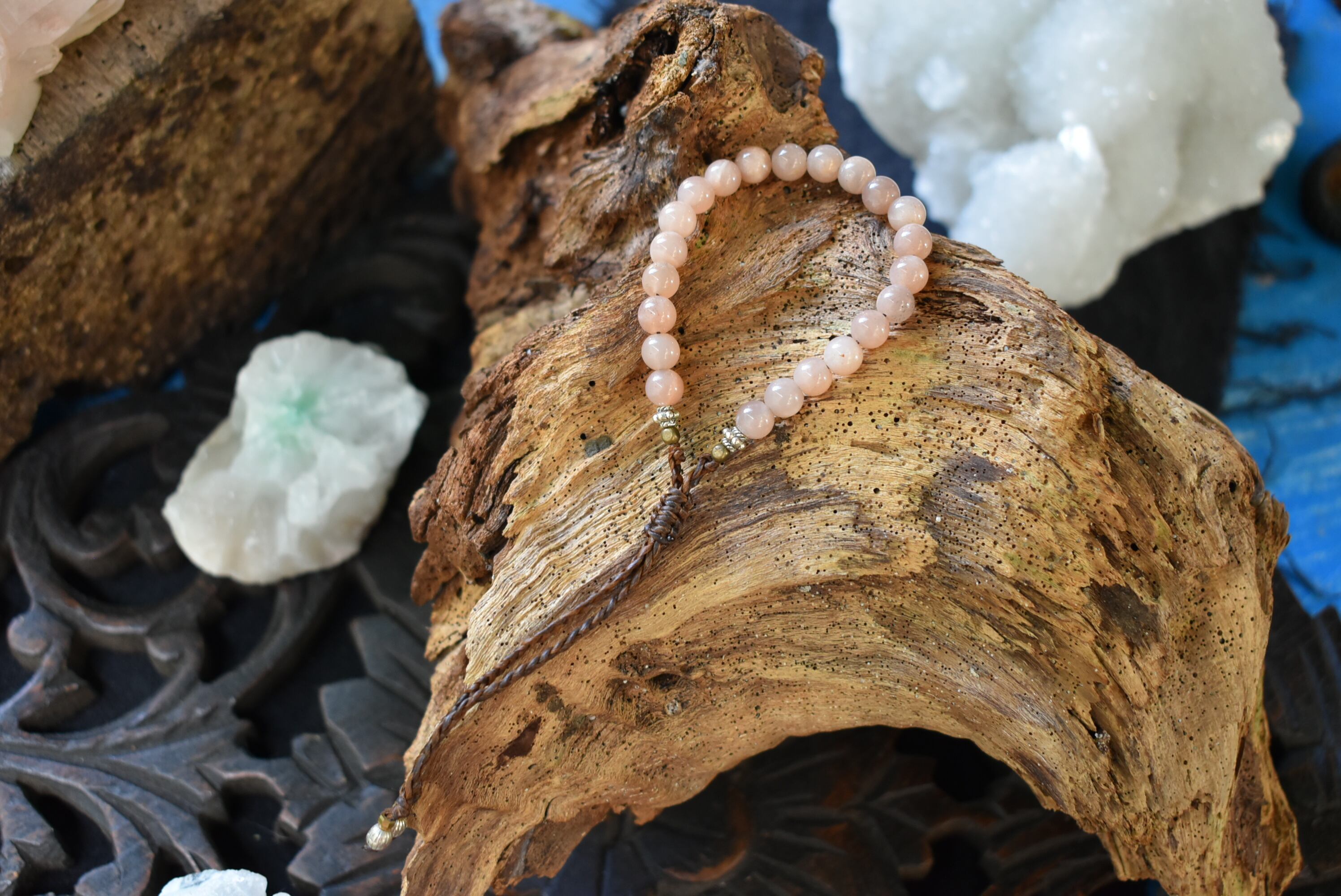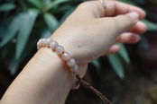 ピンクムーンストーンビーズはチョコレートムーンストーンとも呼ばれており、ちょっぴりピンク色の石の中からキラキラとシラーが輝くことから、昔から女性に親しまれてきた天然石です。やわらかいイメージで優しく光る天然石です。