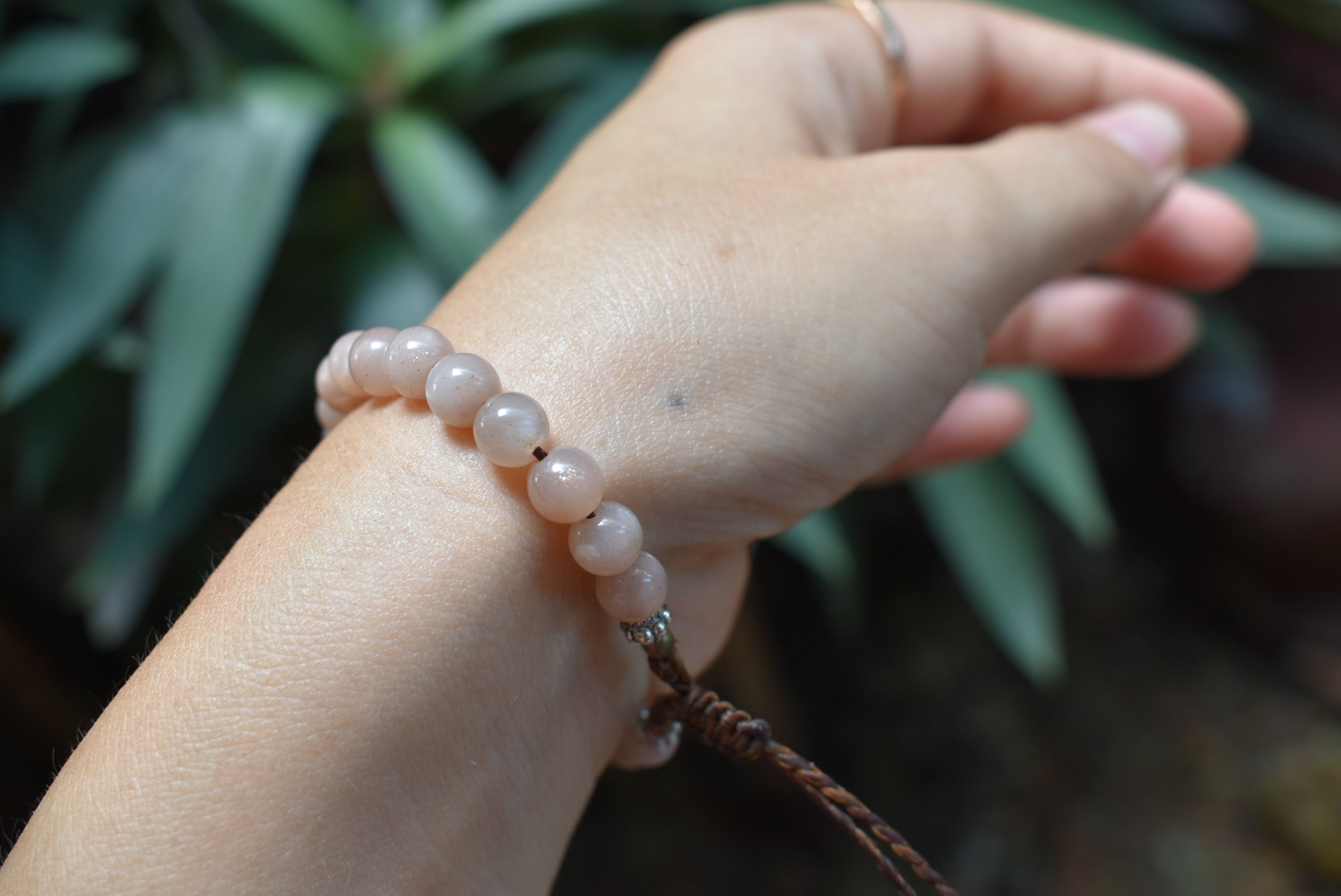 やわらかチョコ★高品質★ピンクムーンストーンビーズマクラメブレスレットA