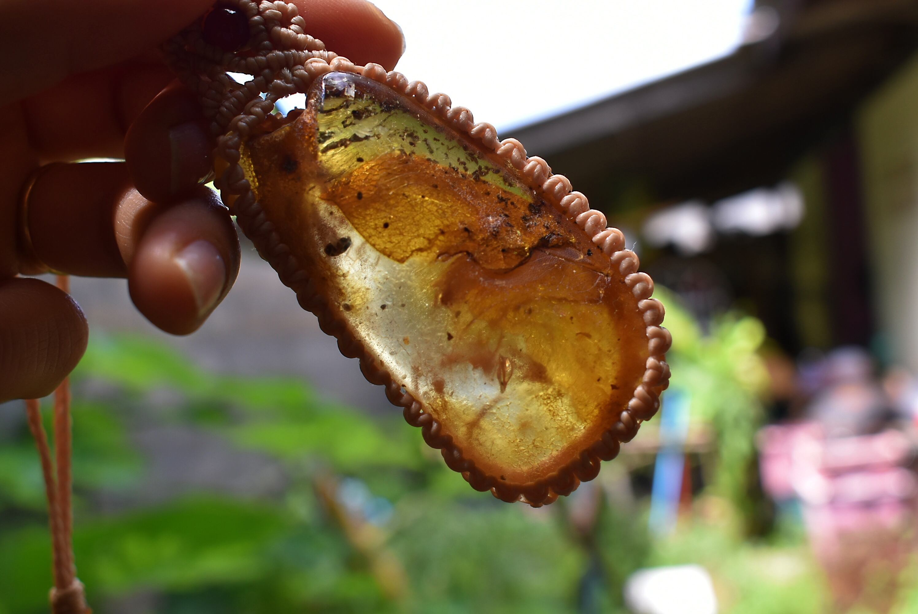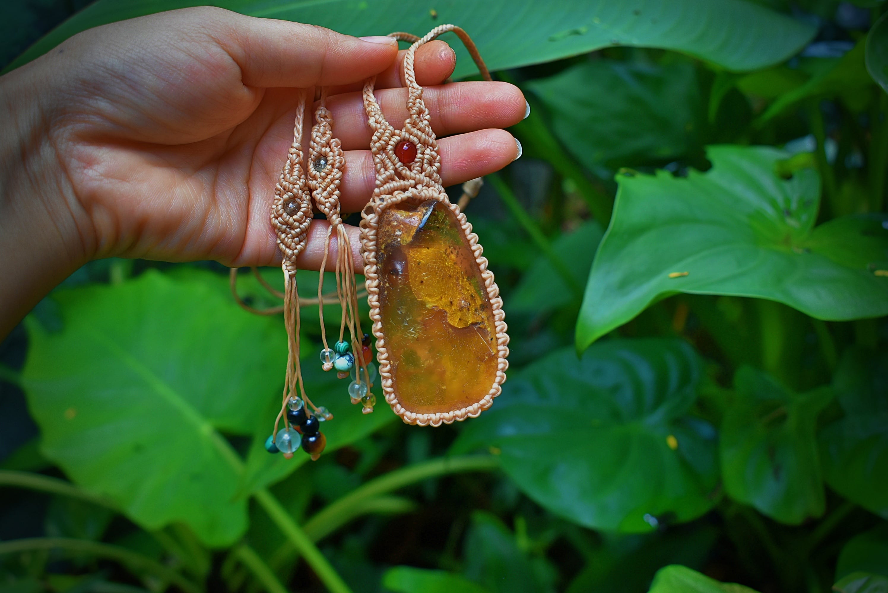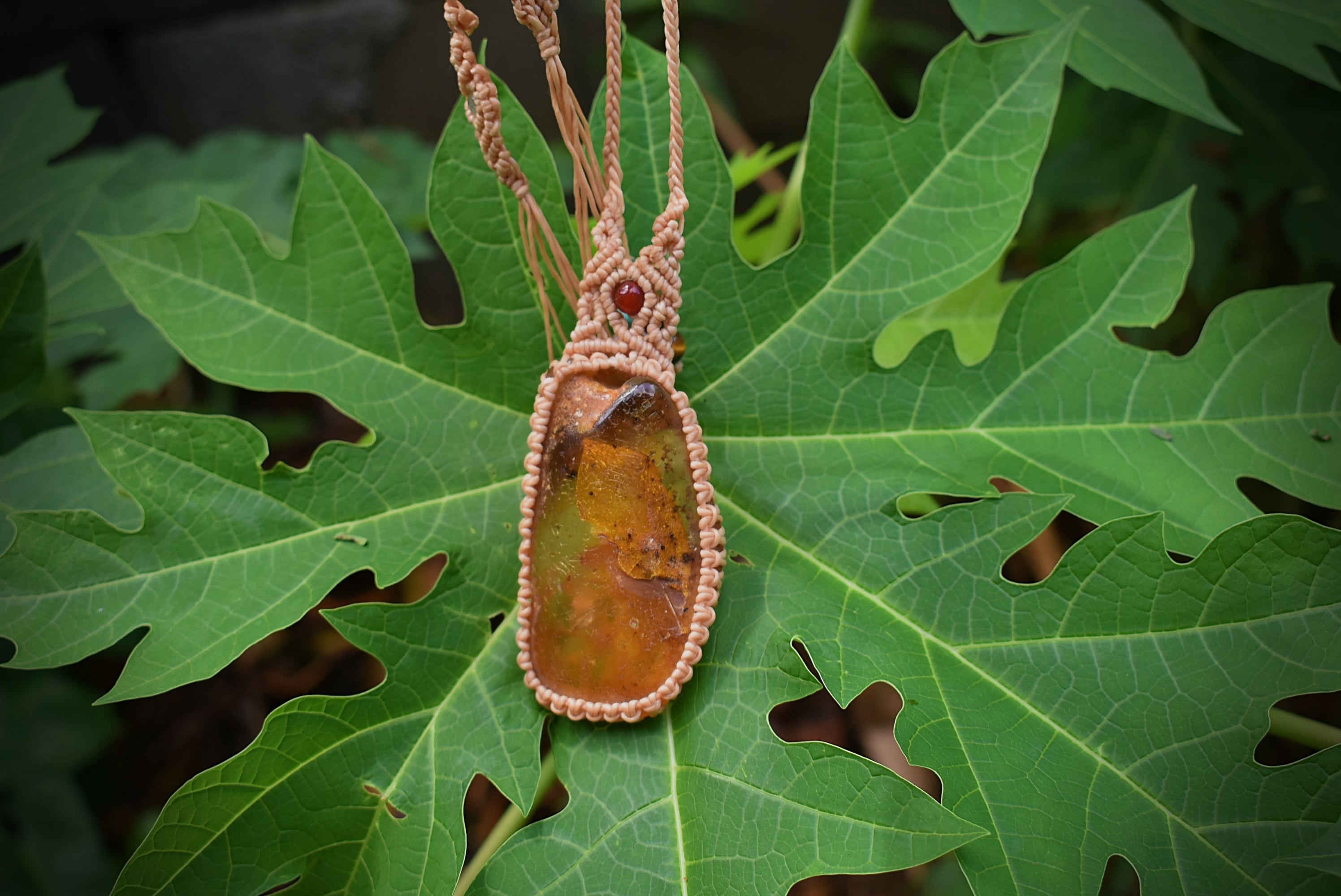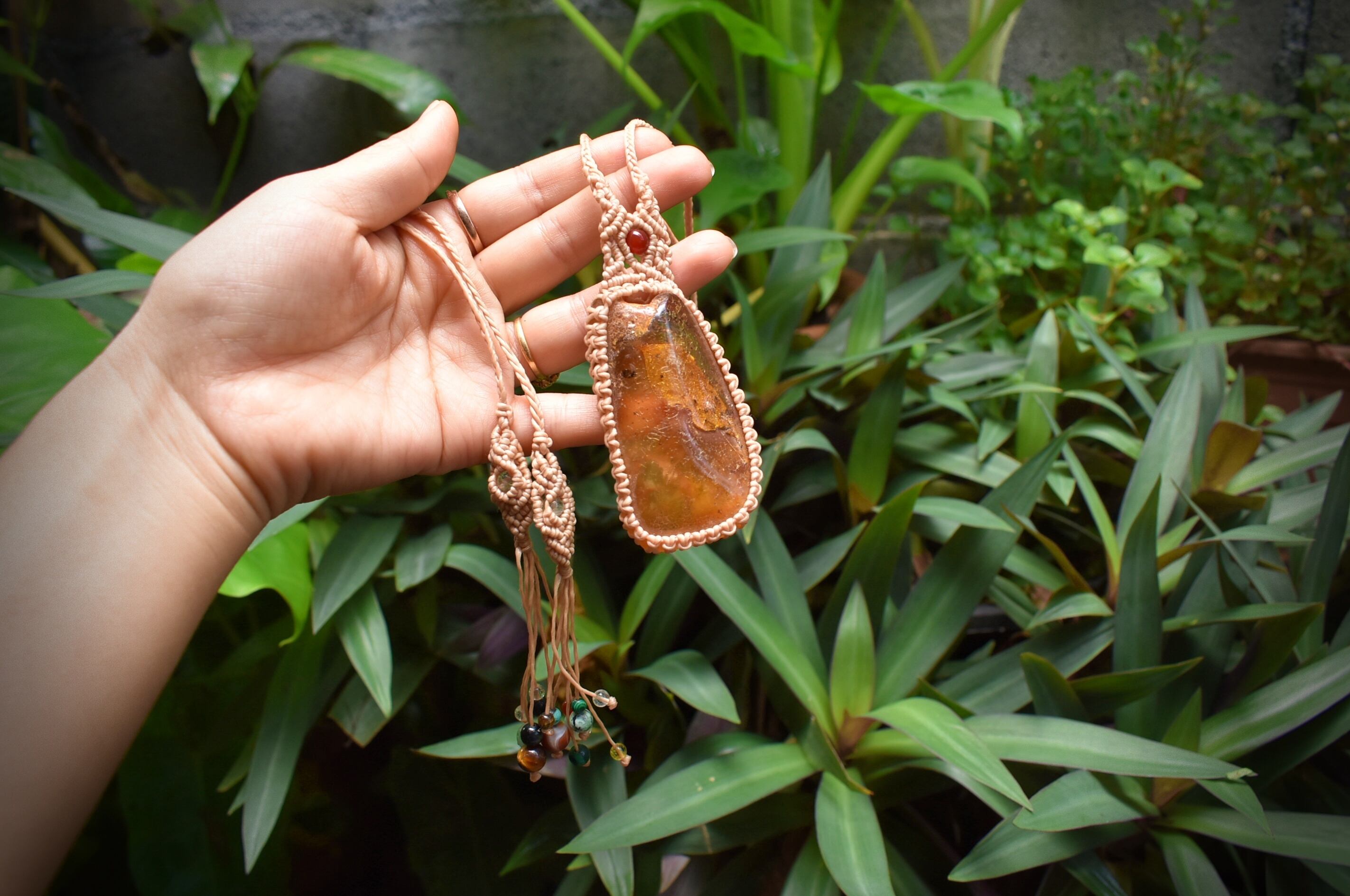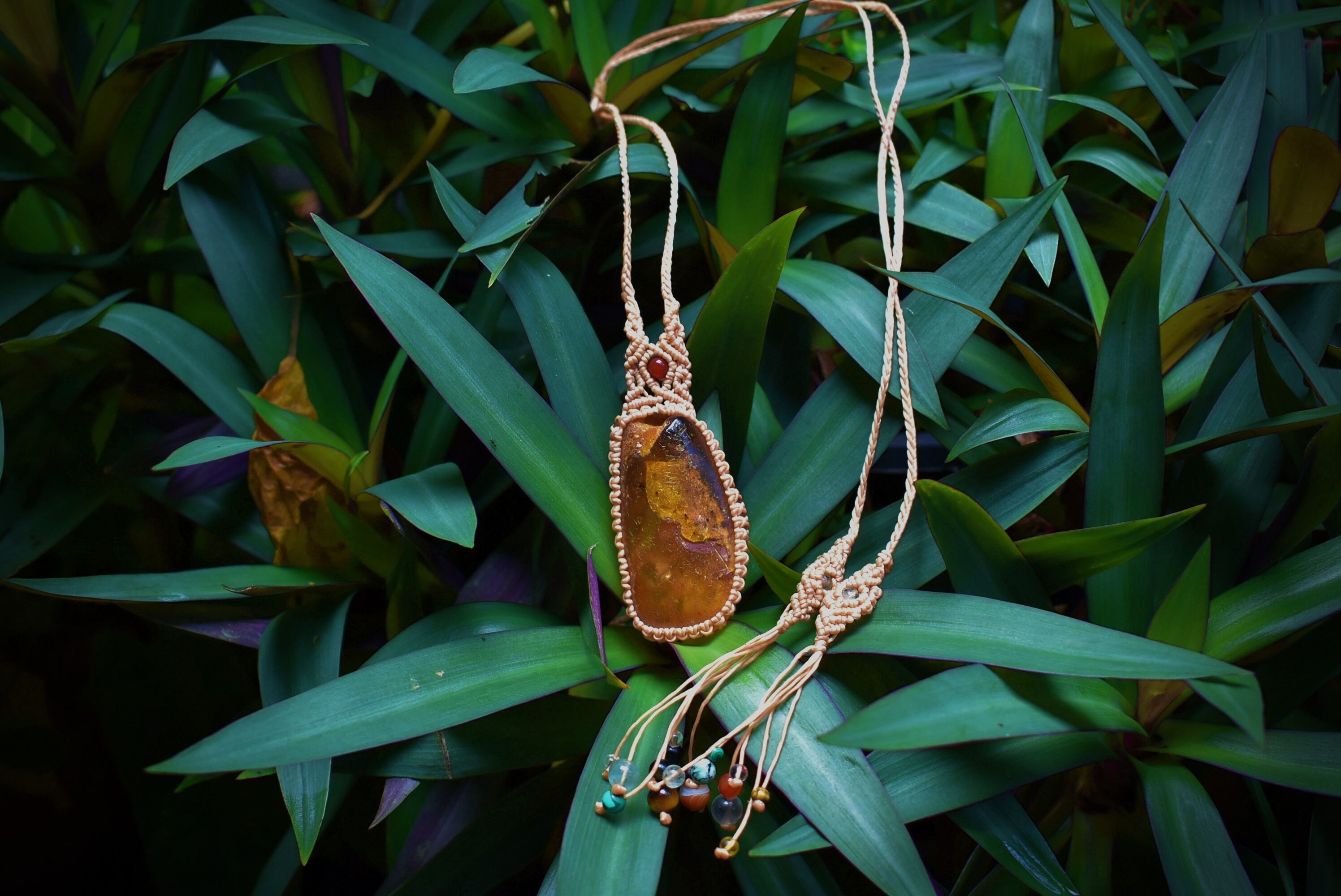 このアンバーを自然なまま蝋引き糸でマクラメ編み装飾を施して仕上げました。