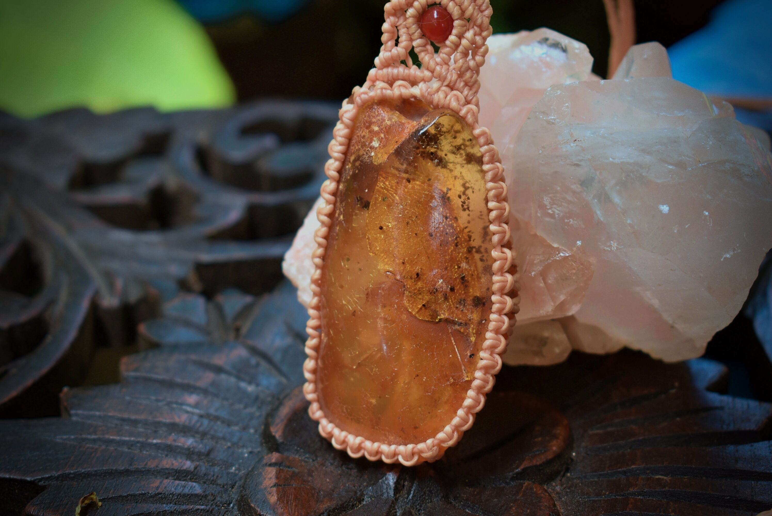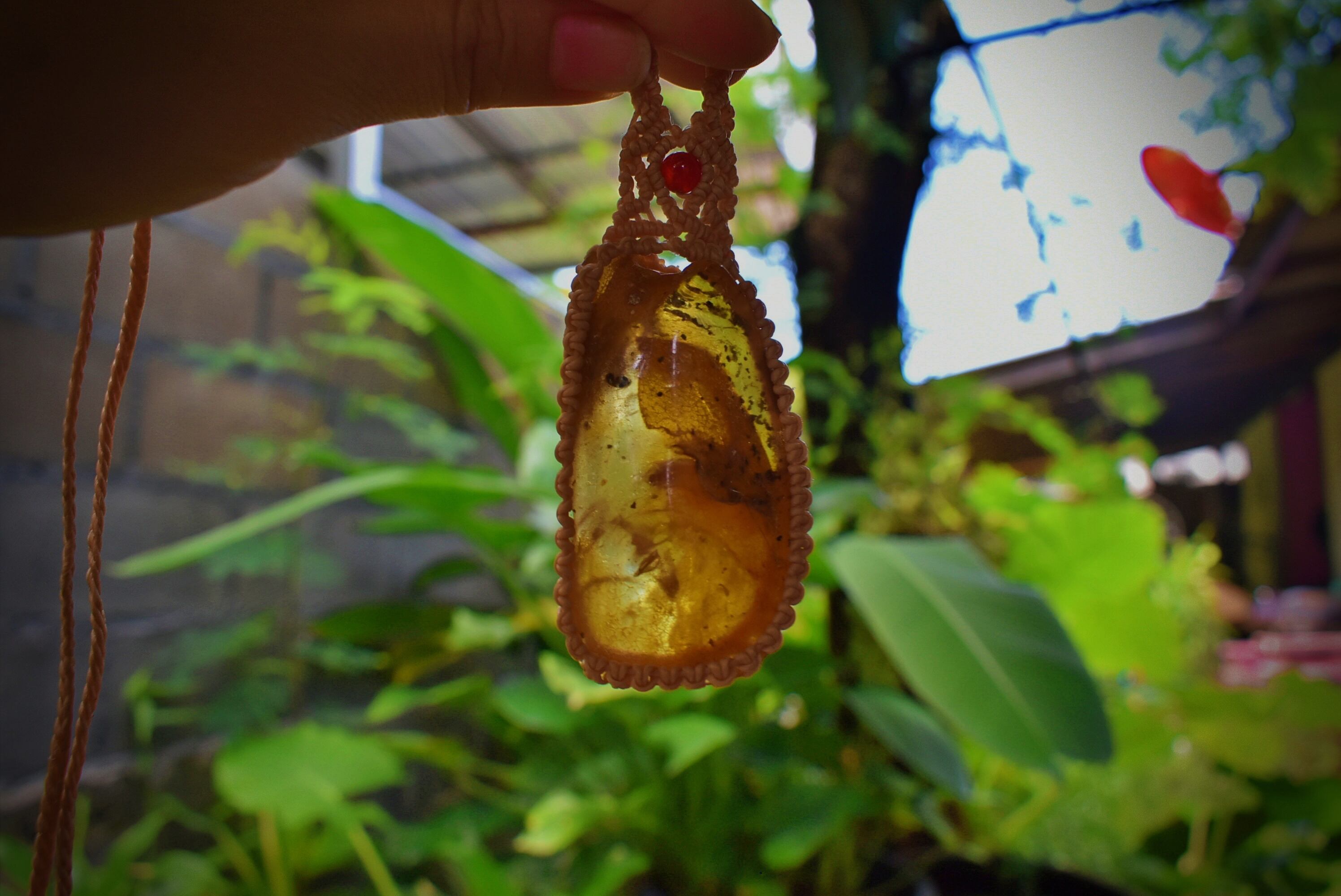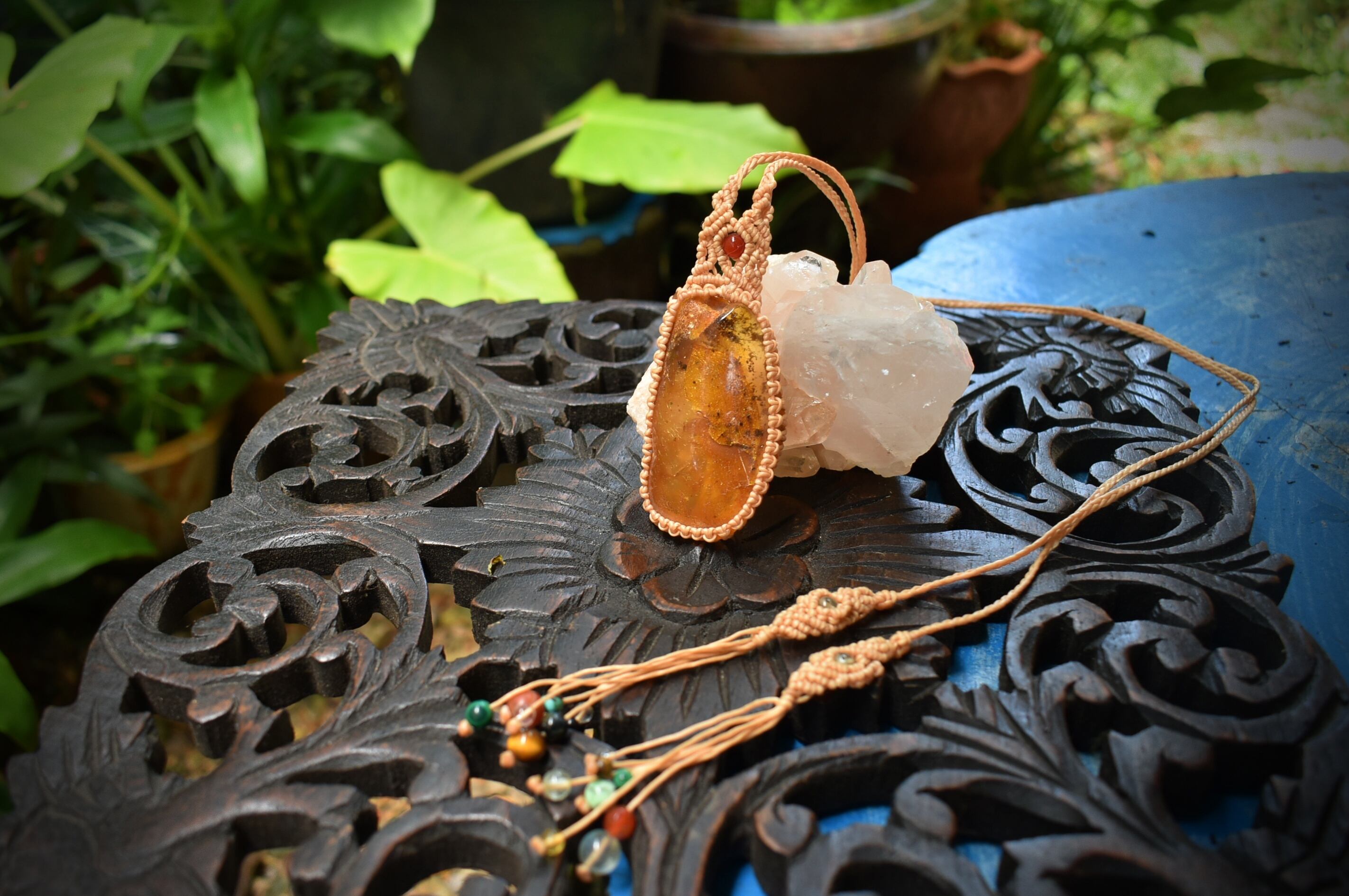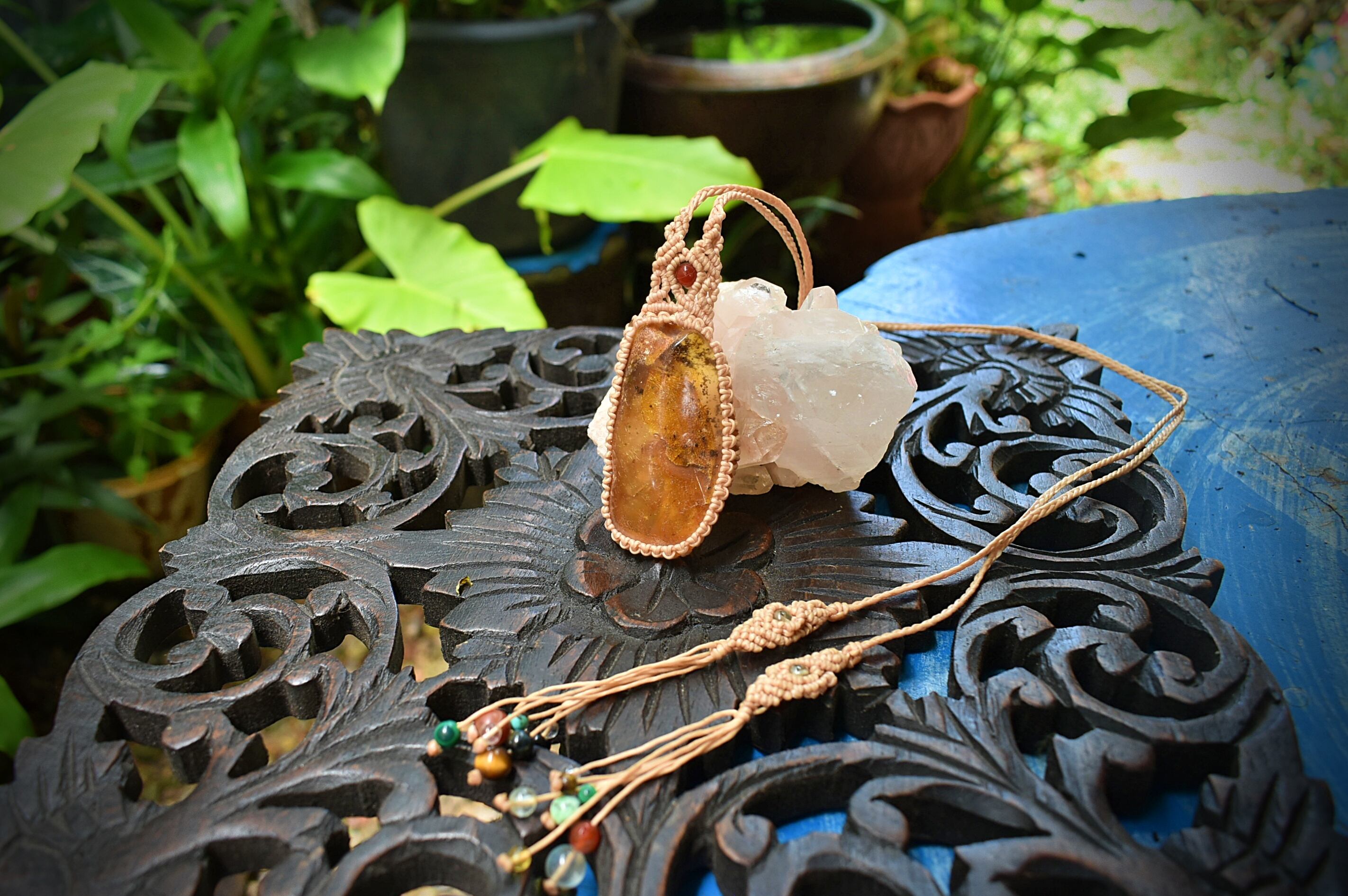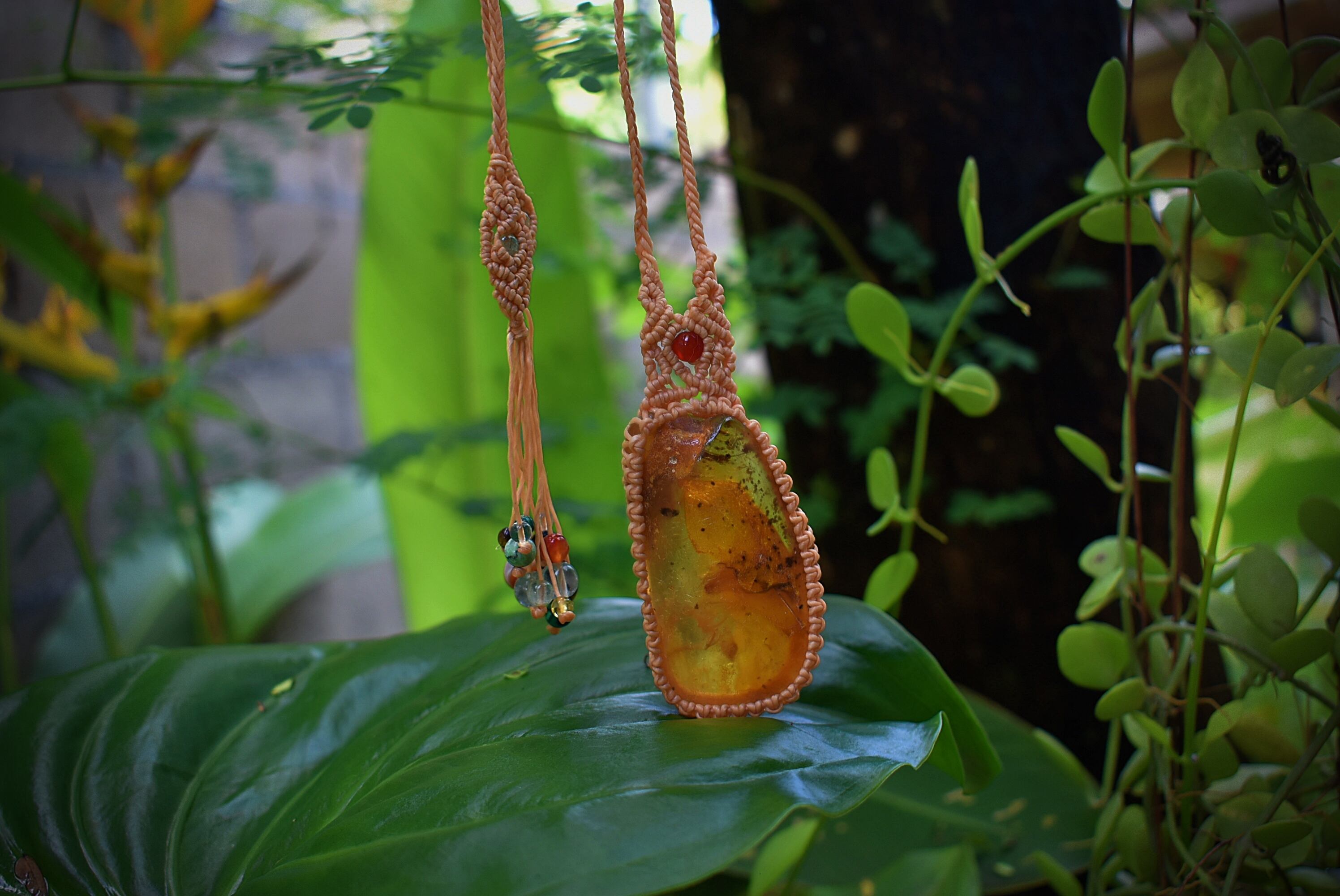 このアンバーを自然なまま蝋引き糸でマクラメ編み装飾を施して仕上げました。