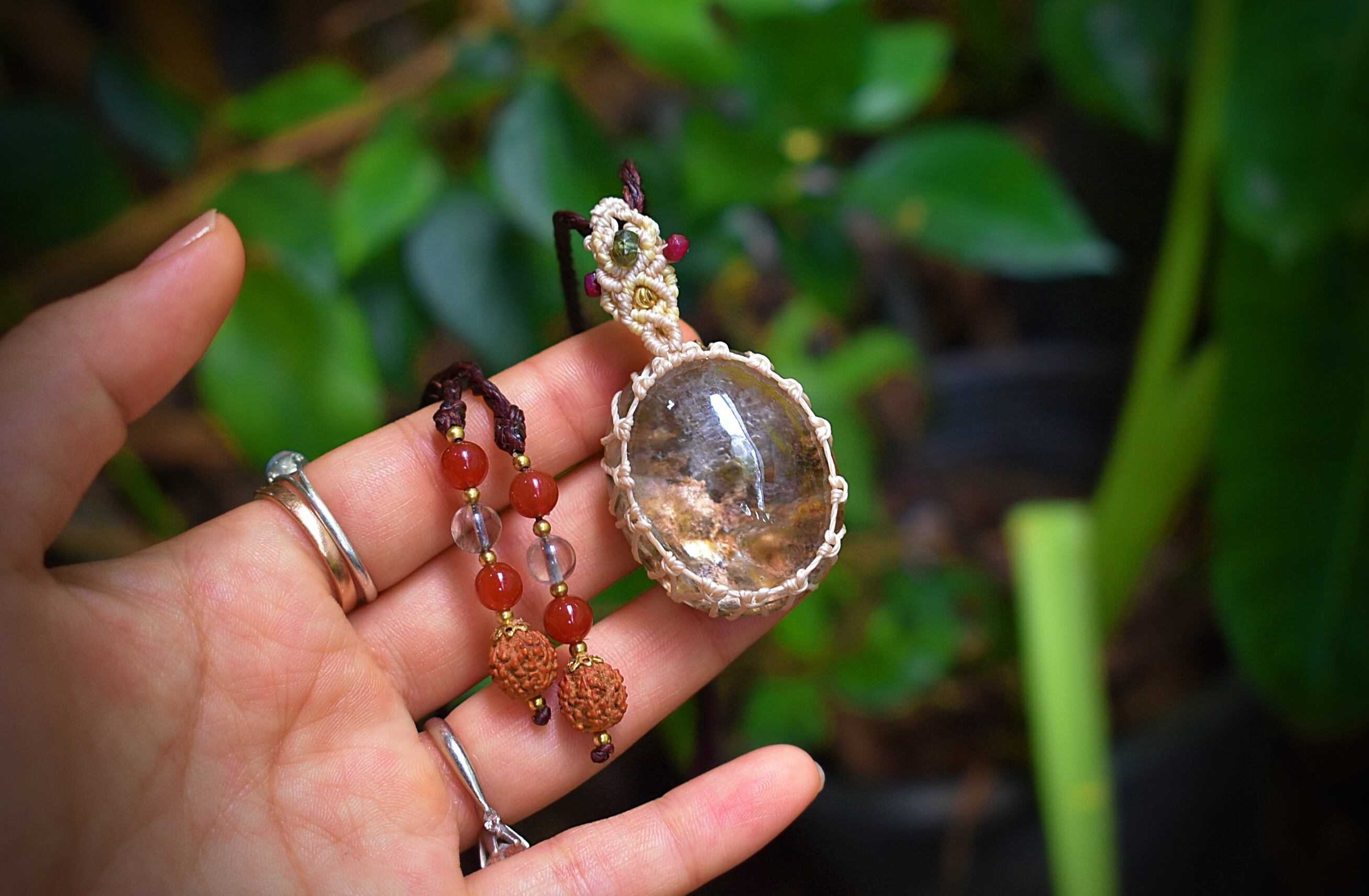 虹入り★自由な森と山★ガーデンとクォーツインクォーツ マクラメペンダント
