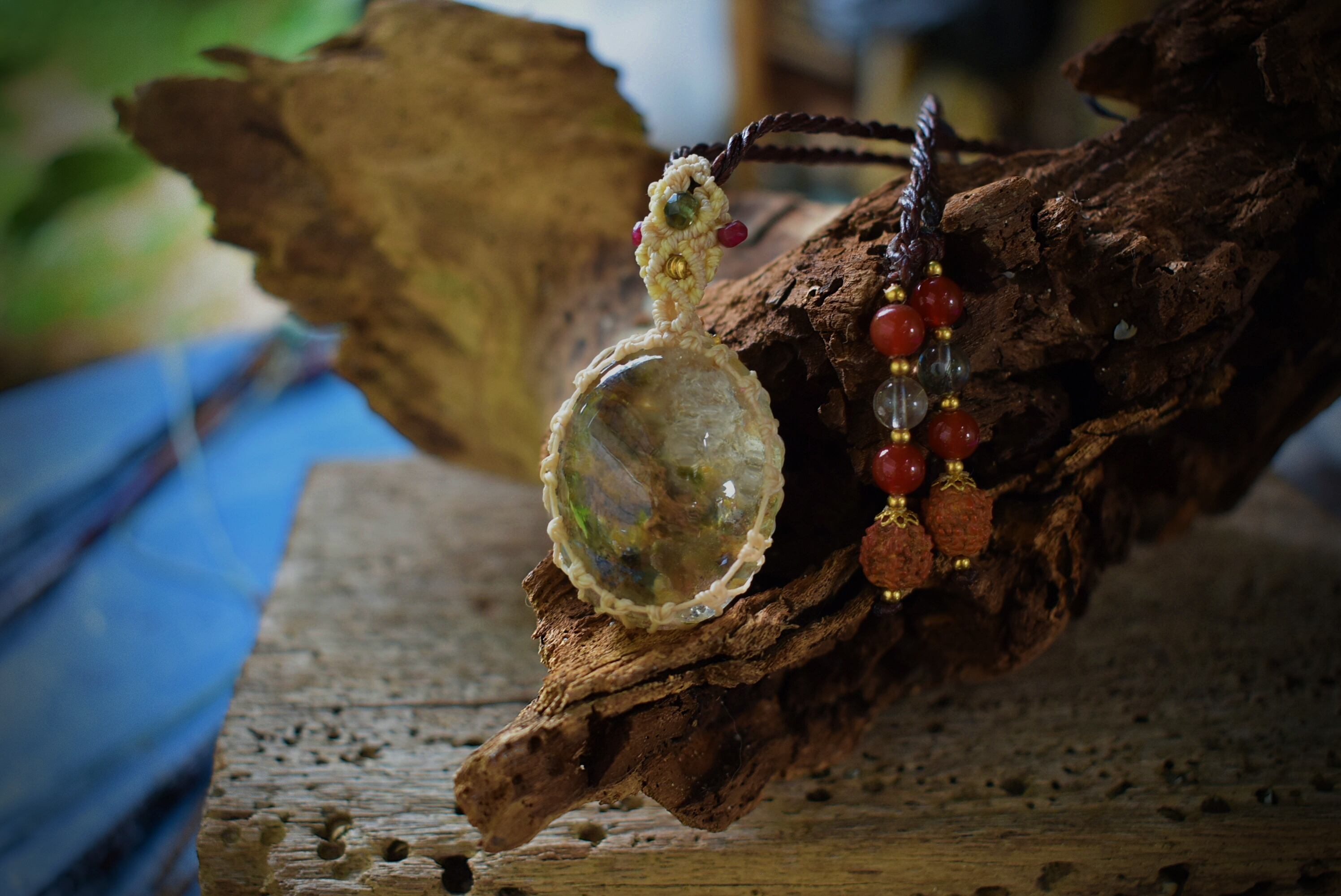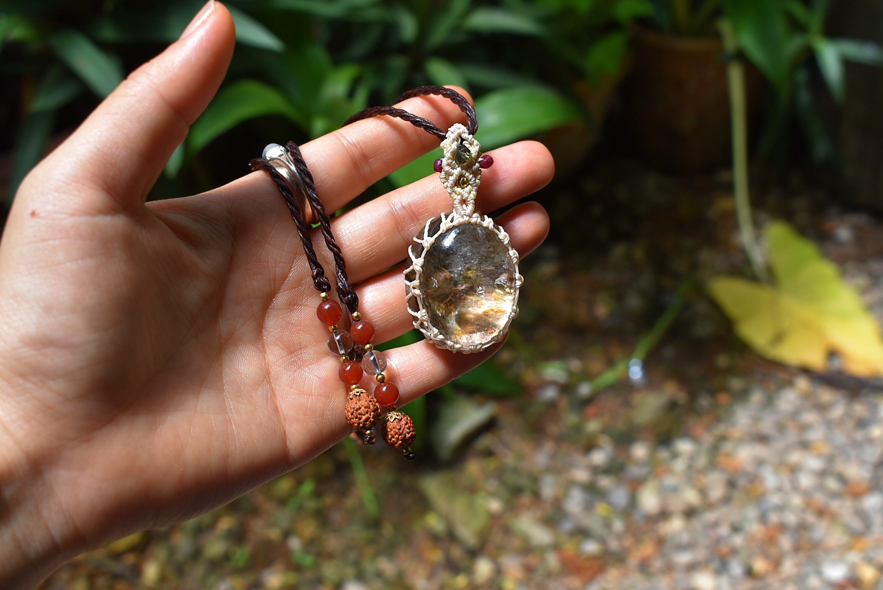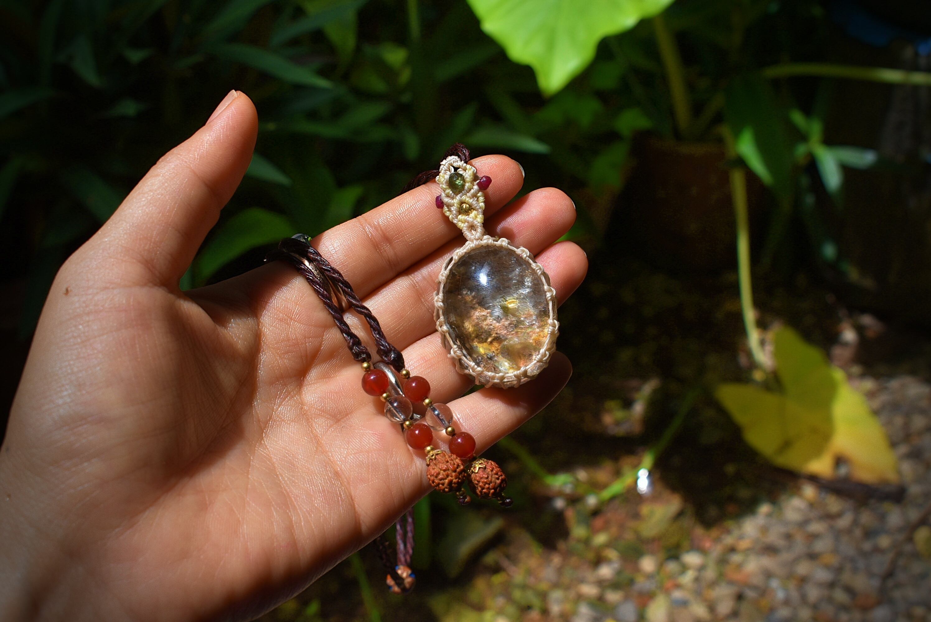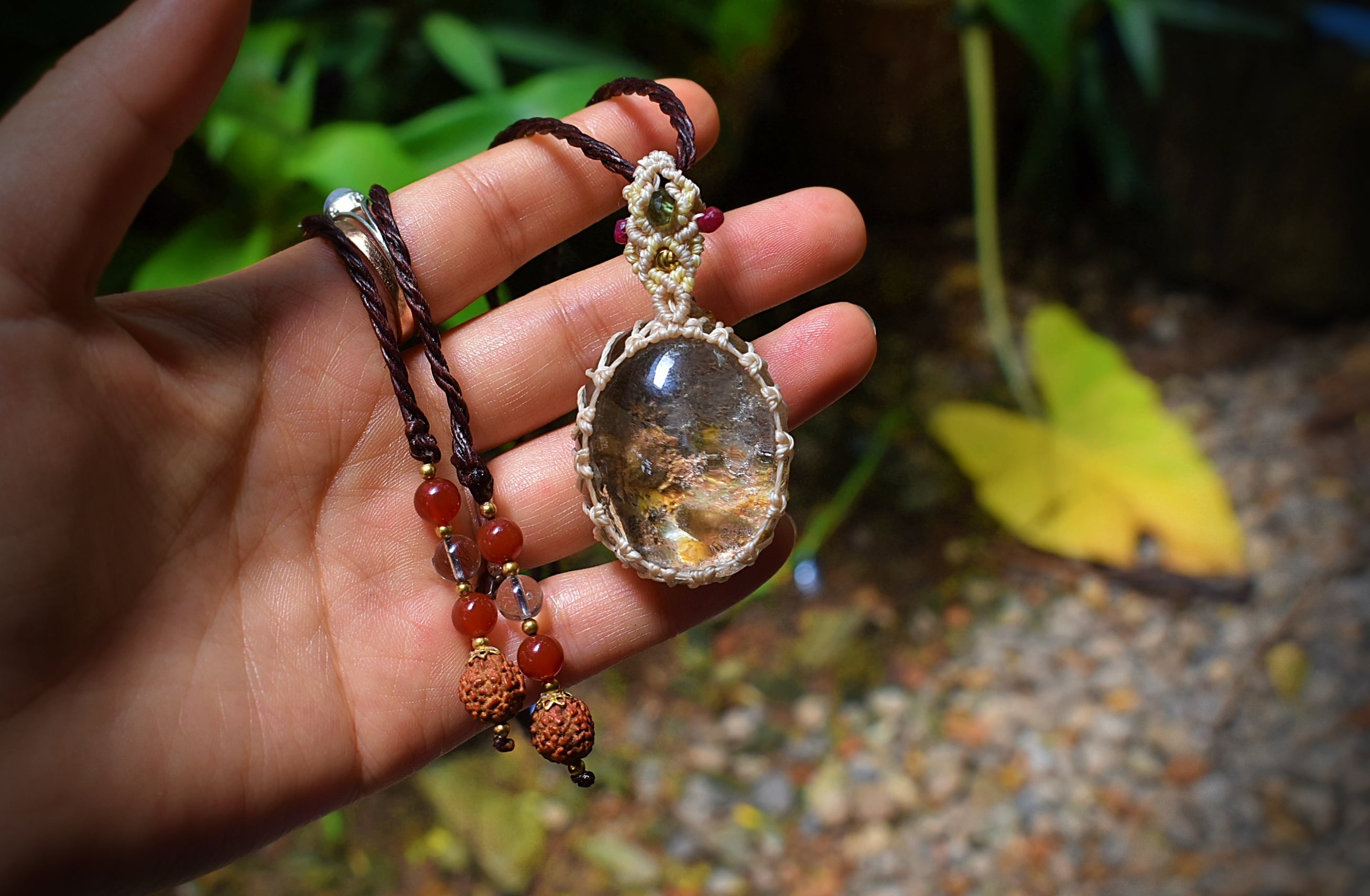 このたびのクォーツインクォーツ 、透明感ある水晶の中にしっかりとした色味とガーデンクォーツの庭、そしてその間にはインクルージョン。 高品質で見ごたえのあるルースストーンをペンダントに仕上げました。編み手法は石の世界を横側からも見て取れるように巻き込み。立体感を全て見てもらえるように包み込みました。