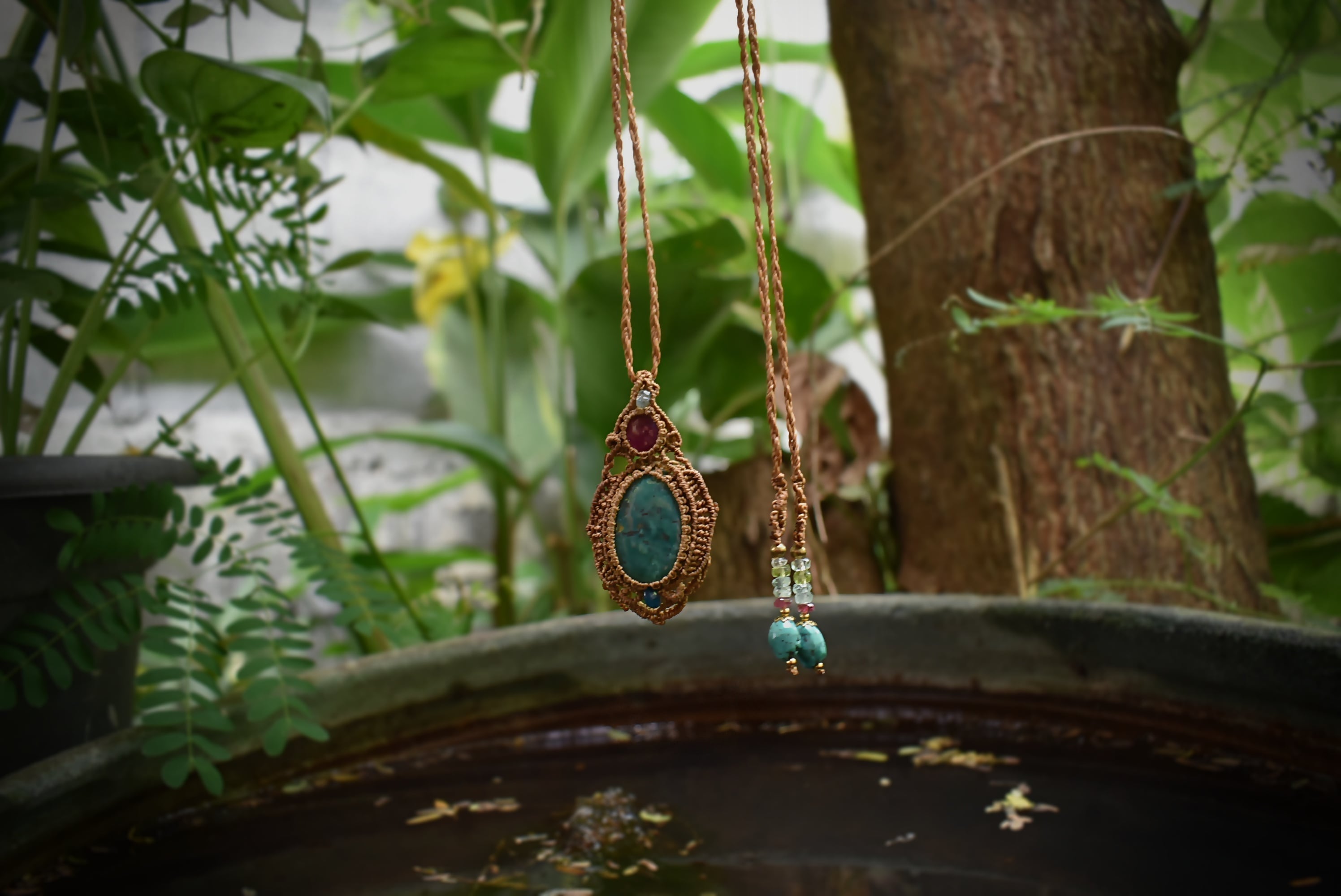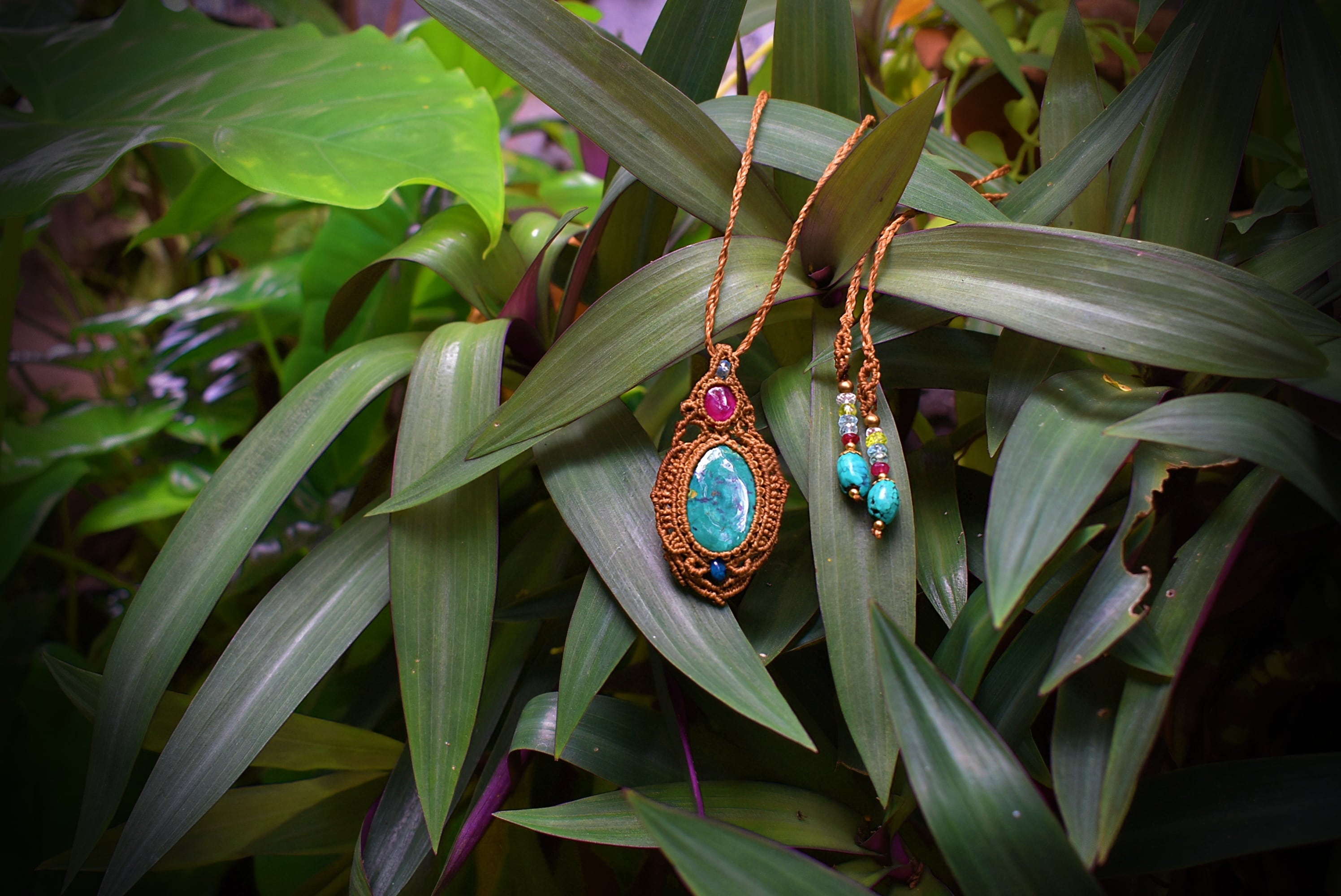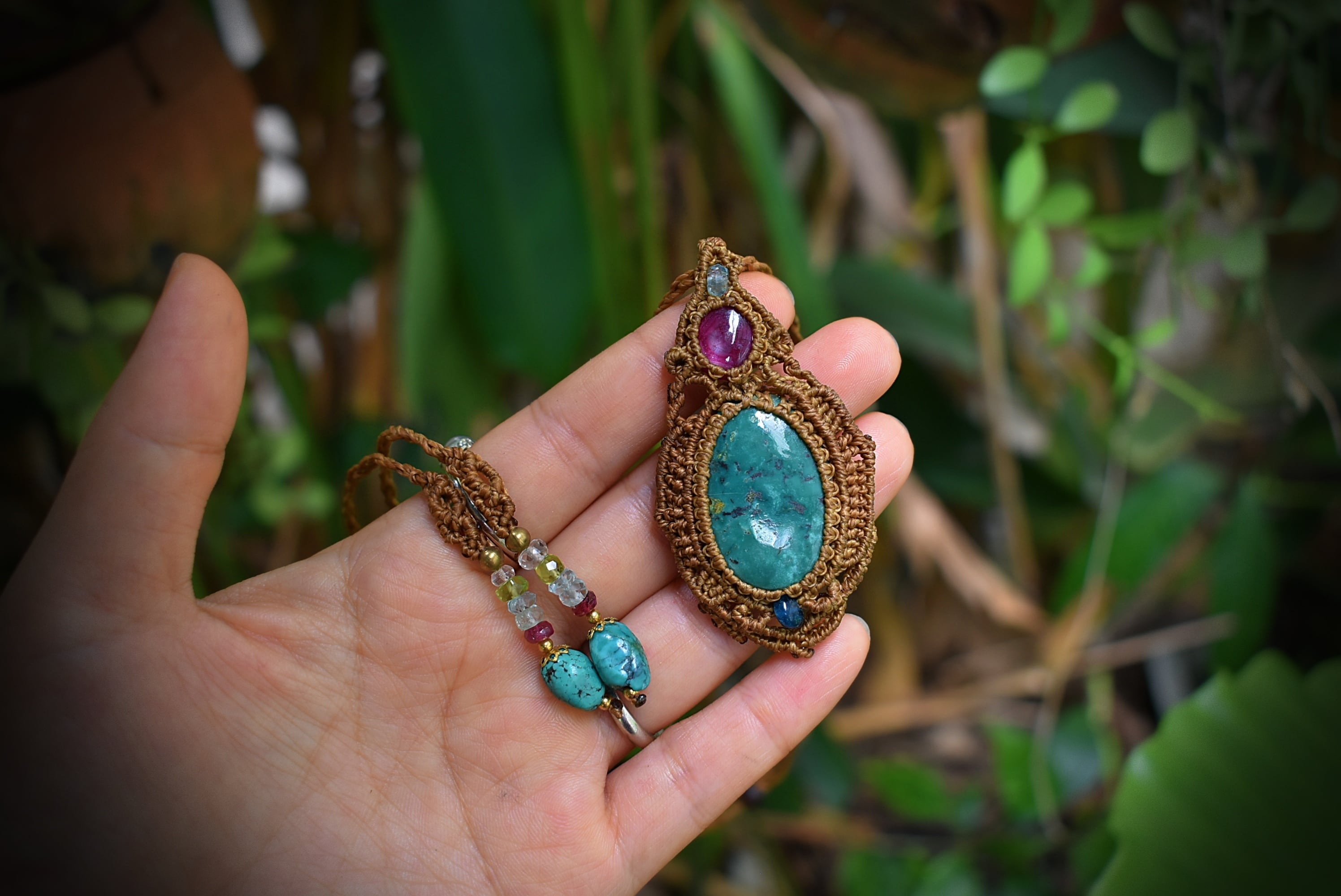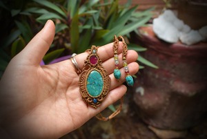 このたびのマクラメ編みペンダントはこれまでで初めての組み合わせ、深い色味の鮮やかな天然ルビーとグリーンカラーが目を引くターコイズを組み合わせて制作した紋章をイメージしたマクラメ編みペンダント。トップにはカットが施されたアクアマリンビーズをあしらいました。細い糸を細かく編み込むことでマクラメ編みの繊細さと石が引き立つデザインに仕上げました。アンティーク感たっぷりのペンダントを末長くお使いいただけると嬉しいです。