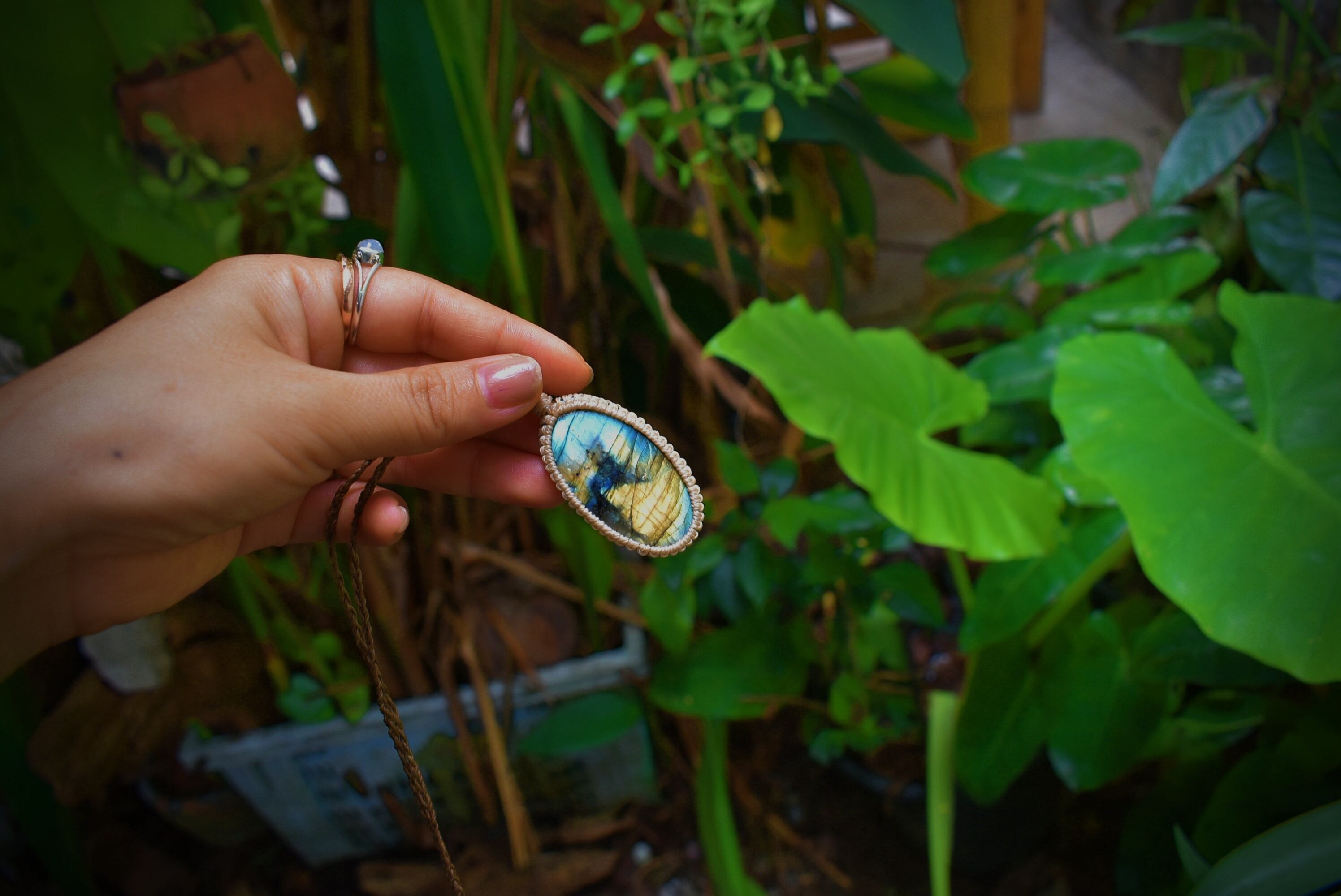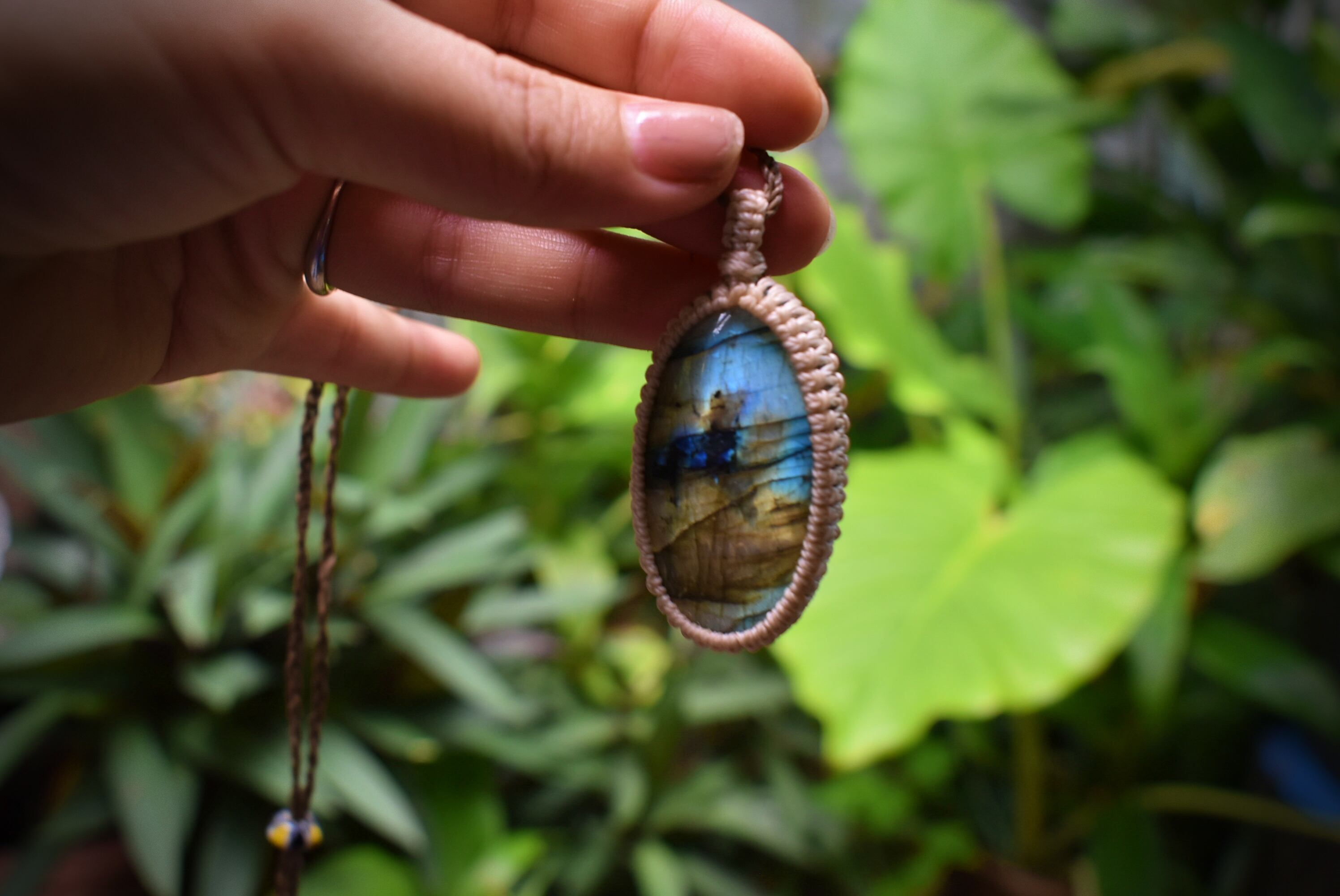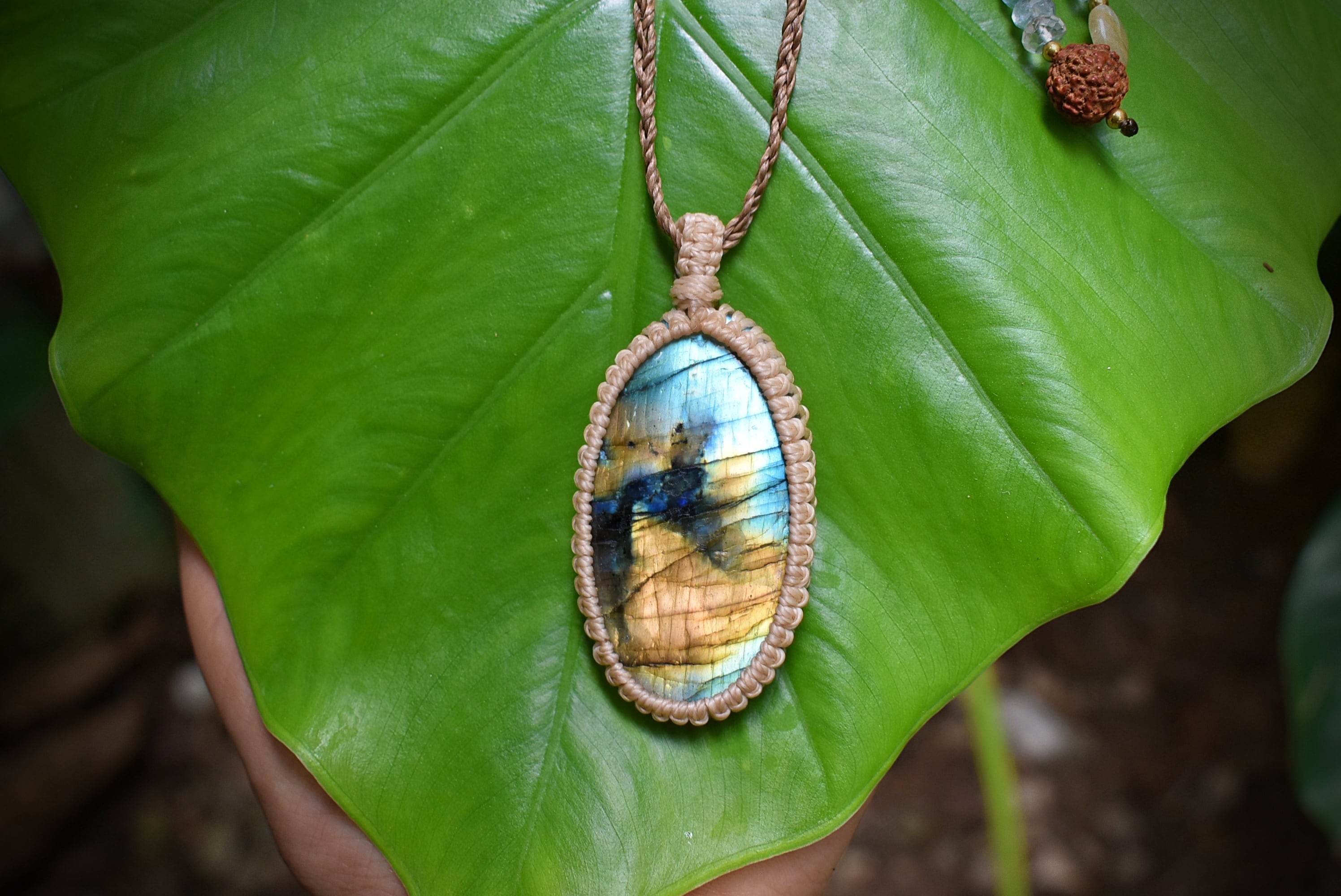 このたびのスペクトロライトブルーとイエローが混ざり合う色味が特徴的であり、ある角度からこの石を見ますと、美しく、どことなく艶のあるそんなルースをシンプルにマクラメ編みペンダントに仕上げました。