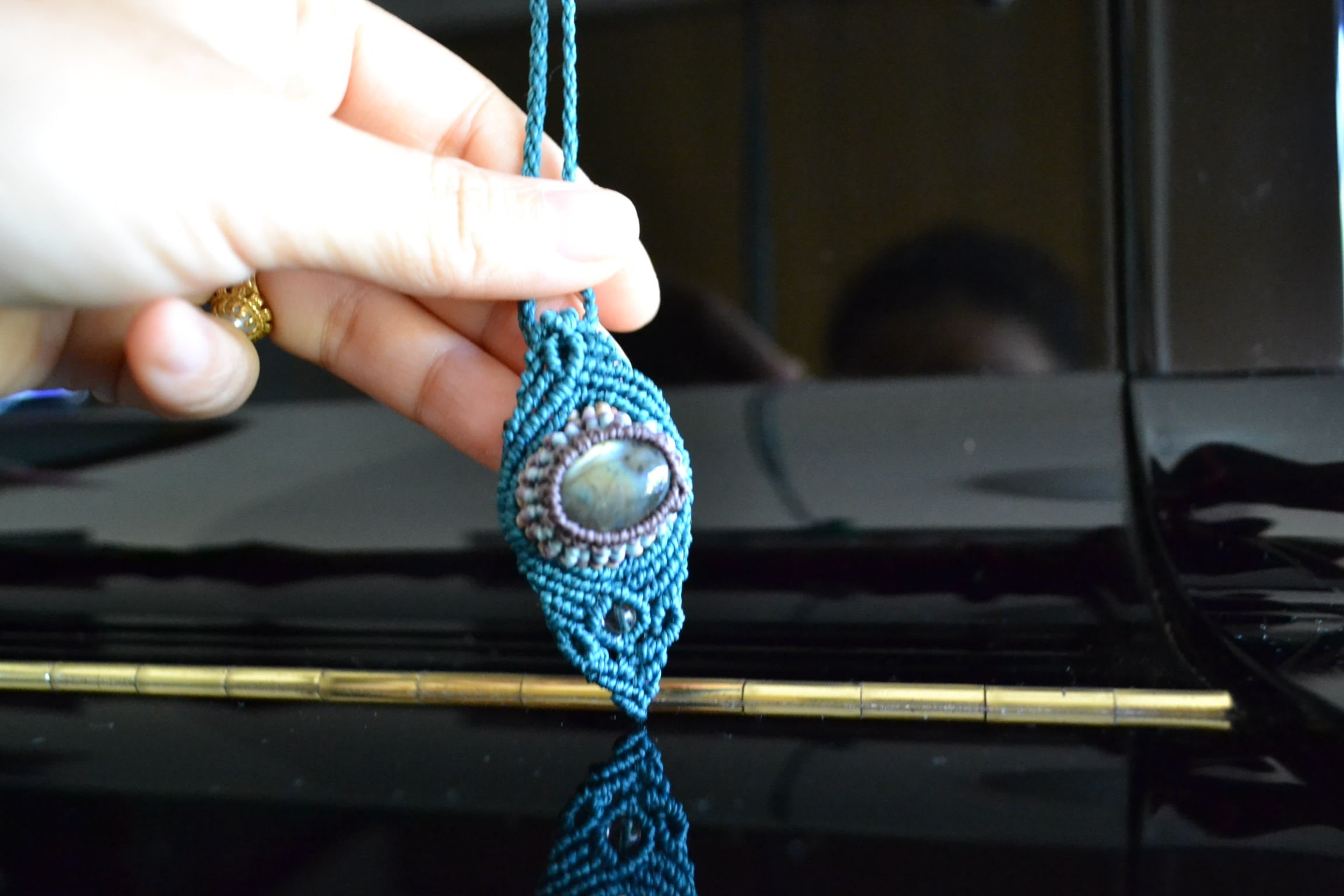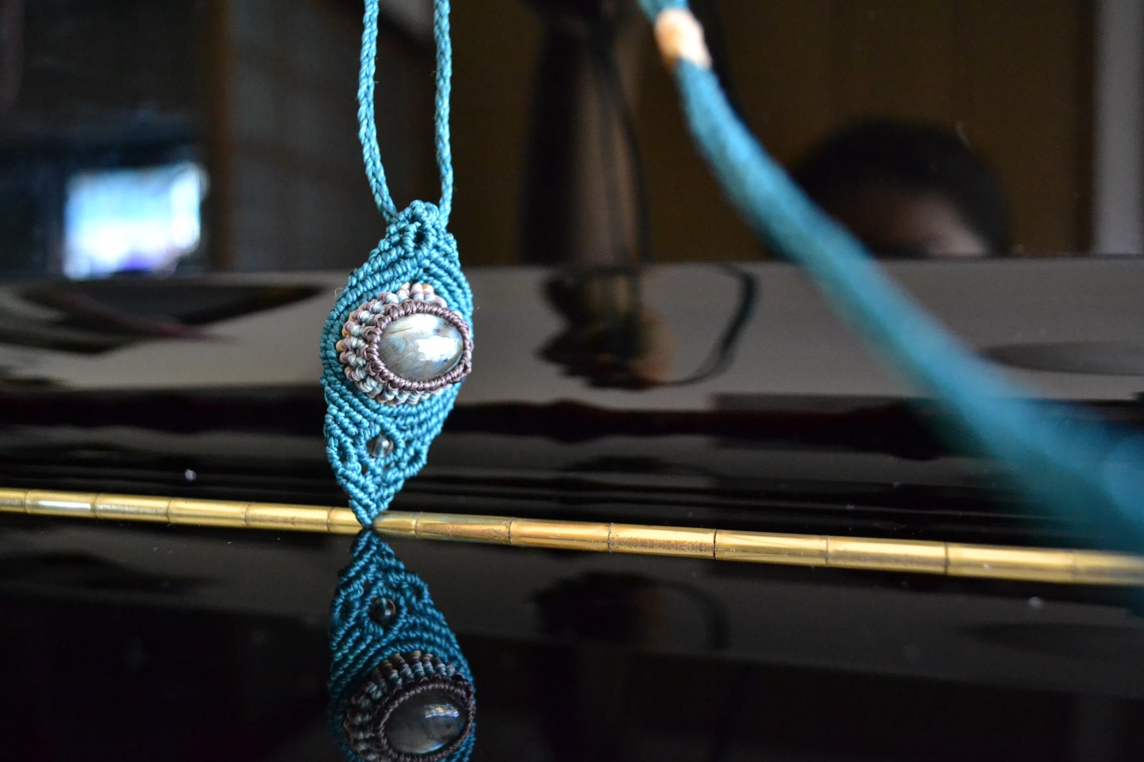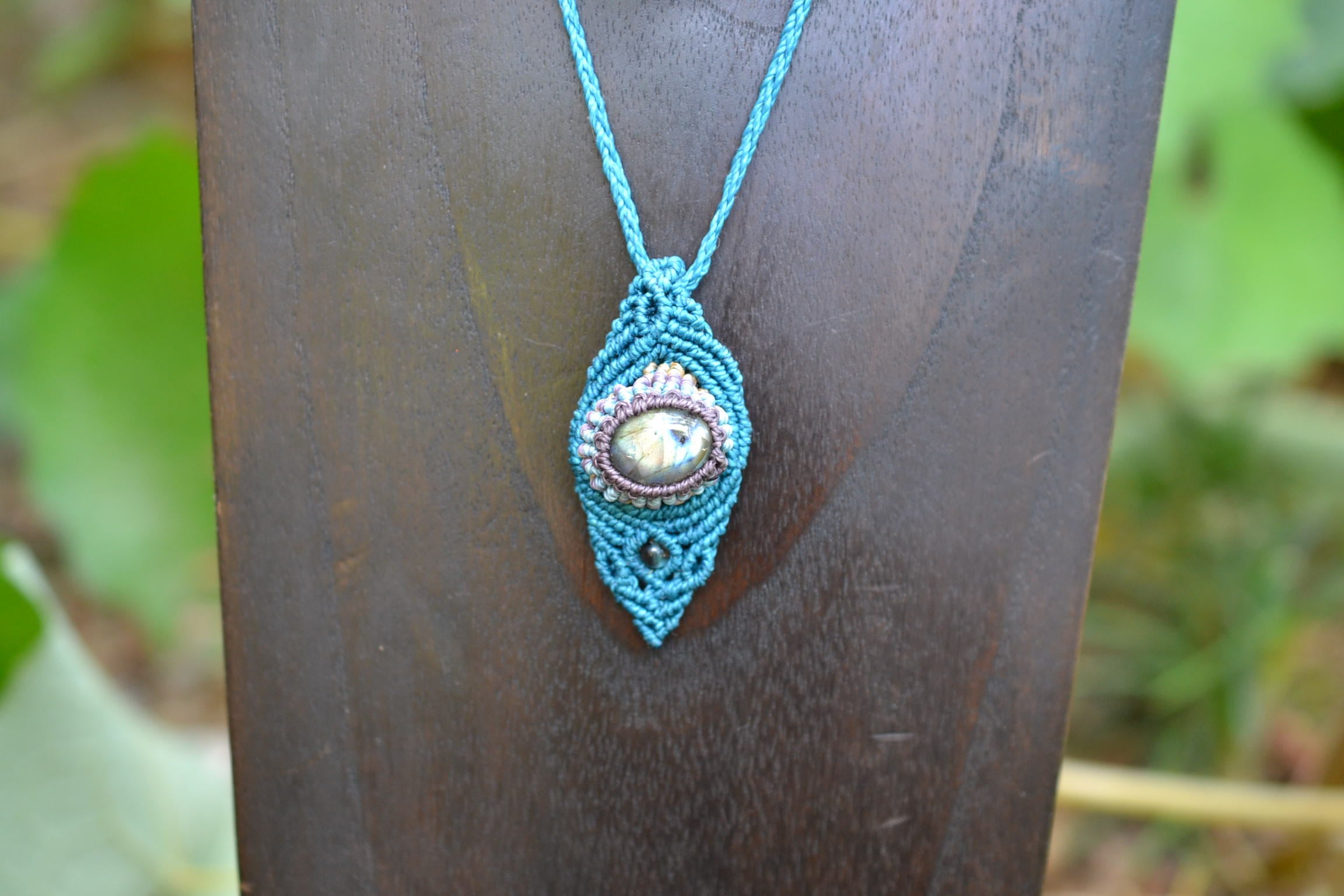 小ぶりですが力強い輝きを放つラブラドライトをブルーやパープル、、いろんな色の蝋引き糸を使用してペンダントにマクラメ編み装飾して仕上げました。いつも身につけていられるサイズを意識して制作しました。