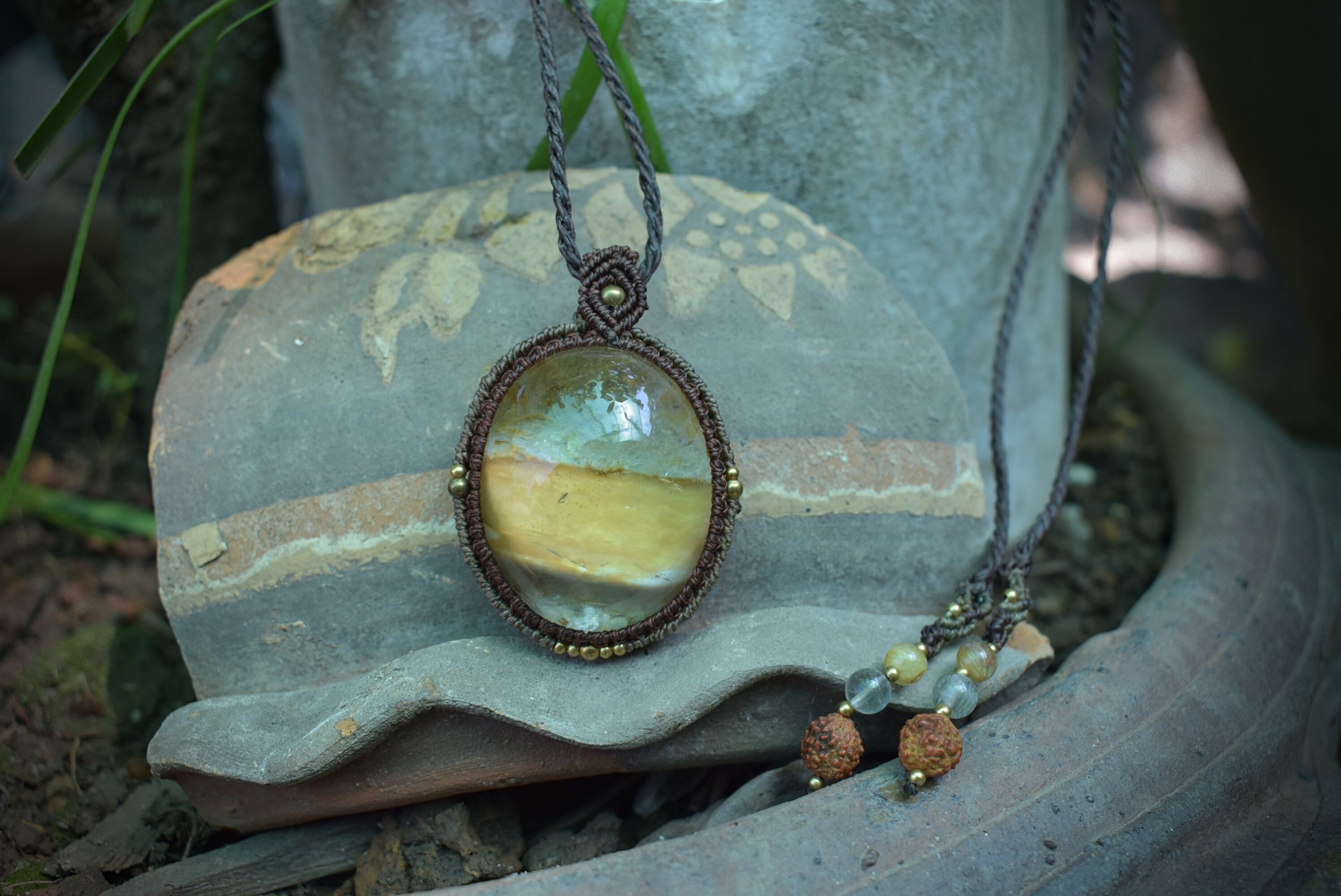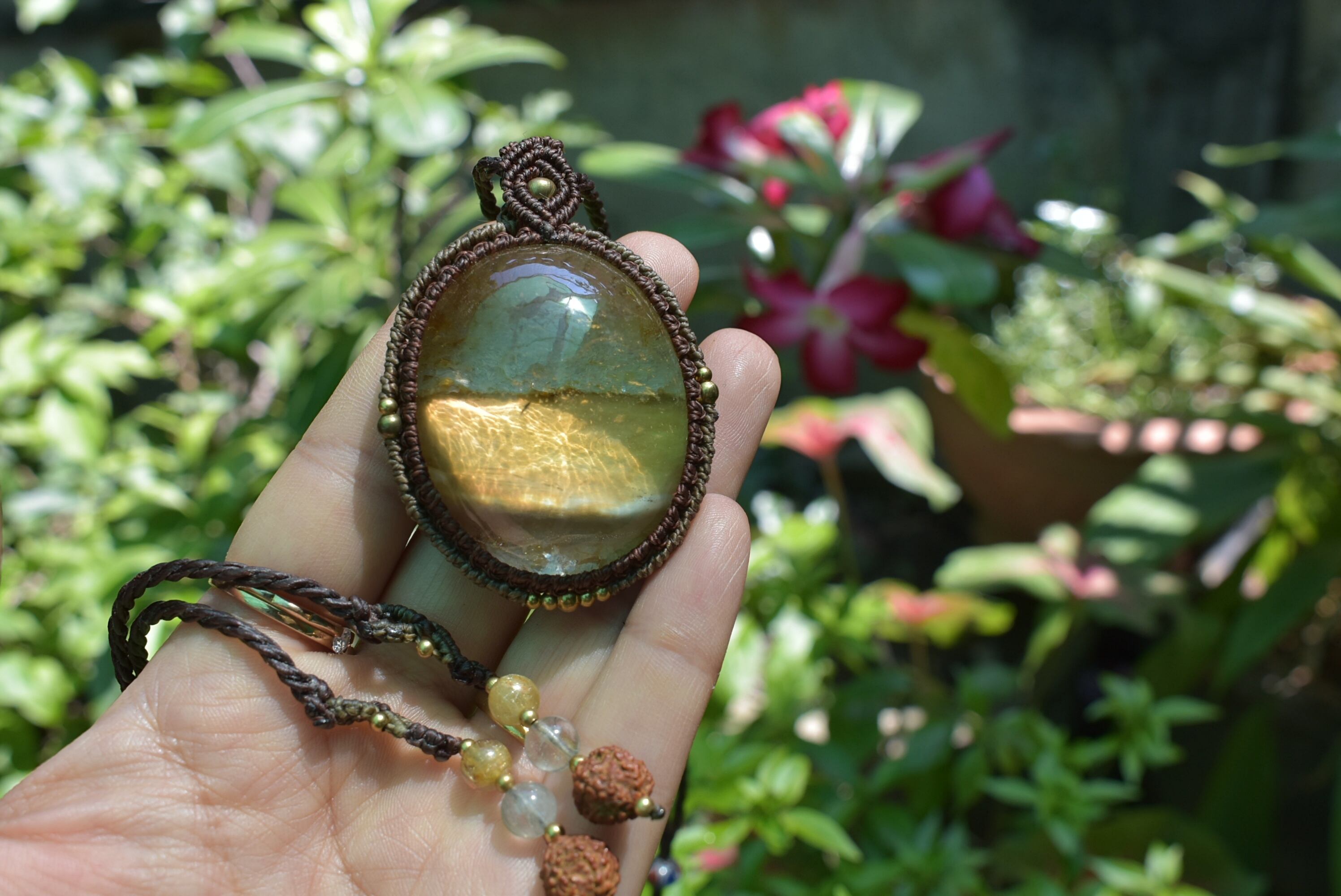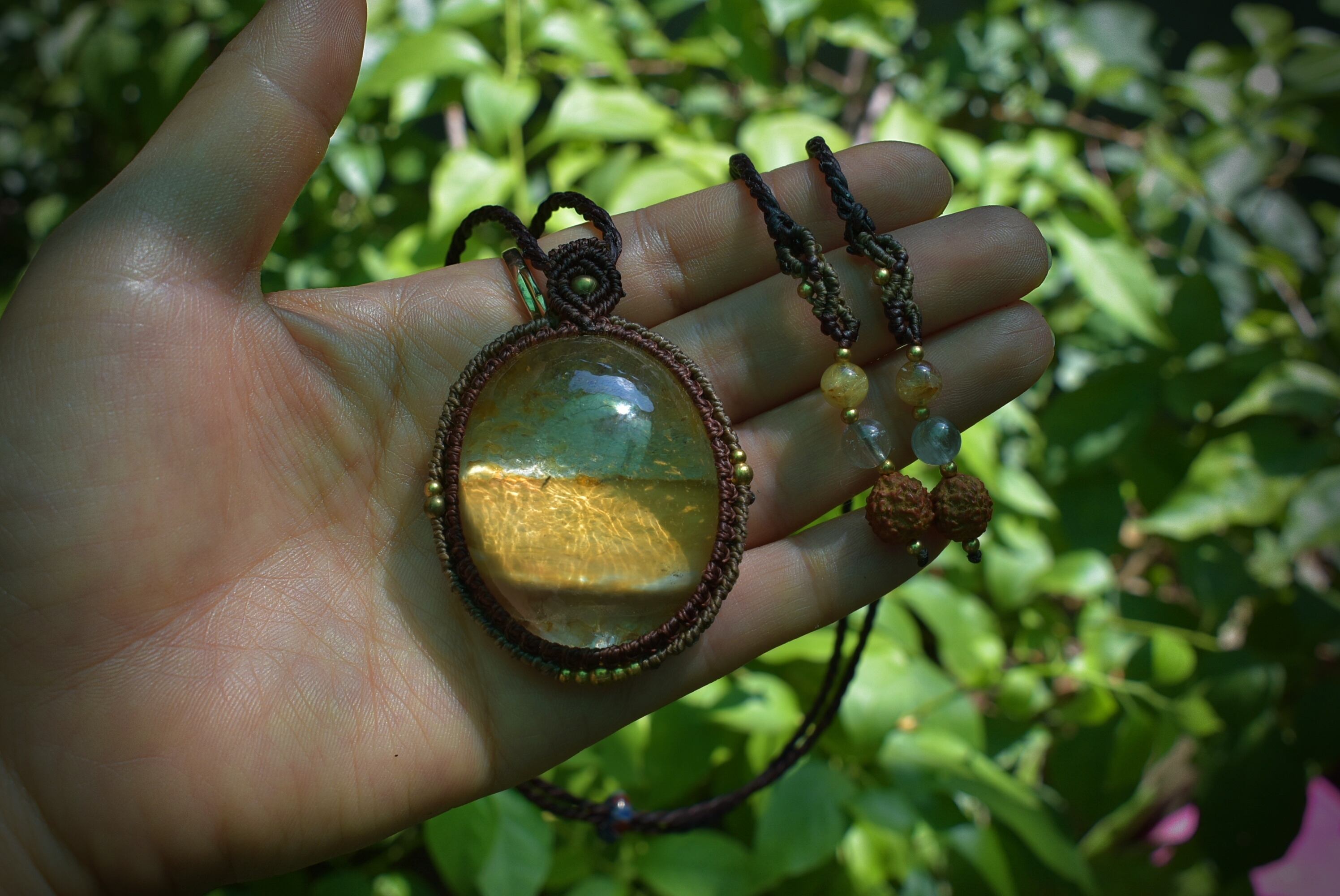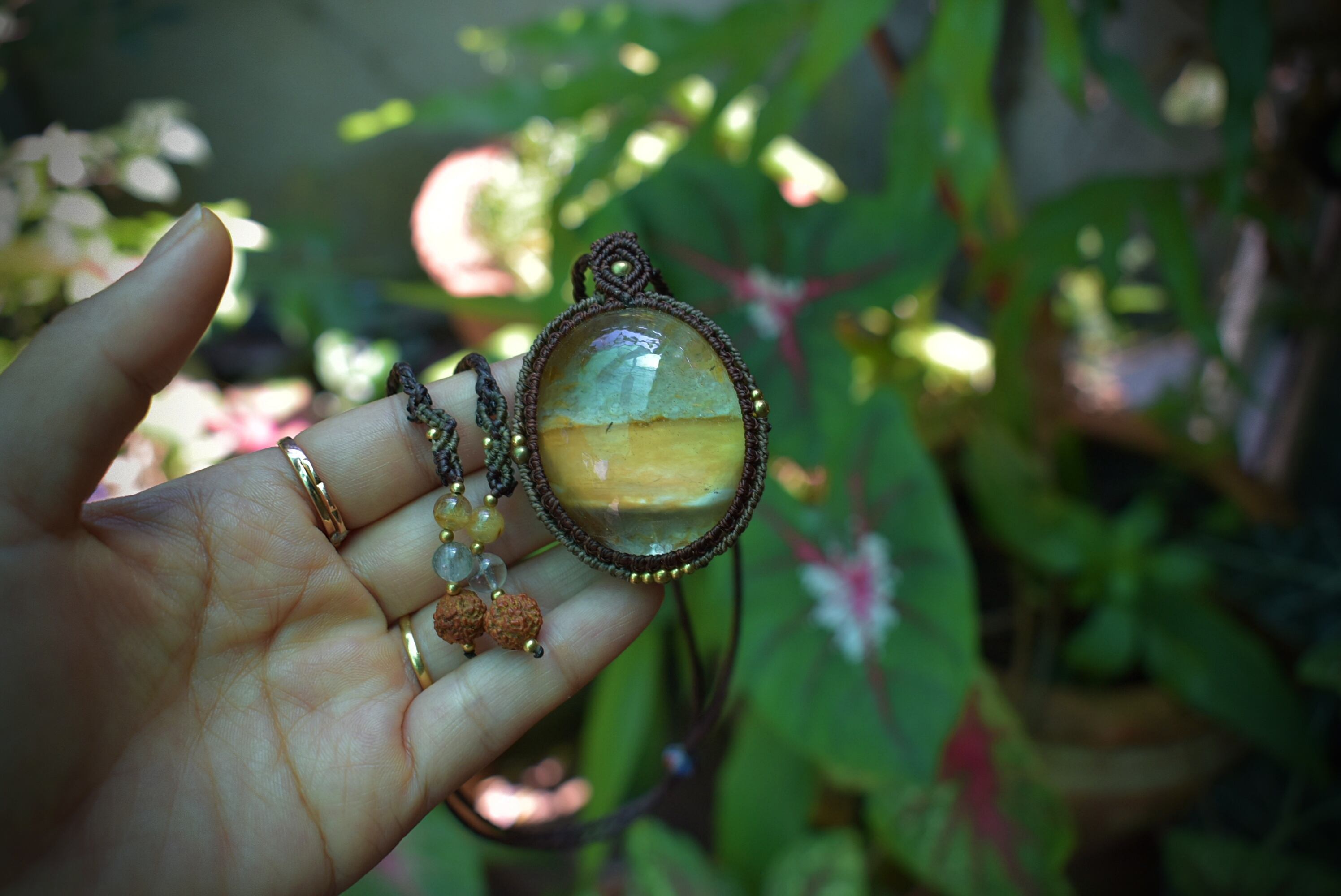 このたびのガーデンクォーツはなんと言ってもその色味が不思議で温かく、画像からも見てとることができますが水晶の層が縞模様に出来上がっており、くっきりと浮かび上がるイエローカラーはアジアを流れる黄河の如く、想い起こされるような..そんな水晶のひとつをマクラメ編み装飾してシンプルなペンダントに仕上げました。