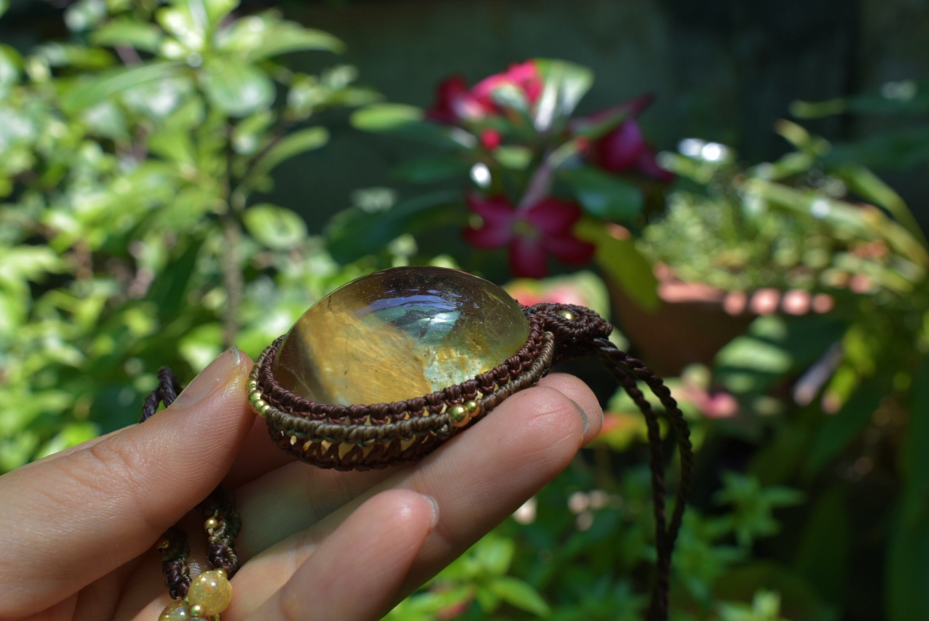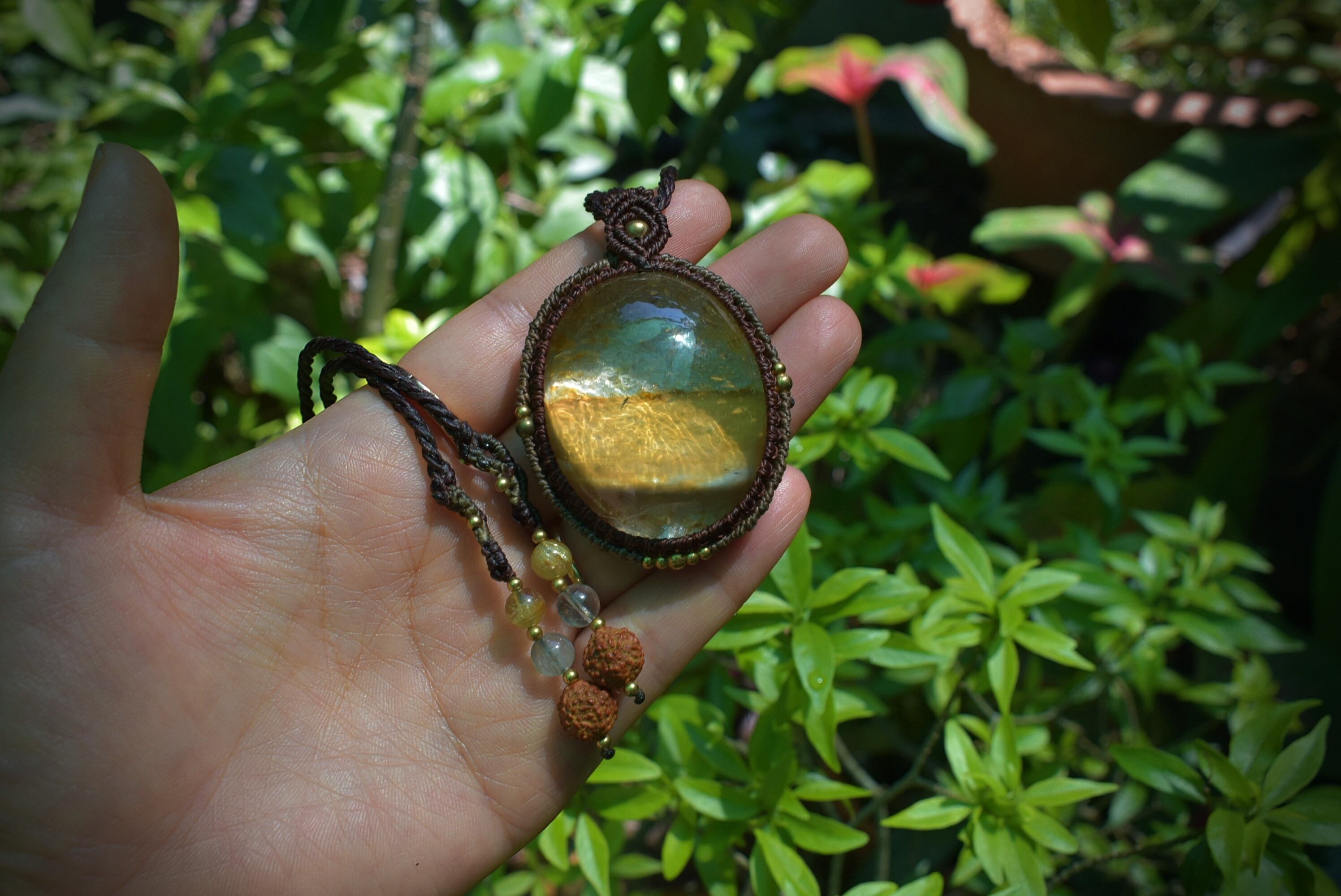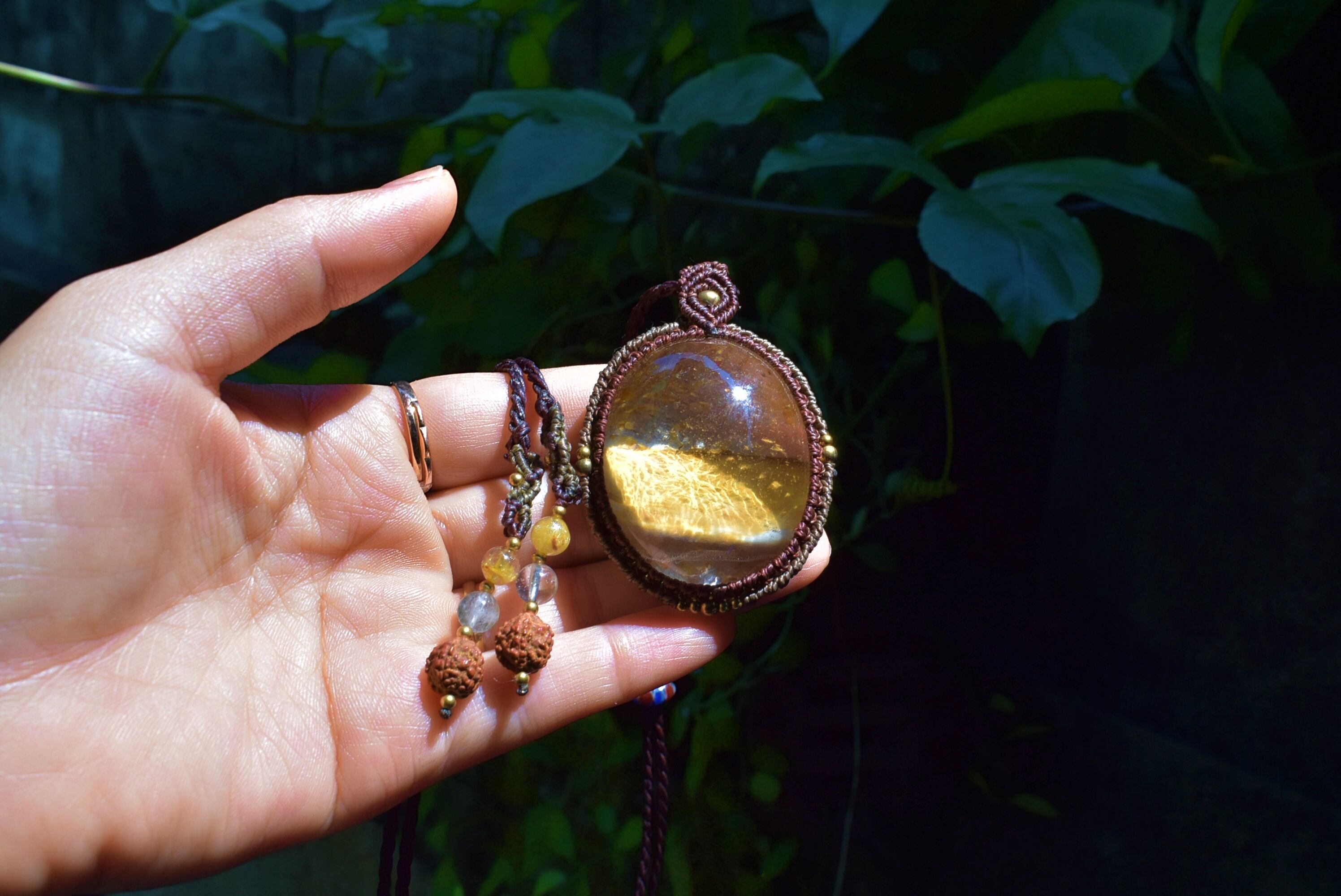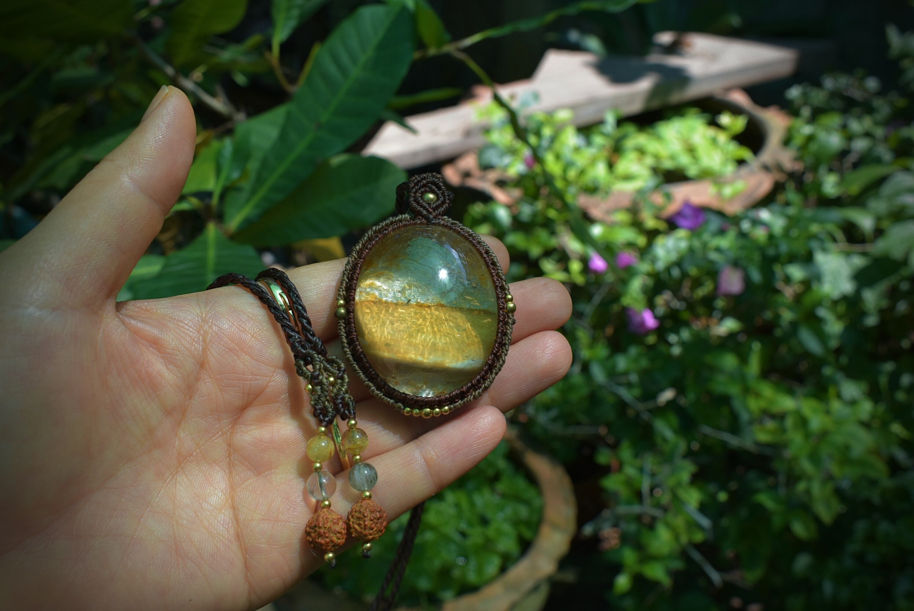 このたびのガーデンクォーツはなんと言ってもその色味が不思議で温かく、画像からも見てとることができますが水晶の層が縞模様に出来上がっており、くっきりと浮かび上がるイエローカラーはアジアを流れる黄河の如く、想い起こされるような..そんな水晶のひとつをマクラメ編み装飾してシンプルなペンダントに仕上げました。