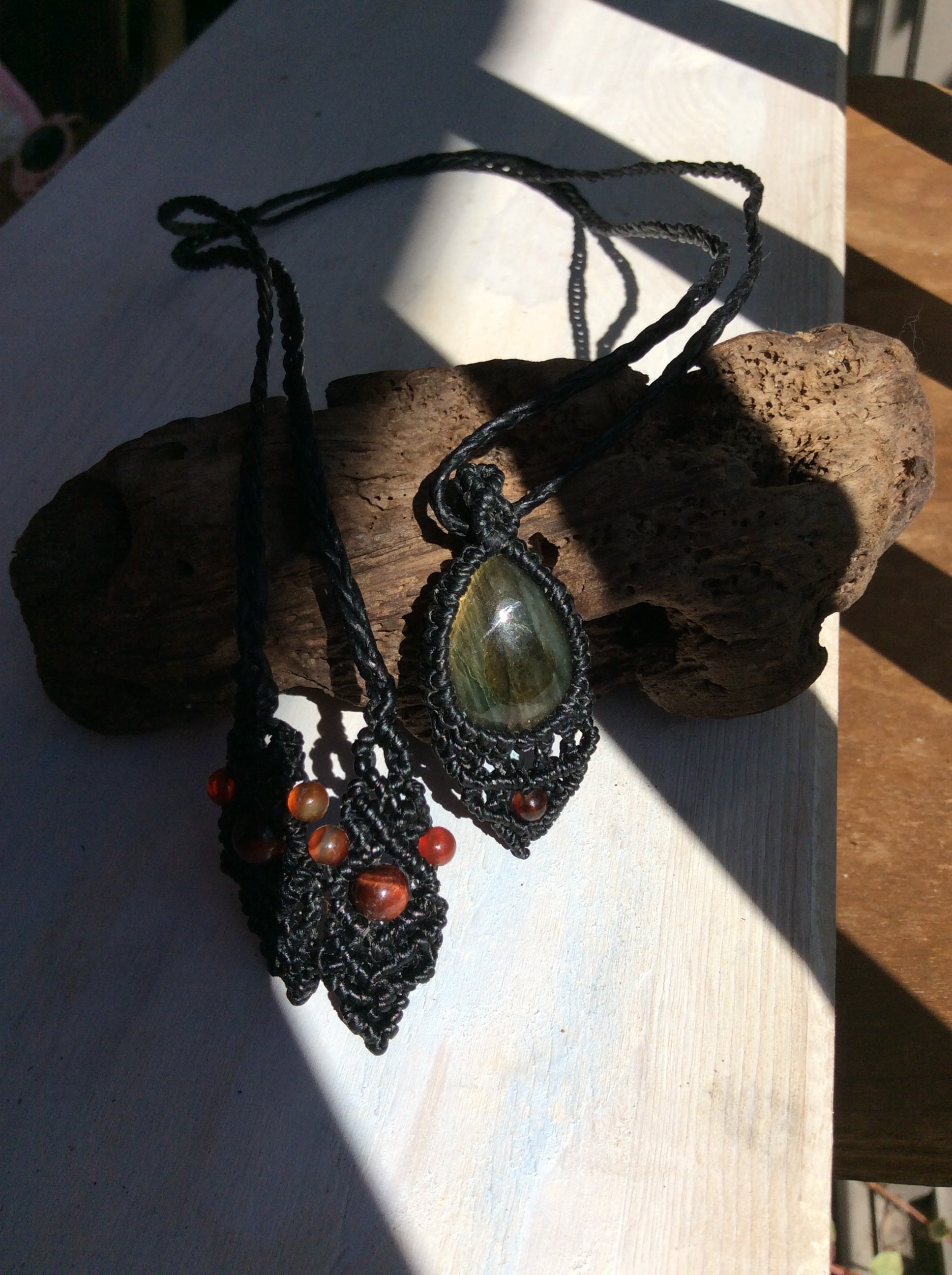 一緒に蒼いキラキラな色味のラブラドライトということを意識してラピスラズリビーズ、ブルークオーツァイトビーズを編み込み、この石の宇宙観を意識してエンド部分も非科学模様にマクラメ編み装飾を施しました。