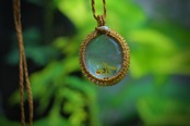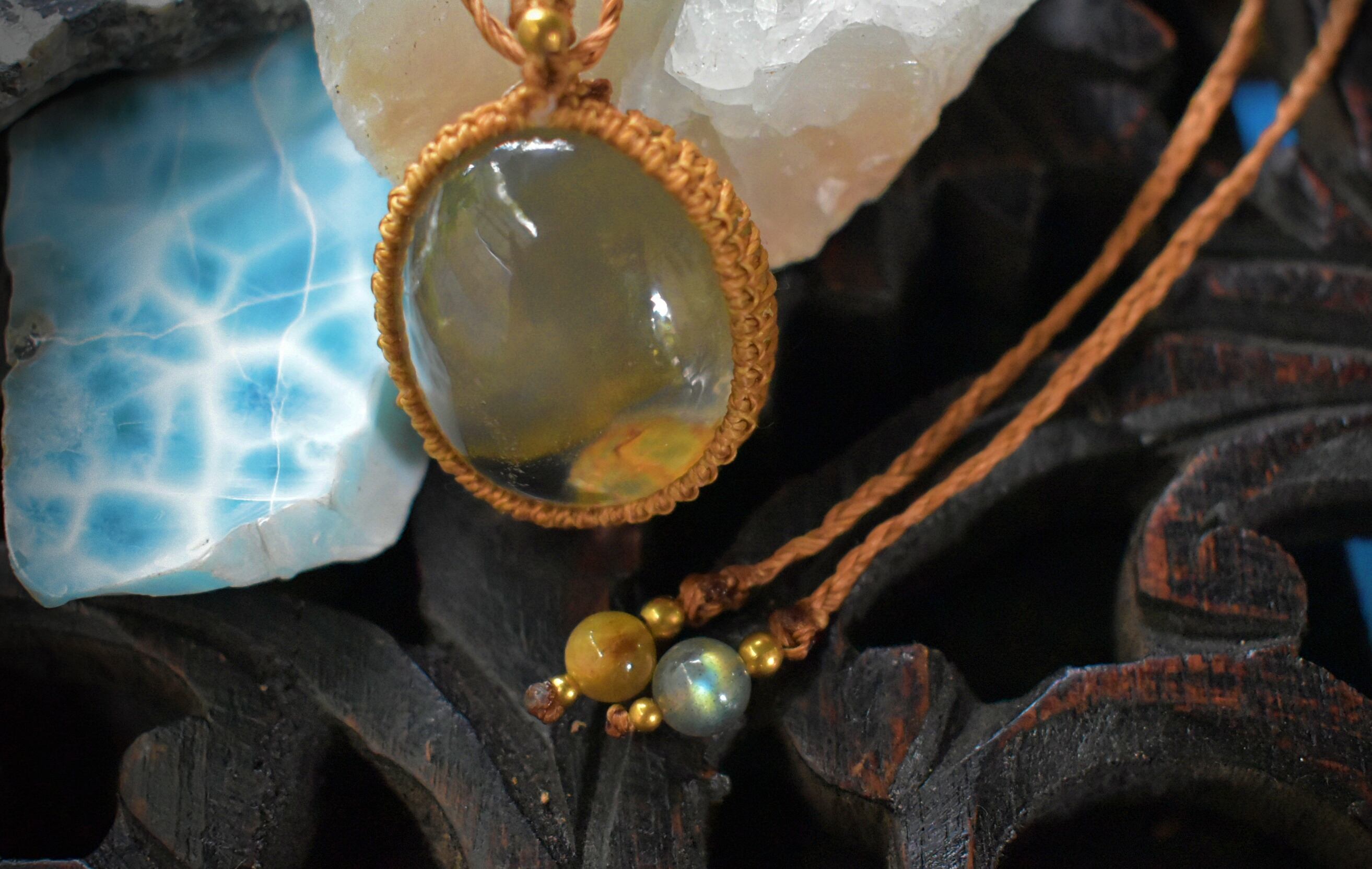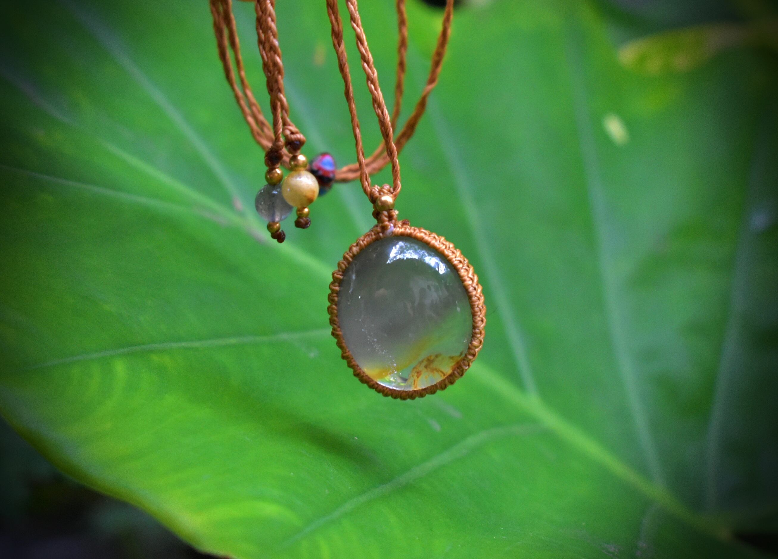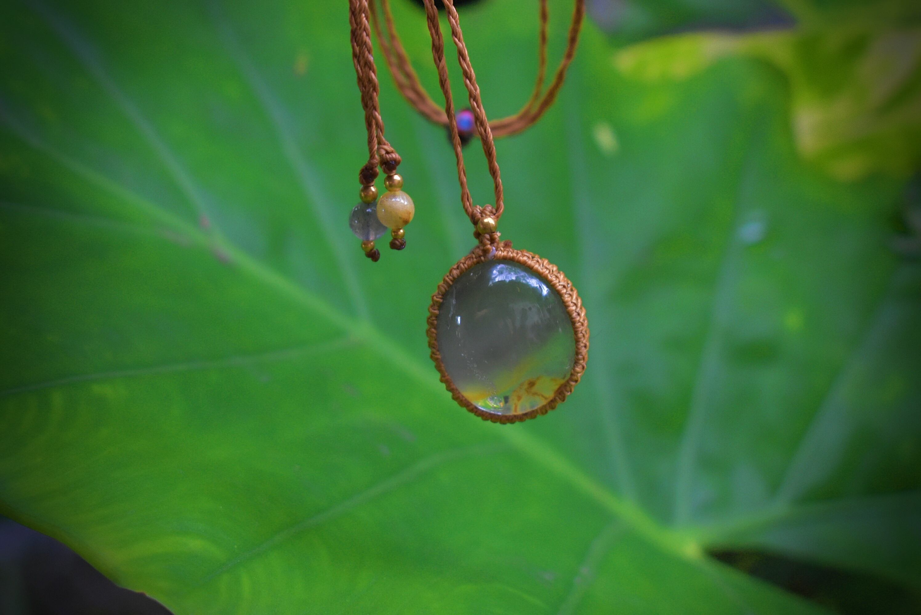 ぷっくりとした水晶はスモーキッシュな色味と可愛らしいゴールドカラーをちょこんと付け足した個性的なガーデンクォーツ。こんな水晶が理想でもある、そんなぷっくりとスタイリッシュな雰囲気の水晶をシンプルにマクラメペンダントに仕上げました。