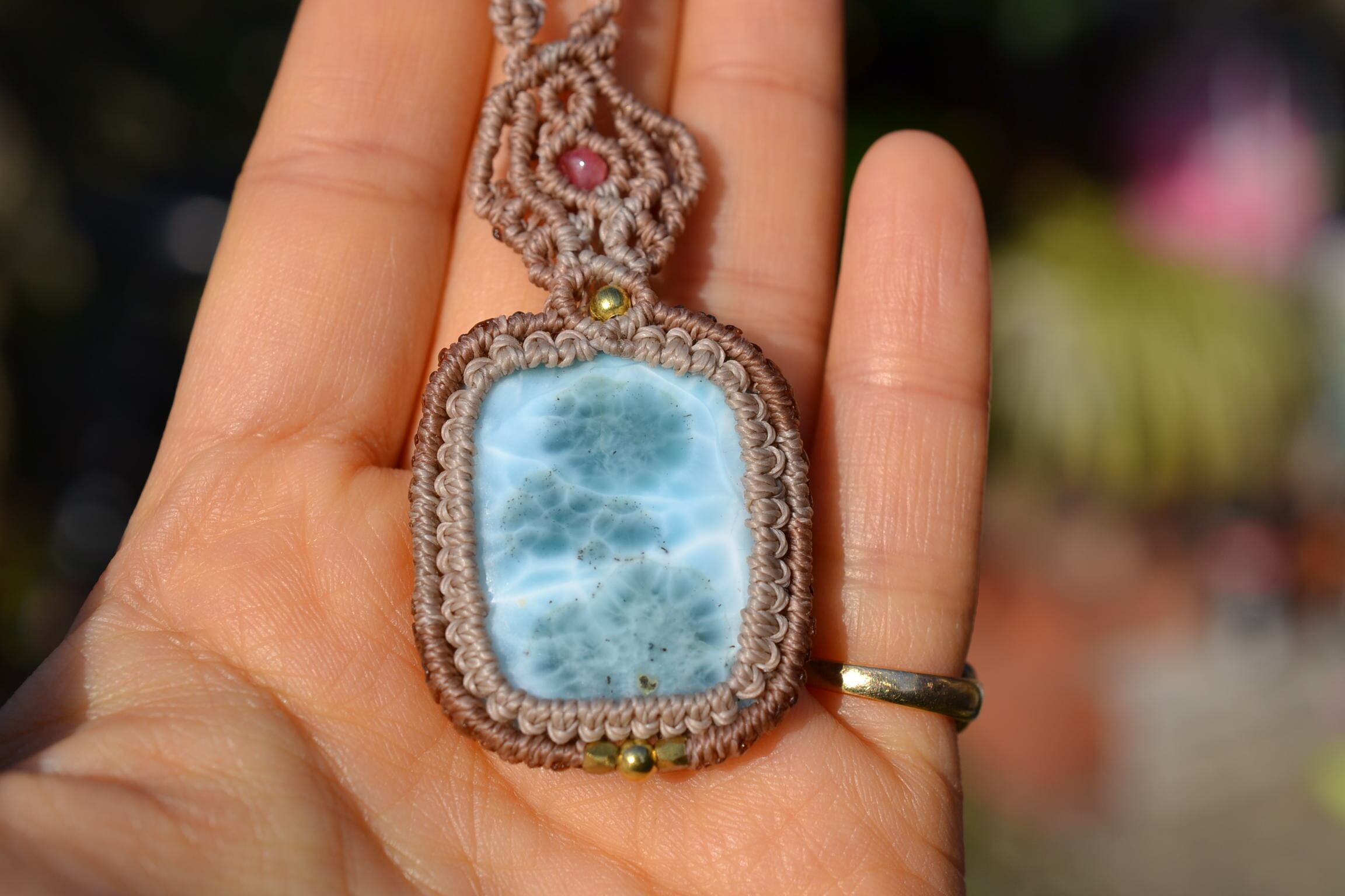 薄い色味が見るだけで優しい気持ちになれるような天然石ラリマーをシンプルに編み込みながら、トップ部分に小さなお花をあやかって、ピンクトルマリンクオーツビーズを中心とした女性らしい雰囲気のネックレスを制作しました。仕入れをしてからしばらくの間、イメージが湧くまで大切に保管していたものがこの度形となりました。