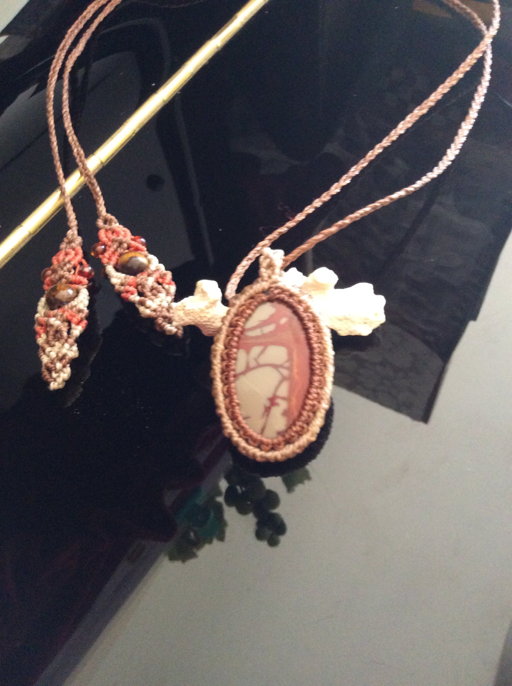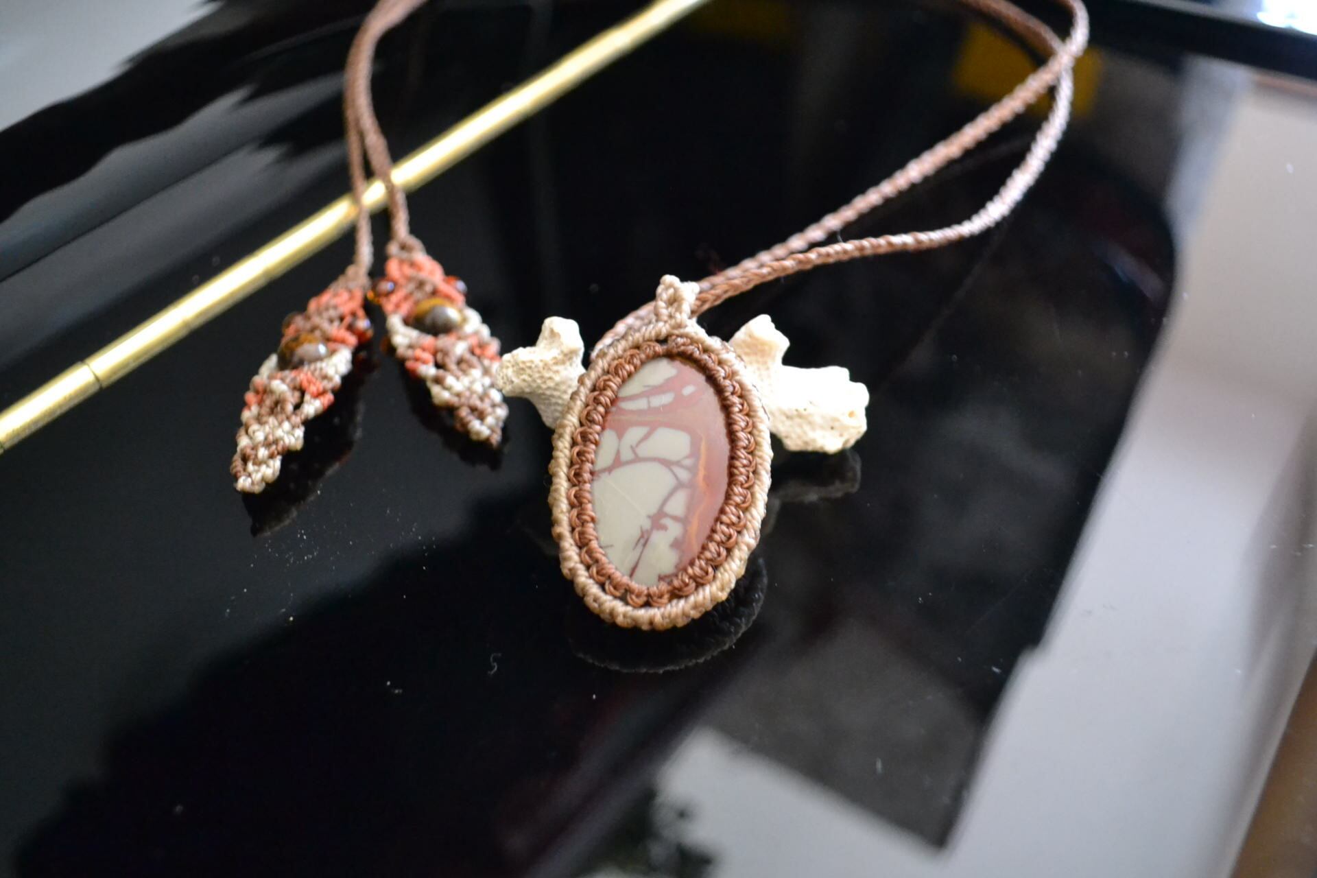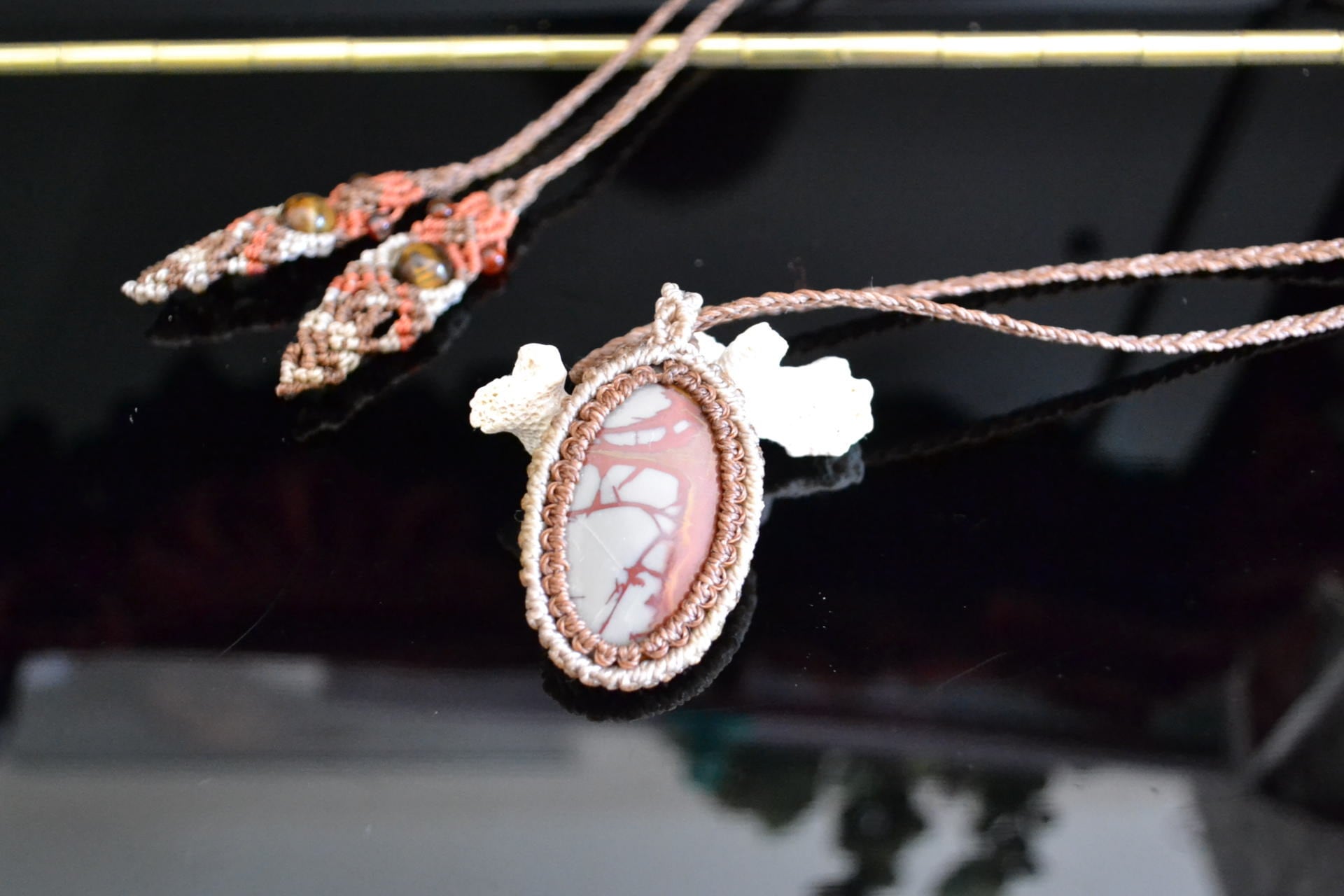 模様が斬新でどことなくモードな雰囲気、木の枝が枝分かれしたような、色合い豊かなレッドスネークジャスパーをシンプルにマクラメ編み装飾し、ペンダントに仕上げました。是非、お手にとってみてもらいたい個性的なジャスパーのひとつです。