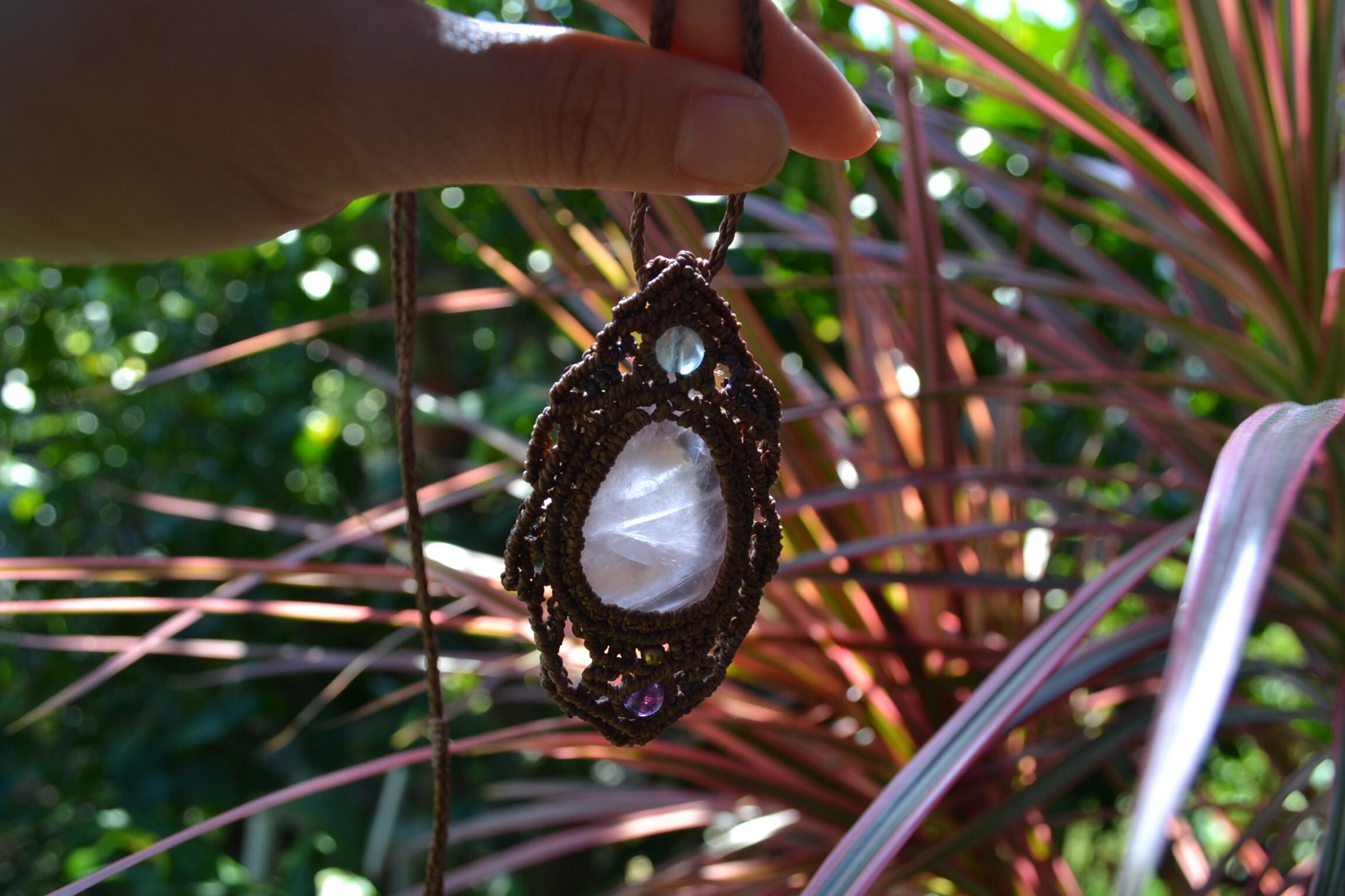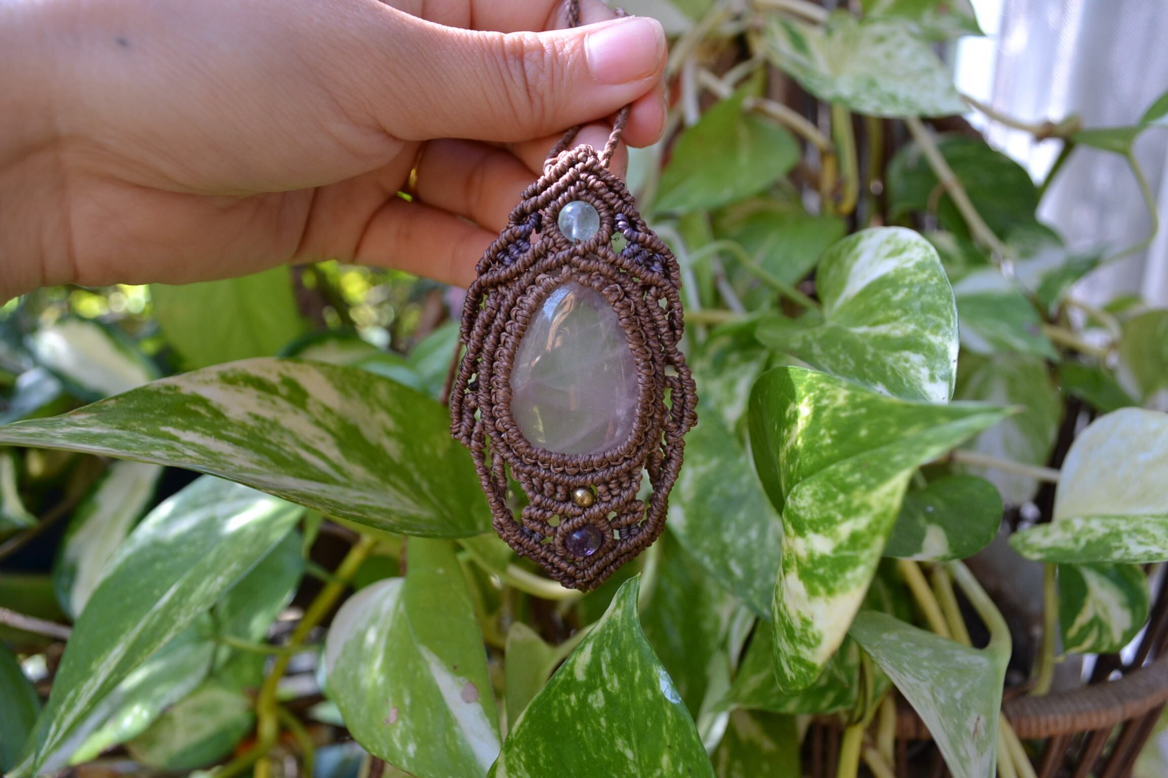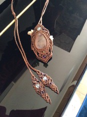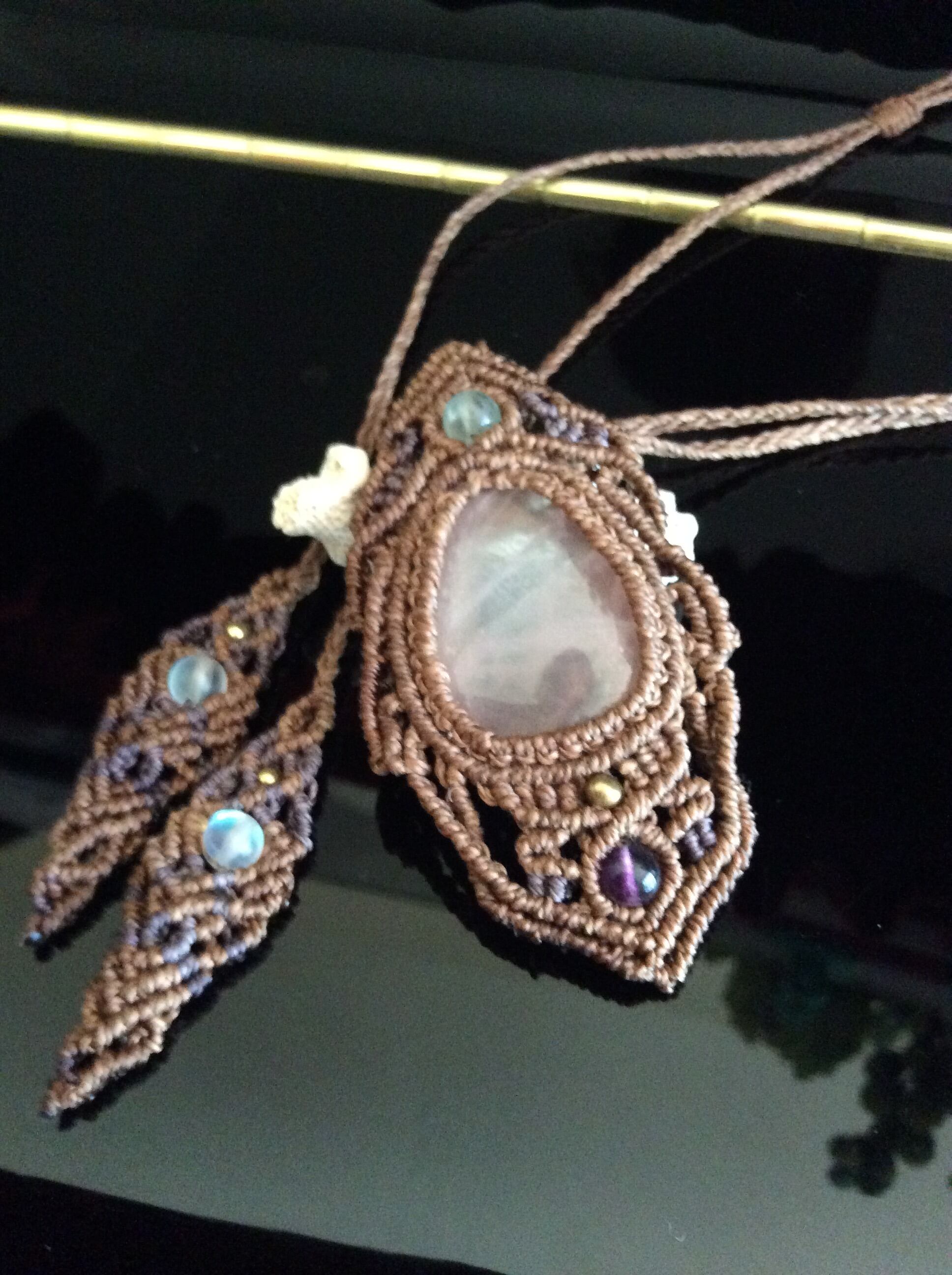 ほんのり淡い色合いのローズクオーツをマクラメ編み装飾を施しペンダントができました。