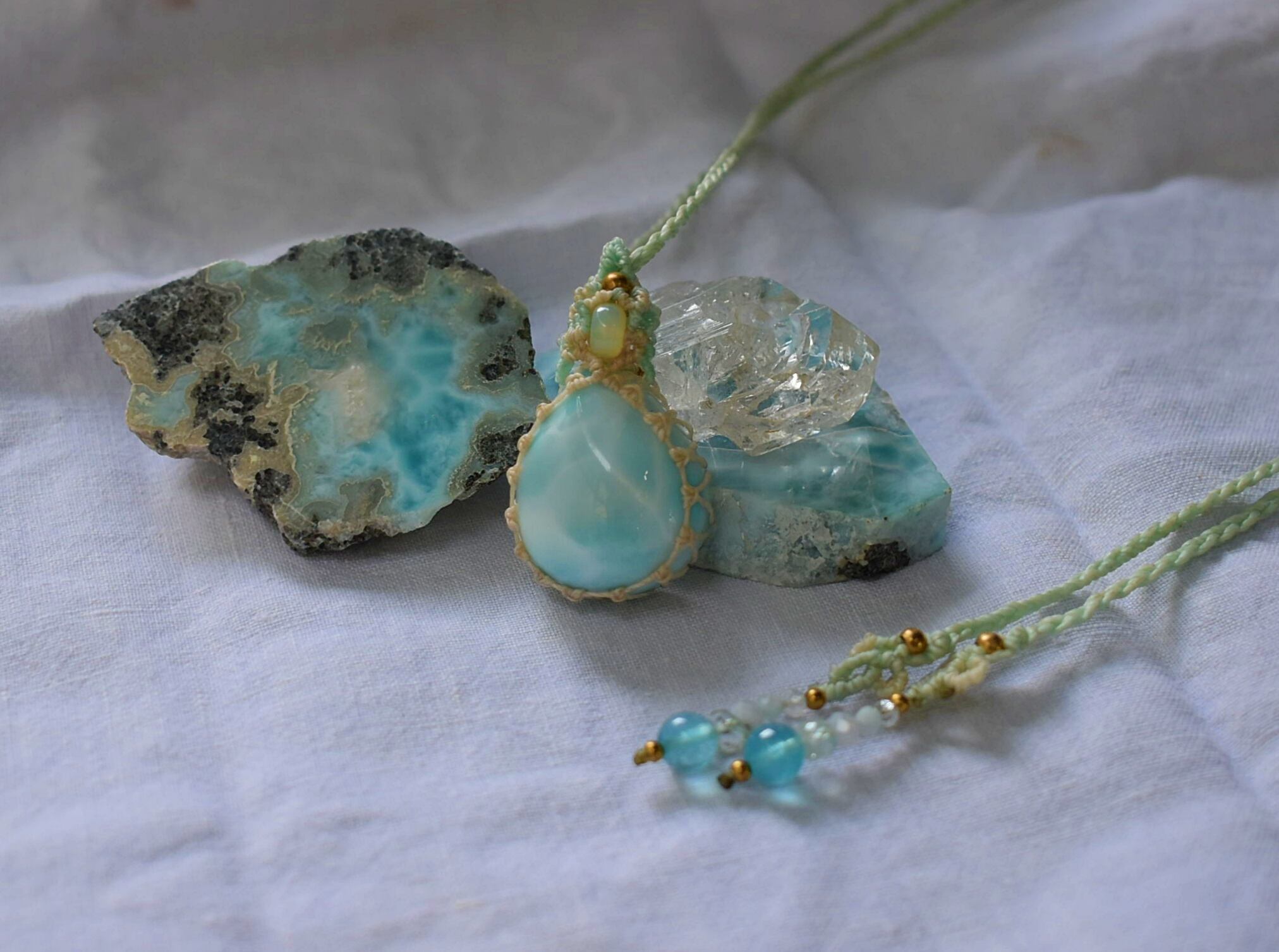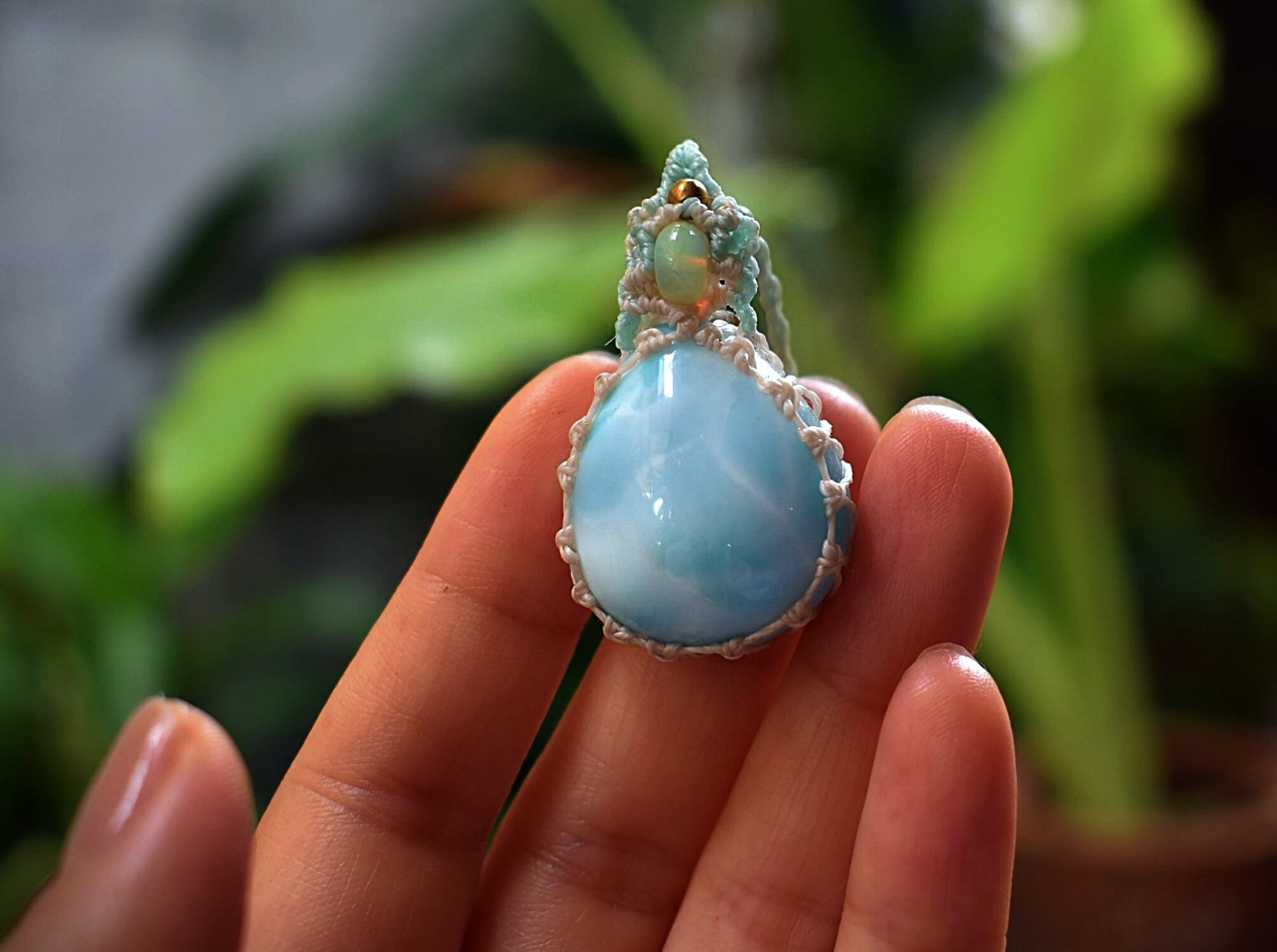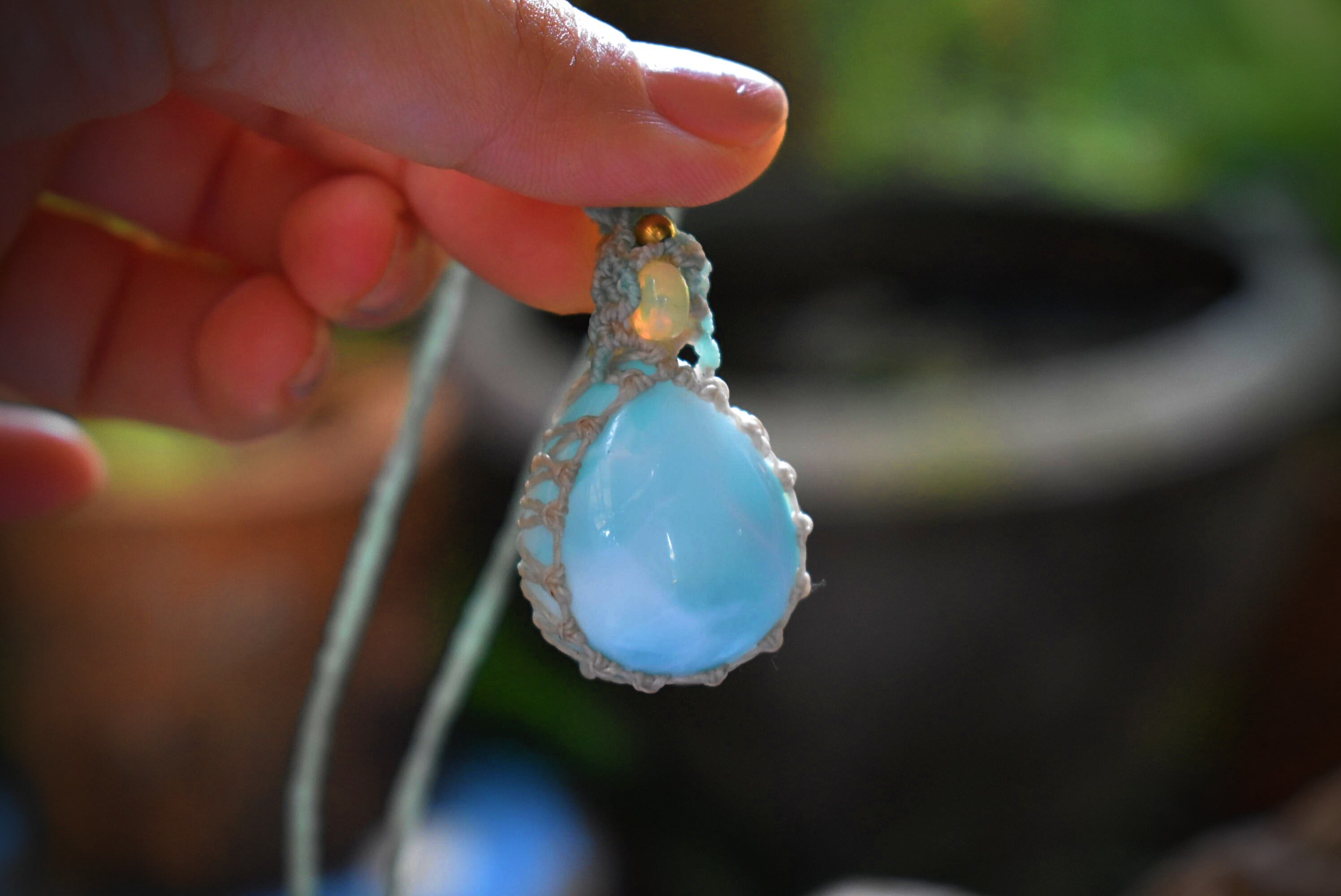 水滴の雫★エチオピアンオパール×透明感★ぷるぷるラリマーマクラメペンダント