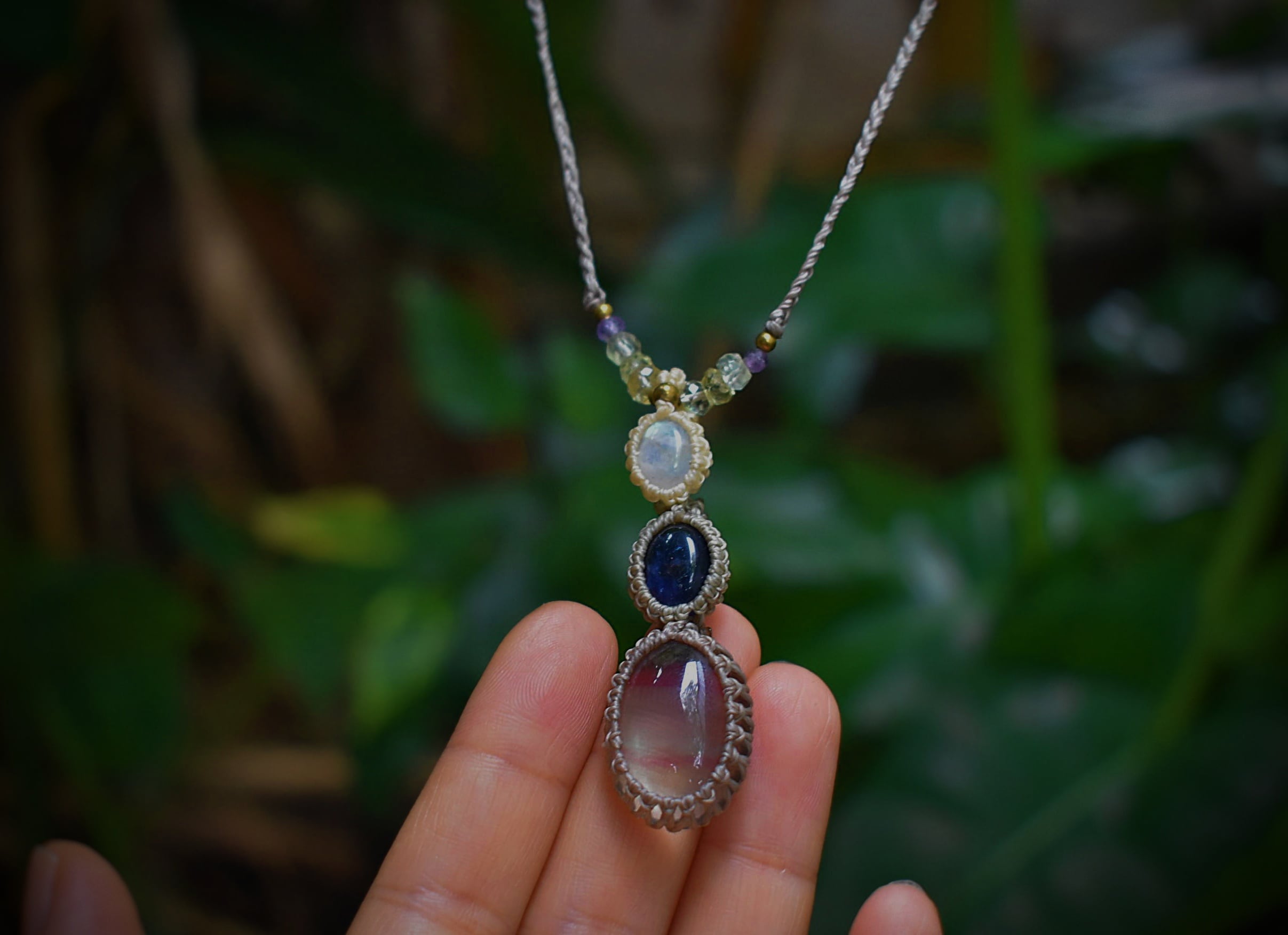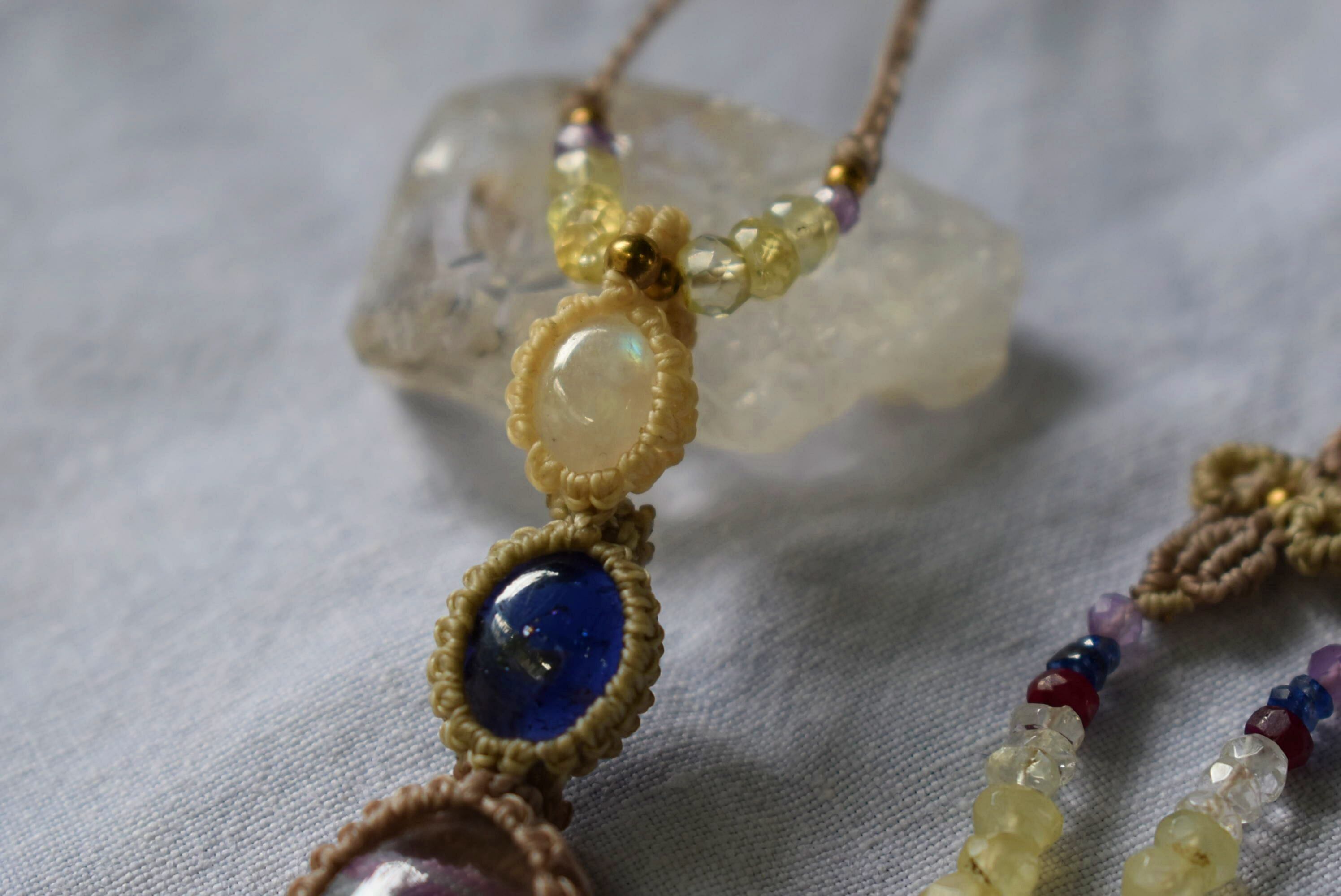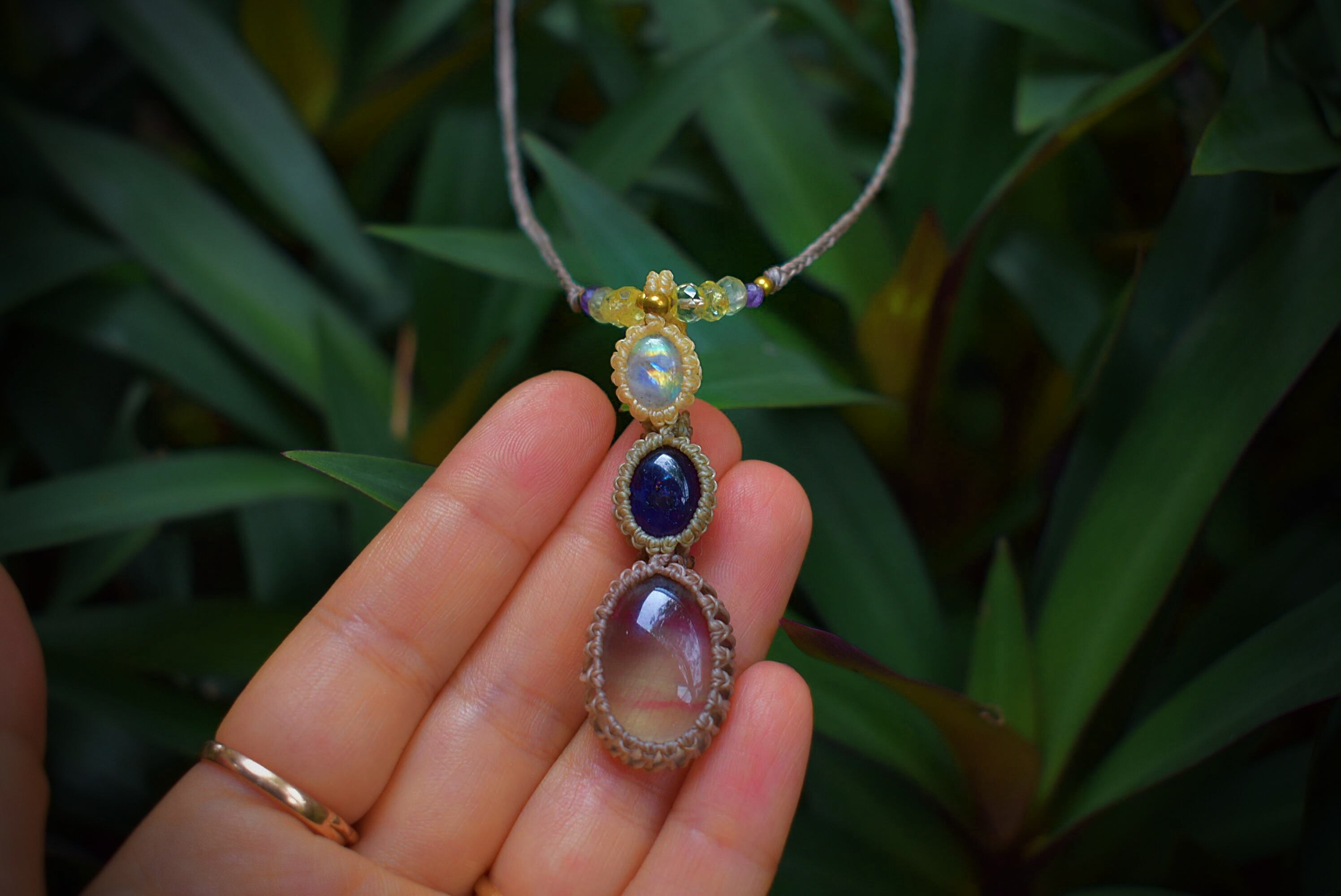 宇宙と真空の世界★レインボームーンストーン×アイオライトサンストーン×フローライト マクラメペンダントmoon004