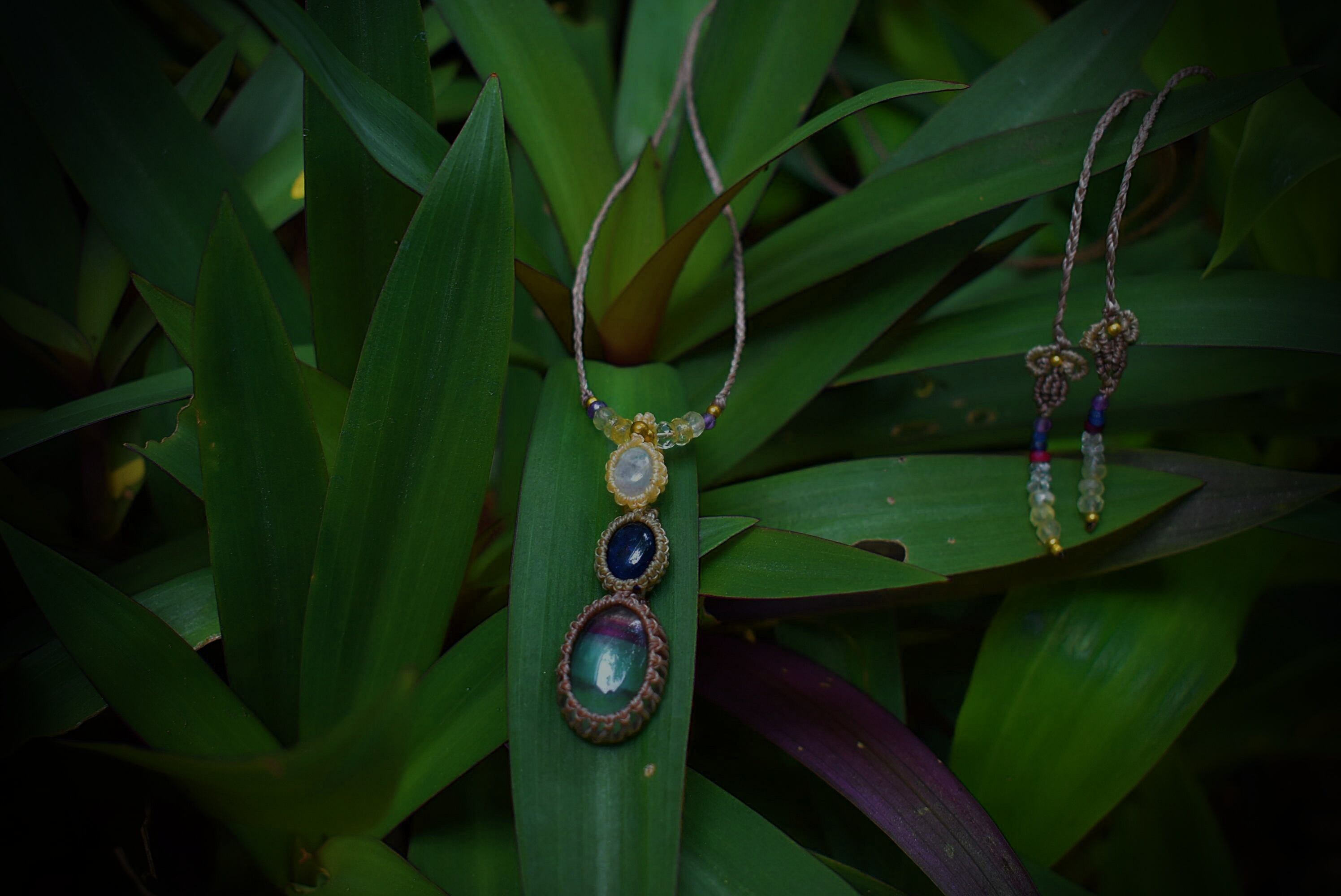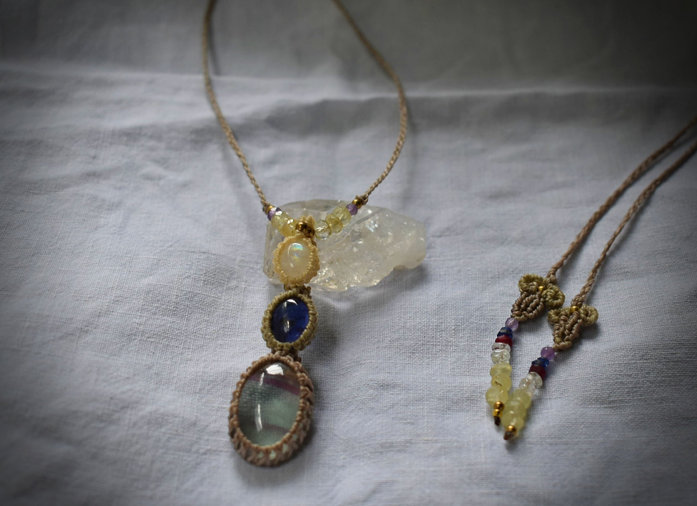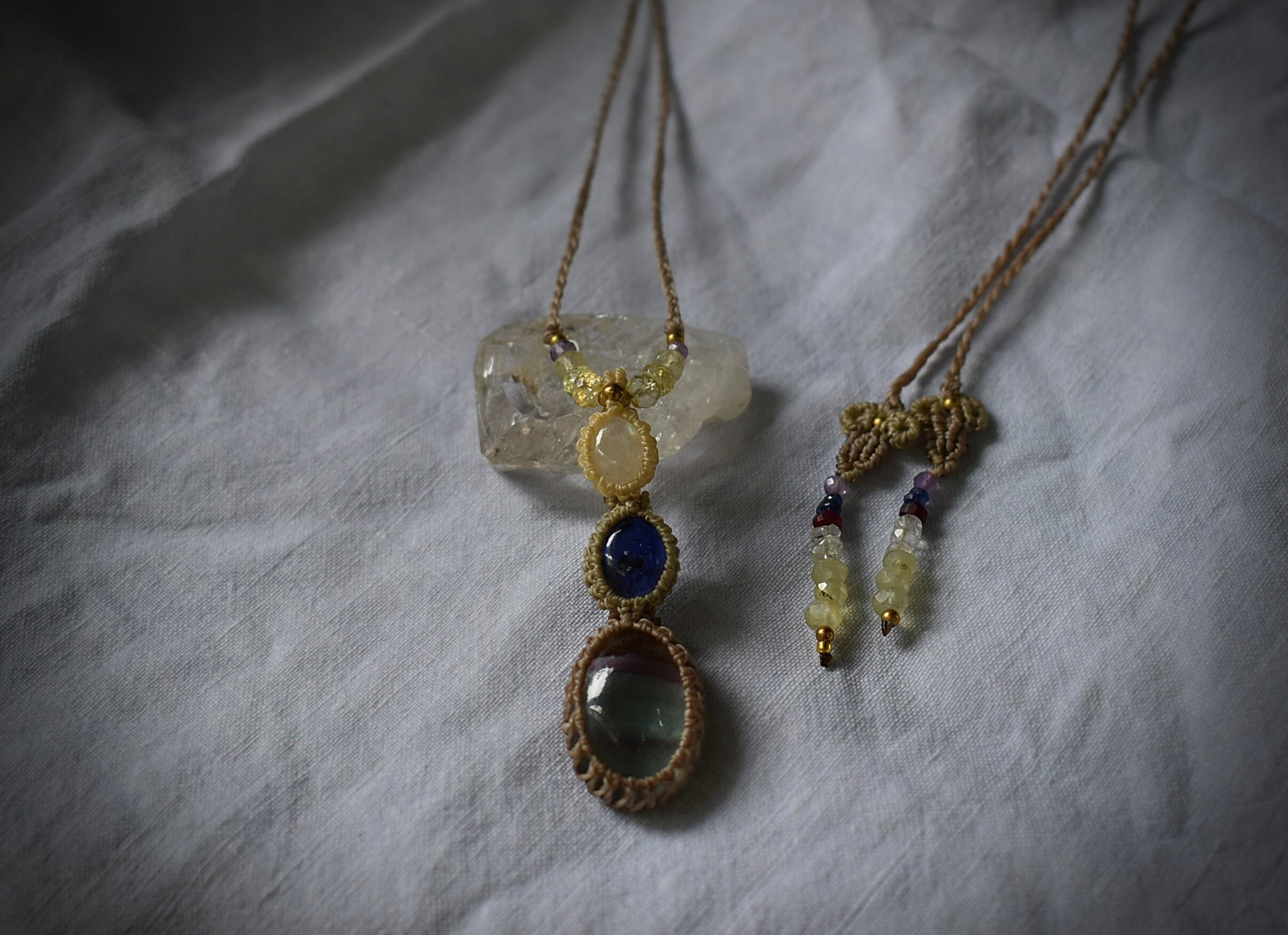 宇宙と真空の世界★レインボームーンストーン×アイオライトサンストーン×フローライト マクラメペンダントmoon004