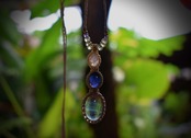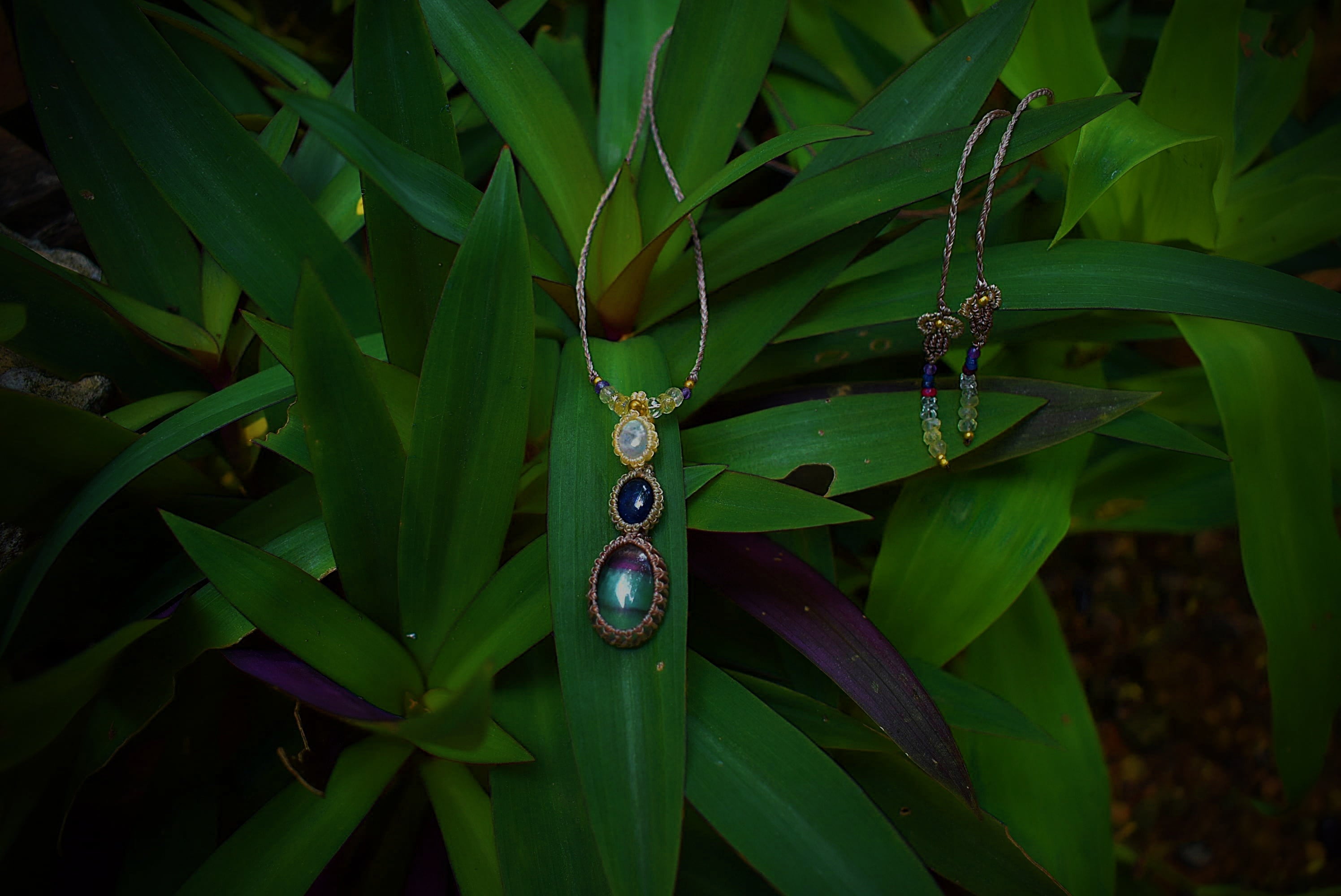 ジェムクオリティーのビーズたちと共に3つのルースが妖しく美しく胸元に光るペンダントをイメージして制作しました。