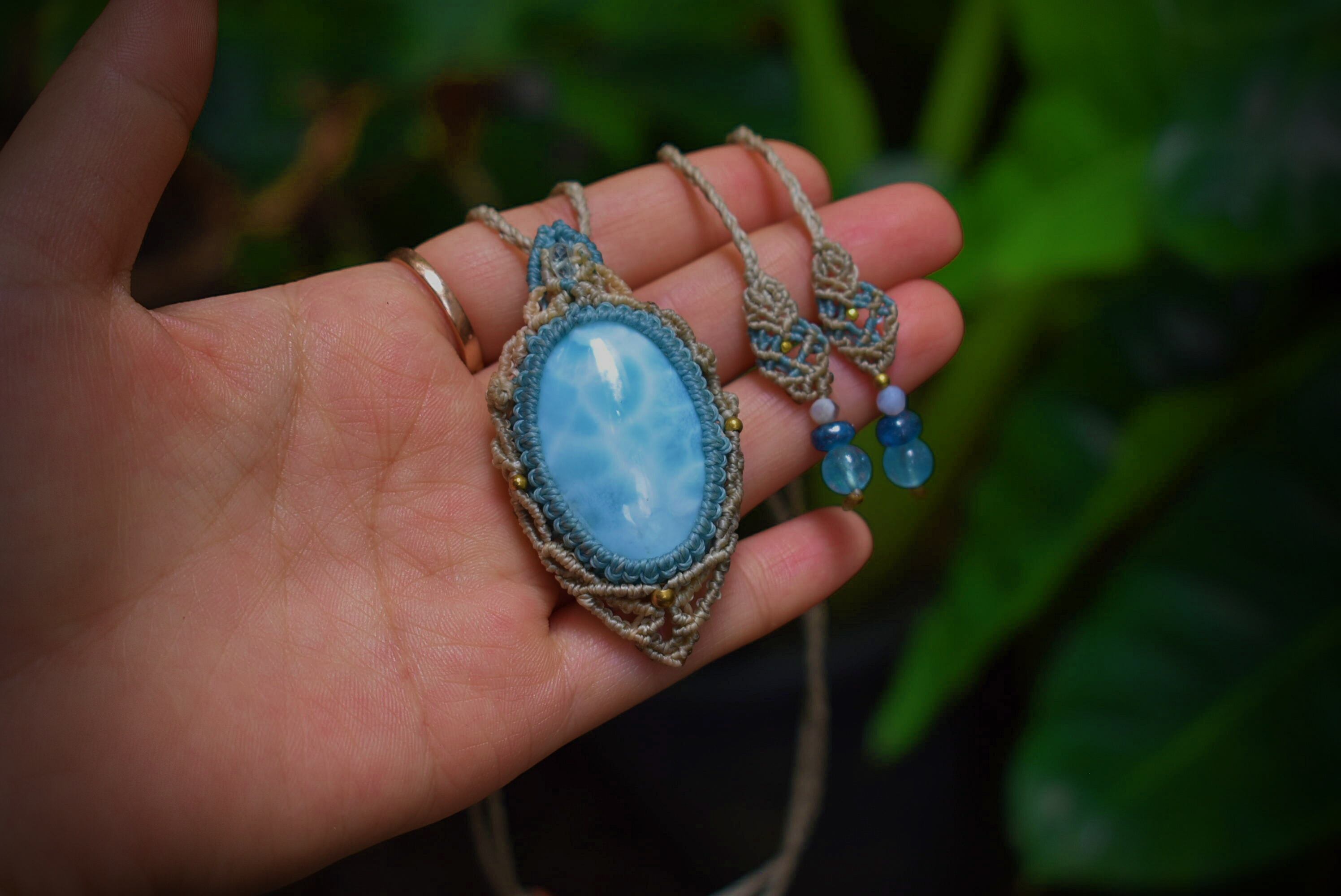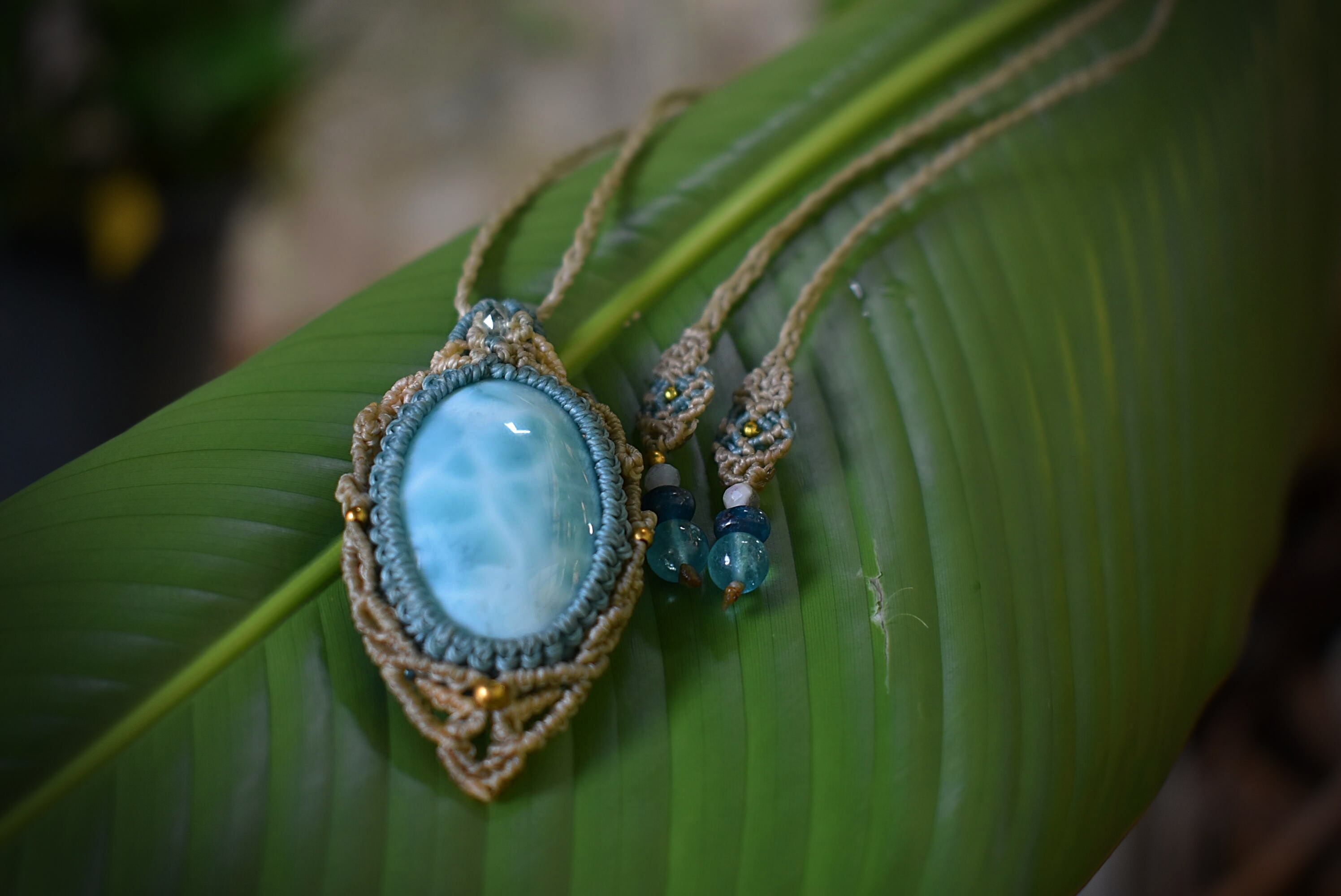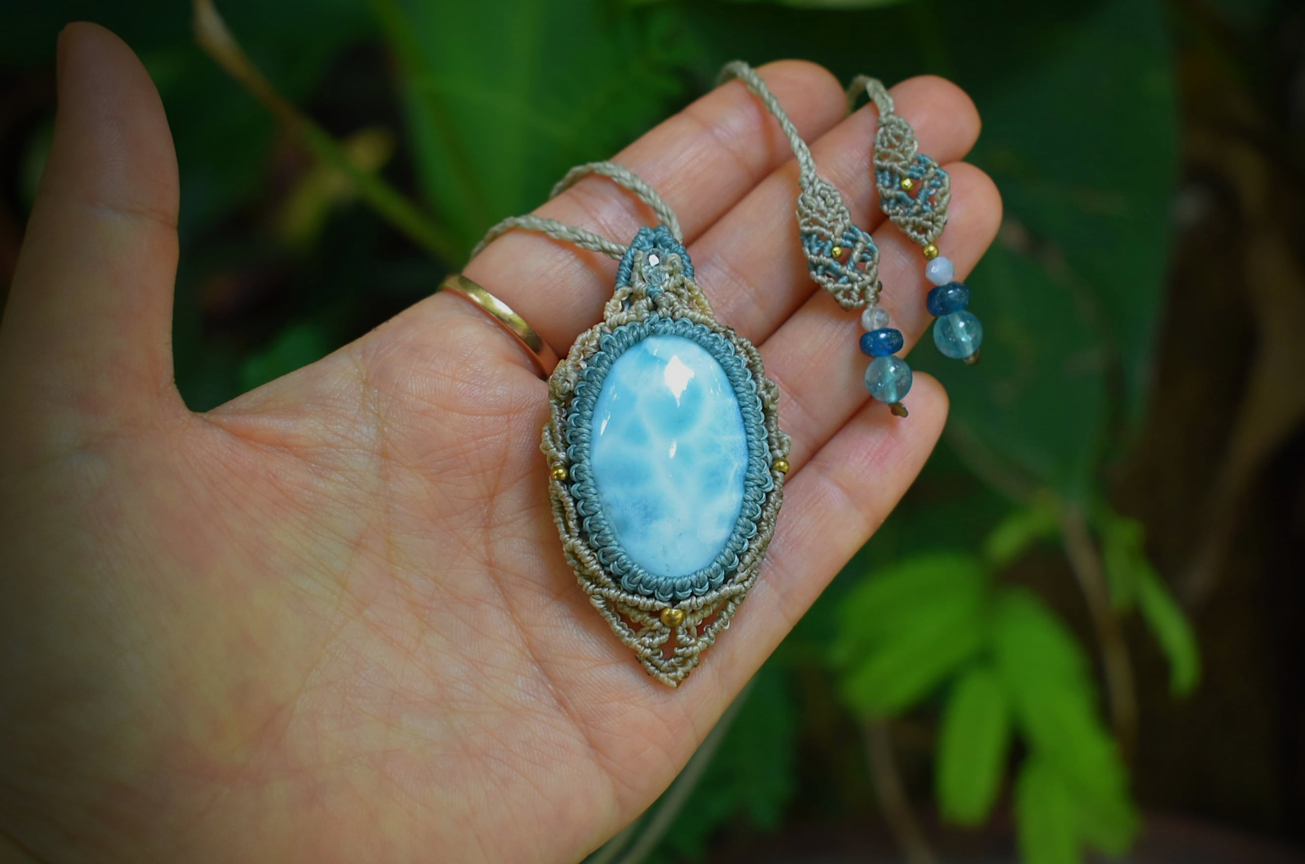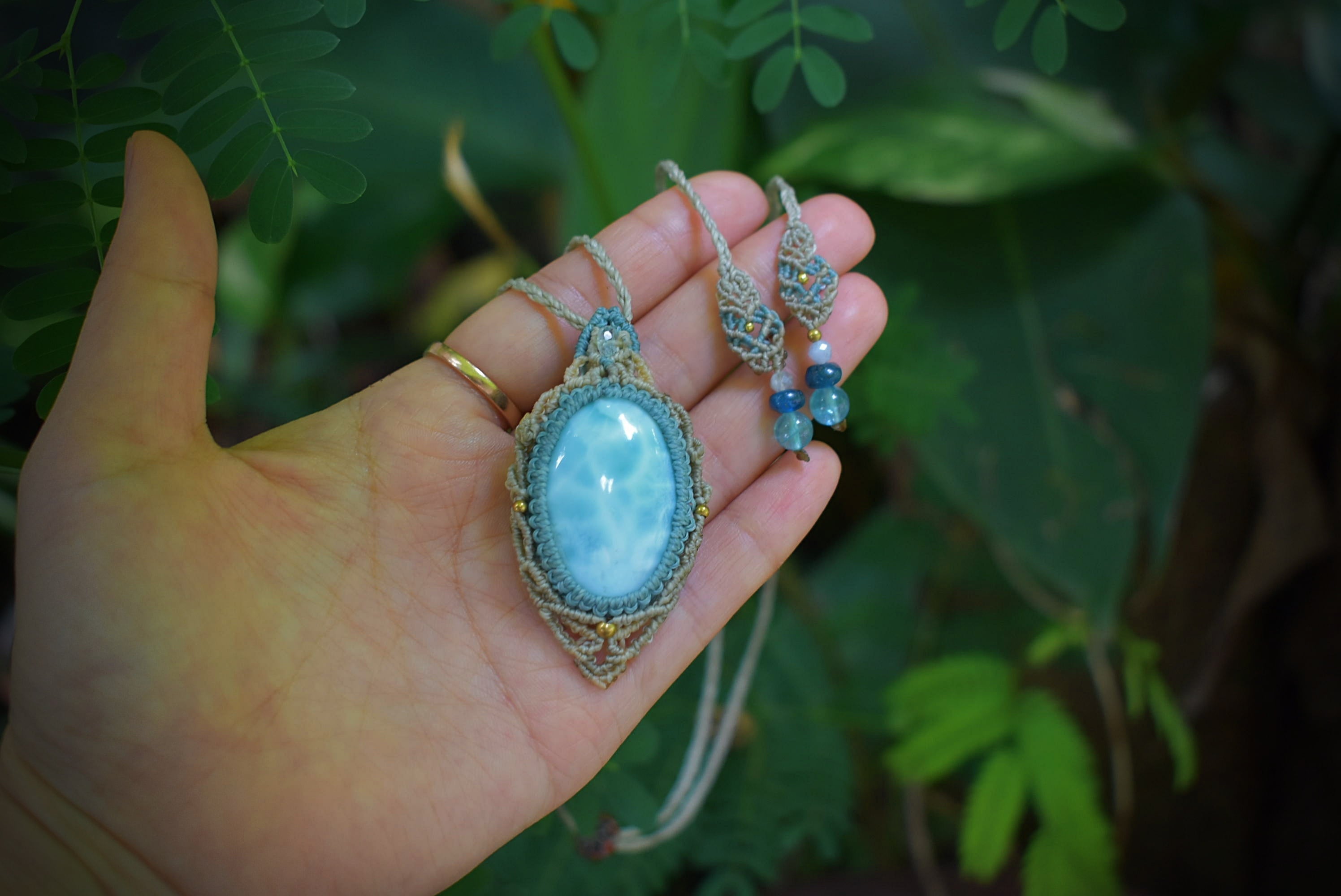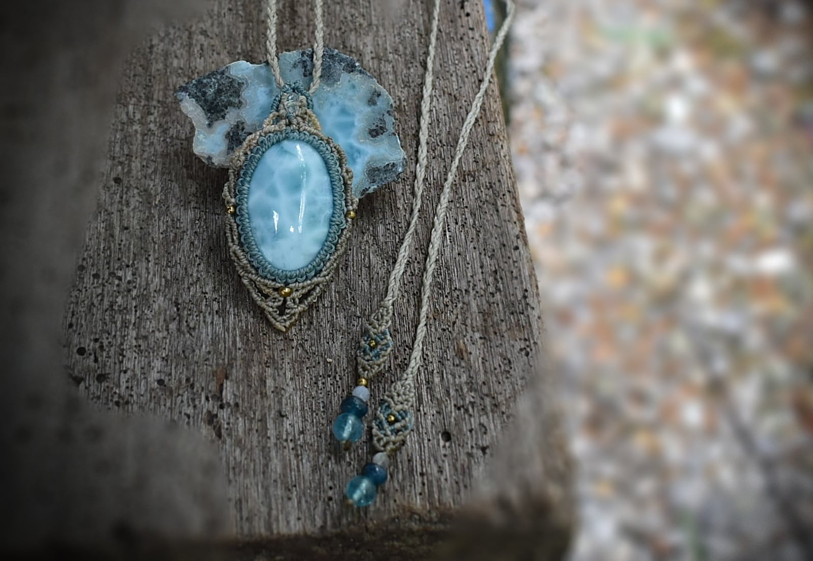 ◆このたびはヘンプ、差し色としてスカイブルー2色の蝋引き糸を使用しマクラメ編み装飾を施しました。