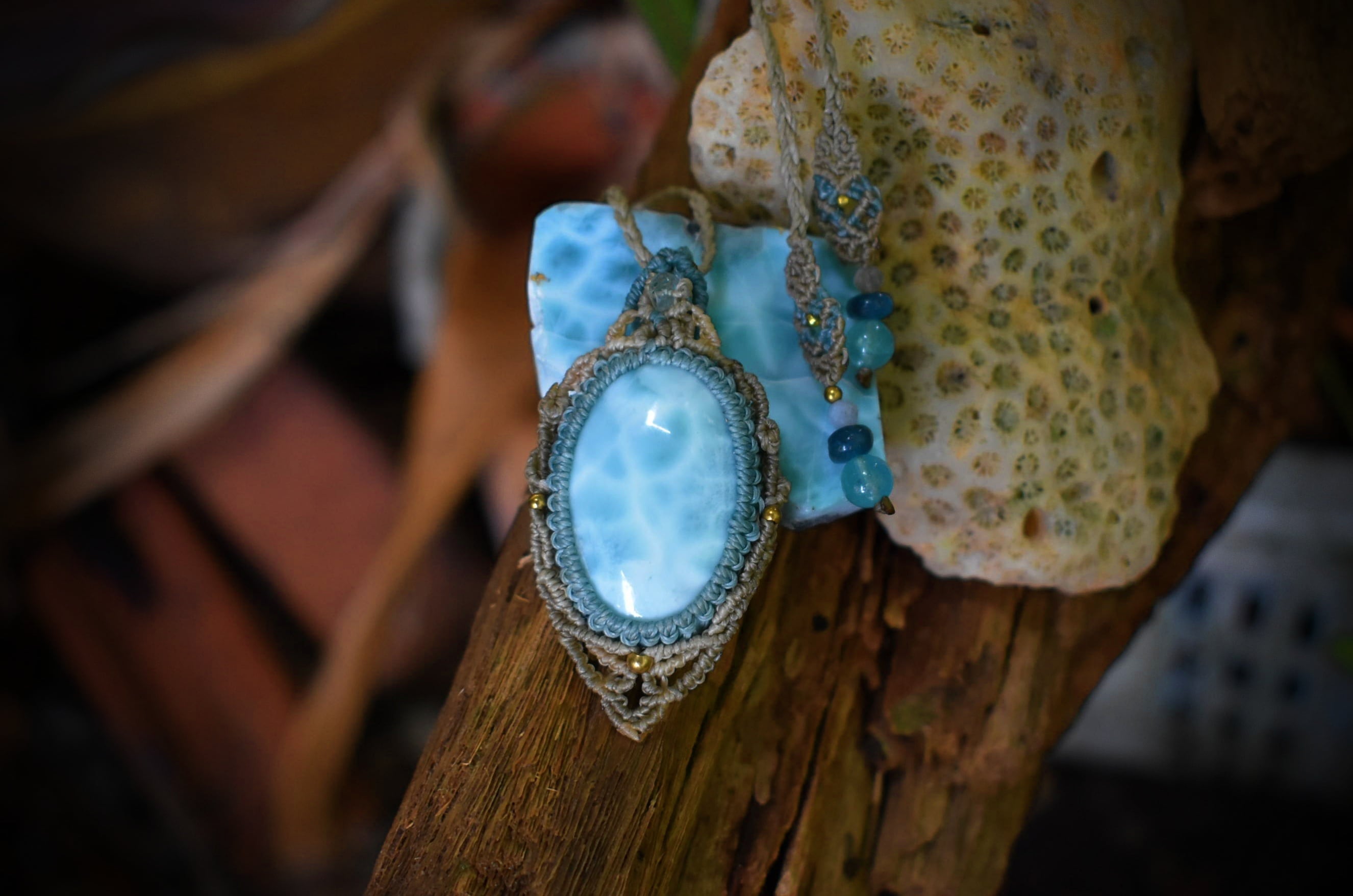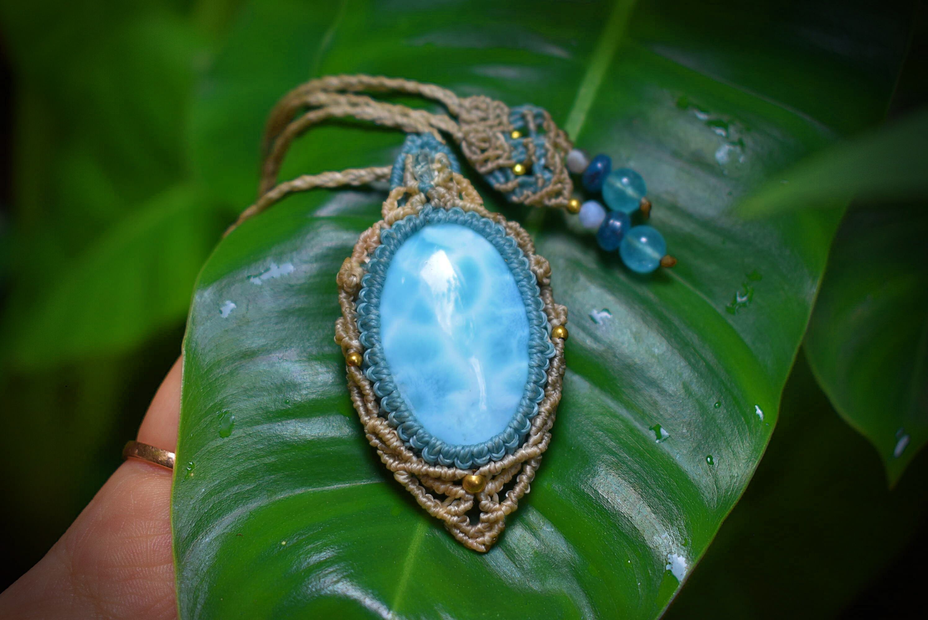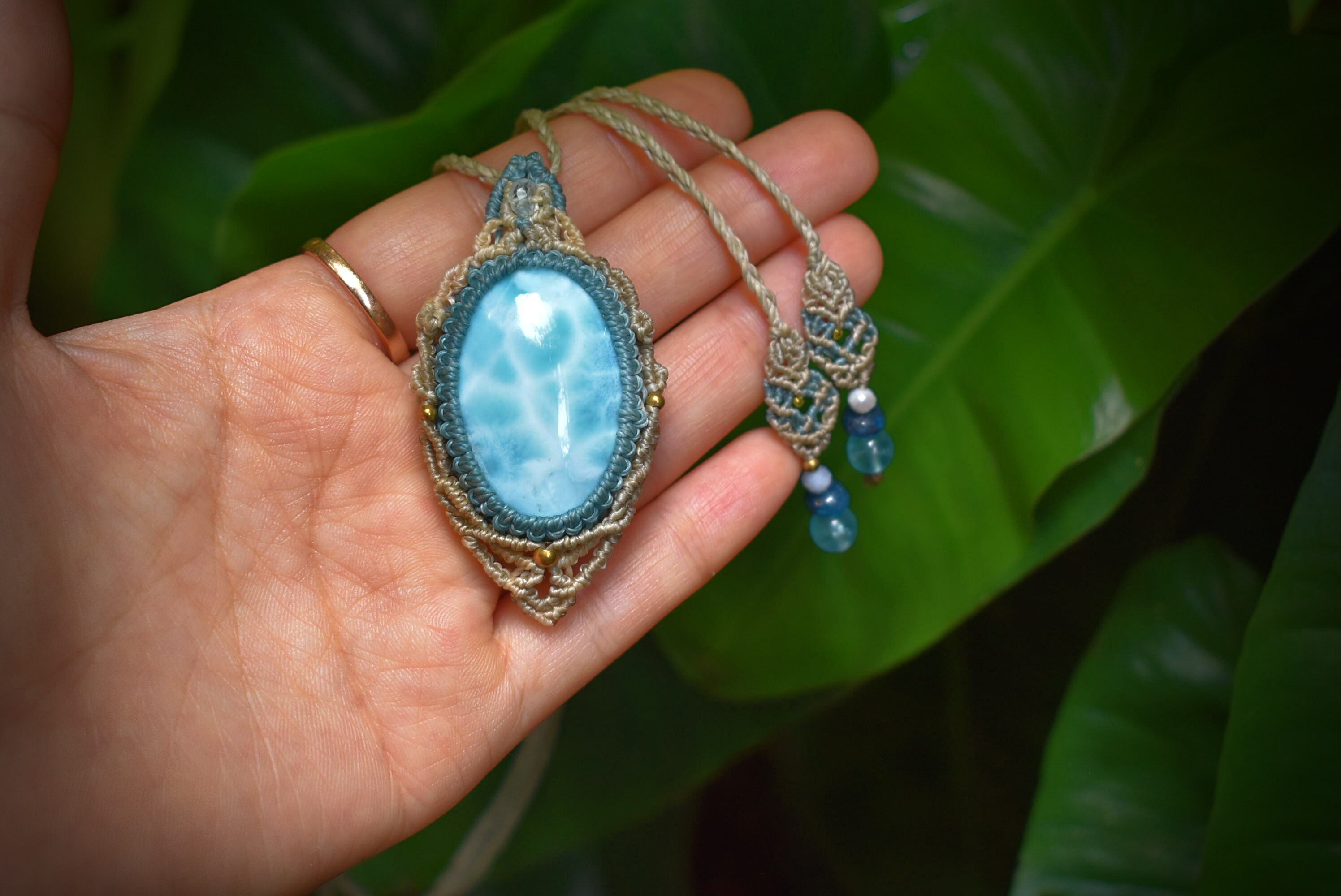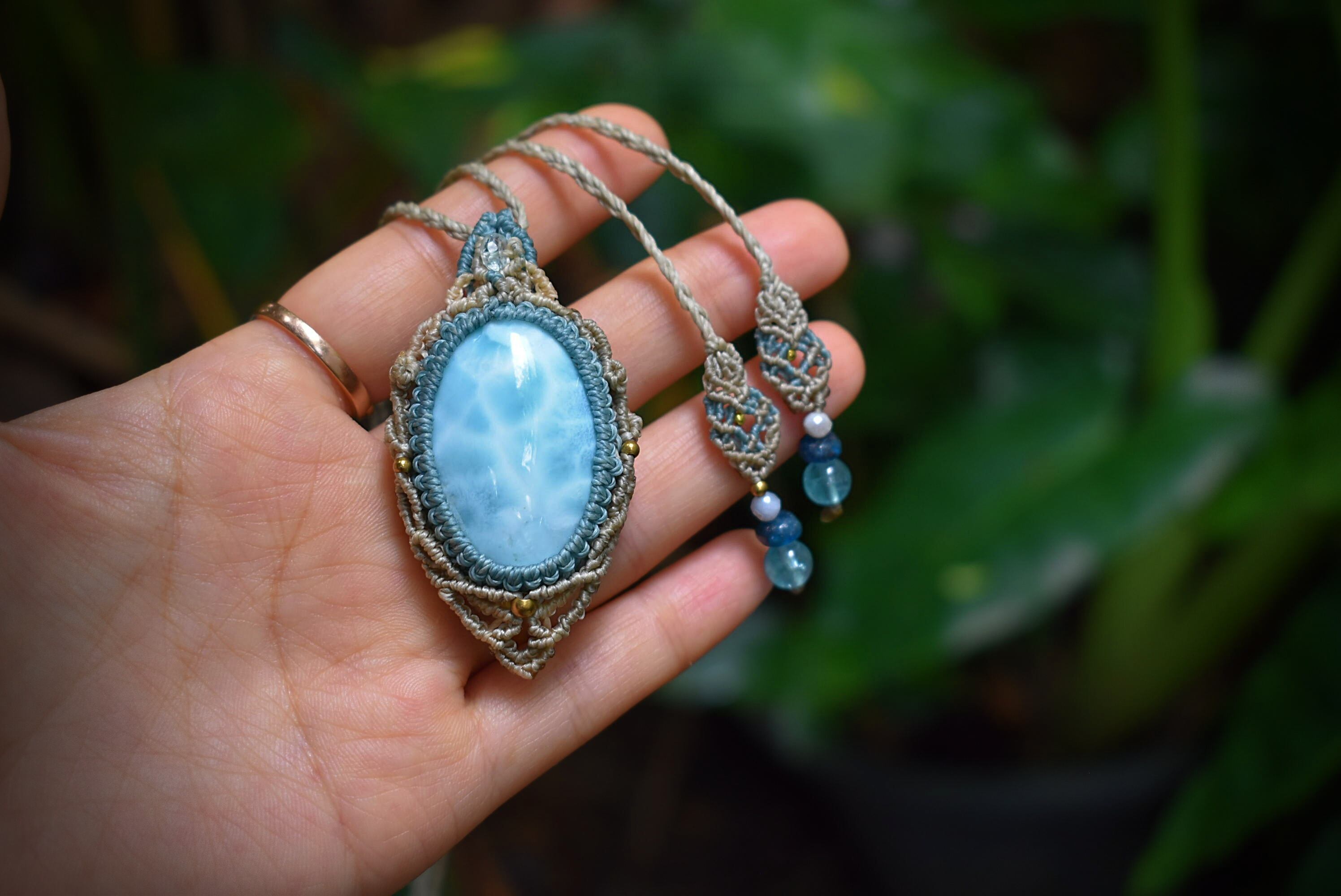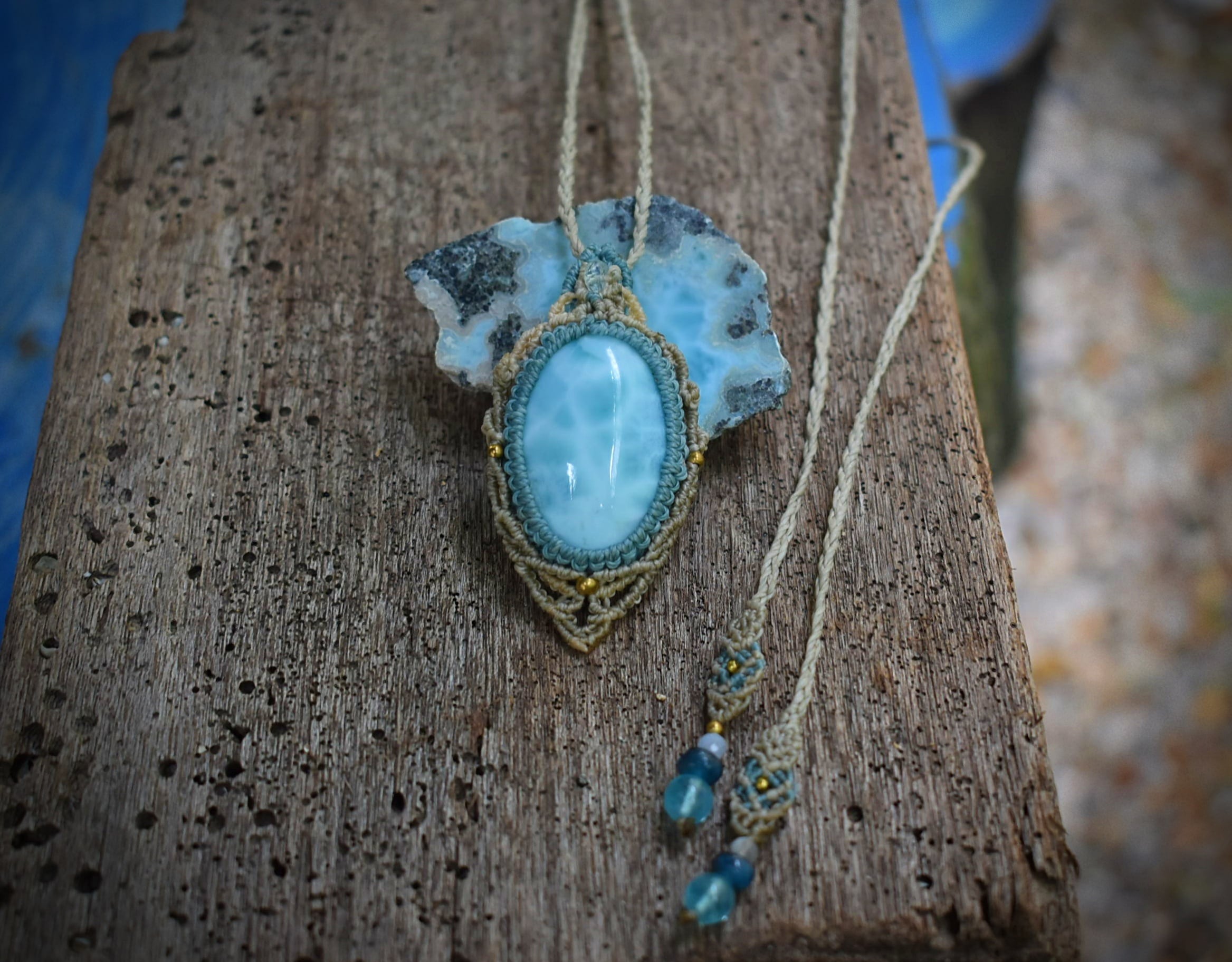 ◆このたびはヘンプ、差し色としてスカイブルー2色の蝋引き糸を使用しマクラメ編み装飾を施しました。