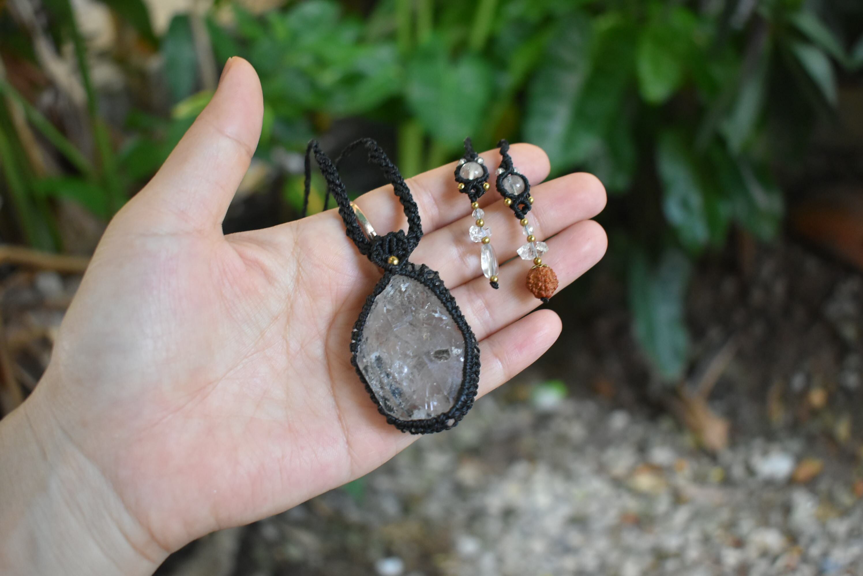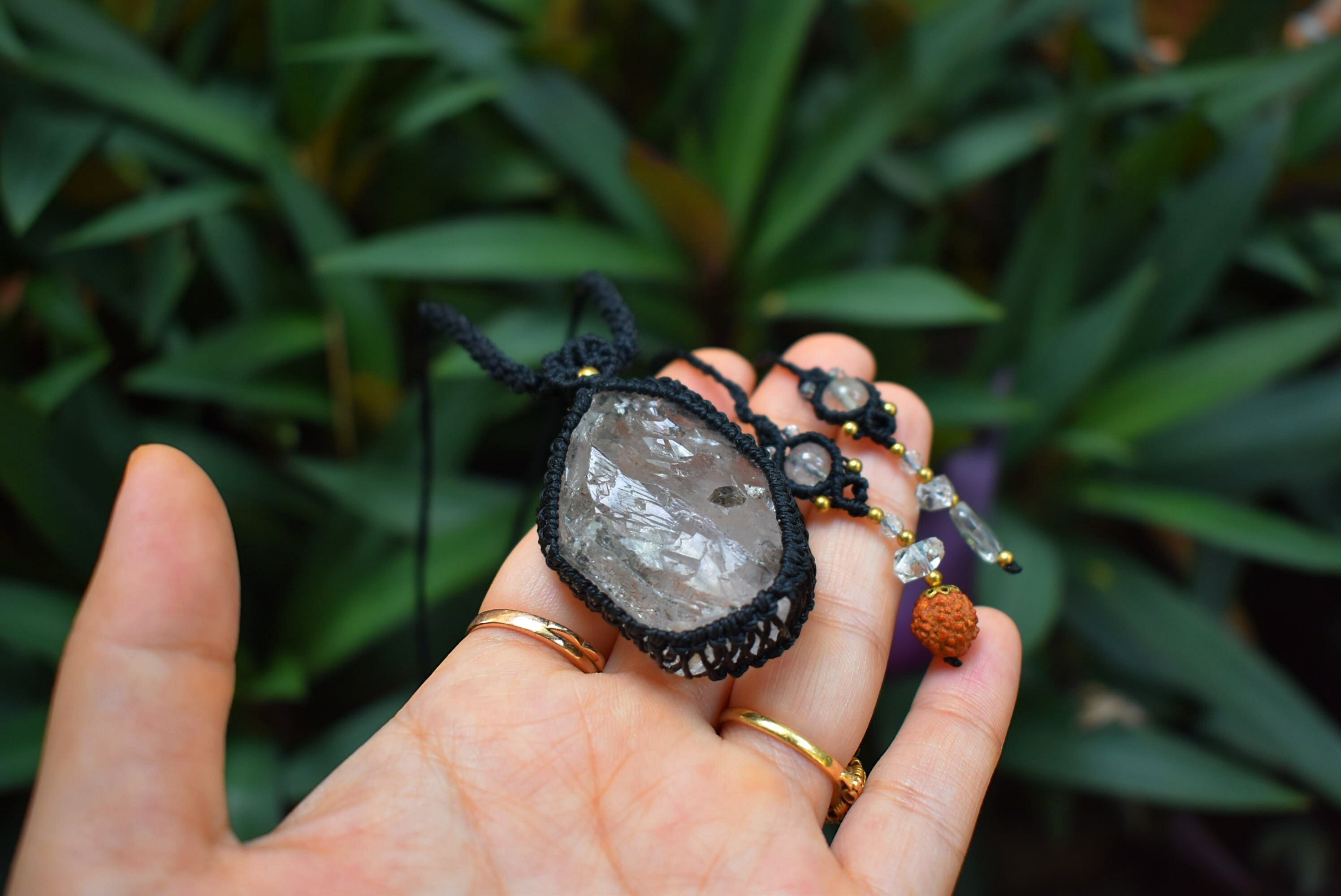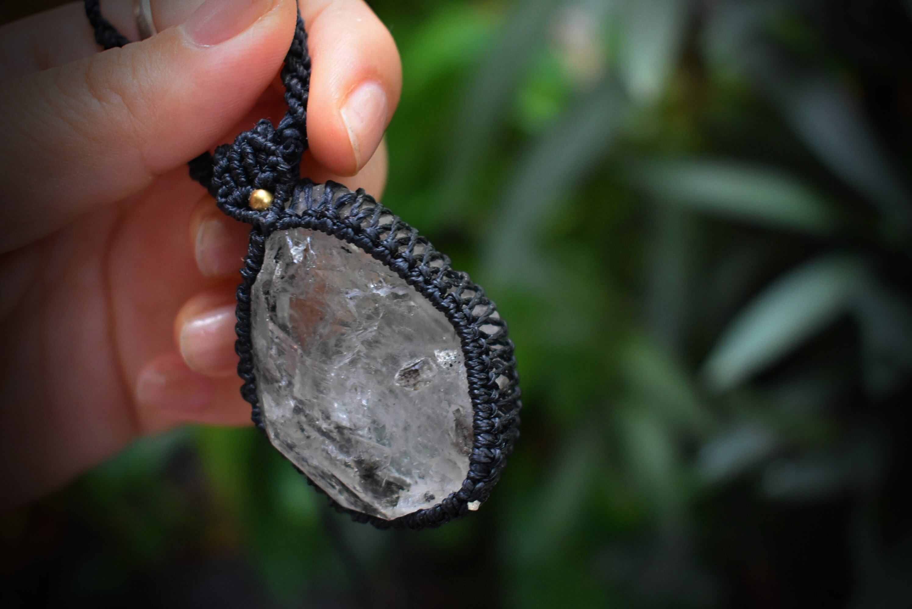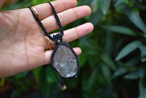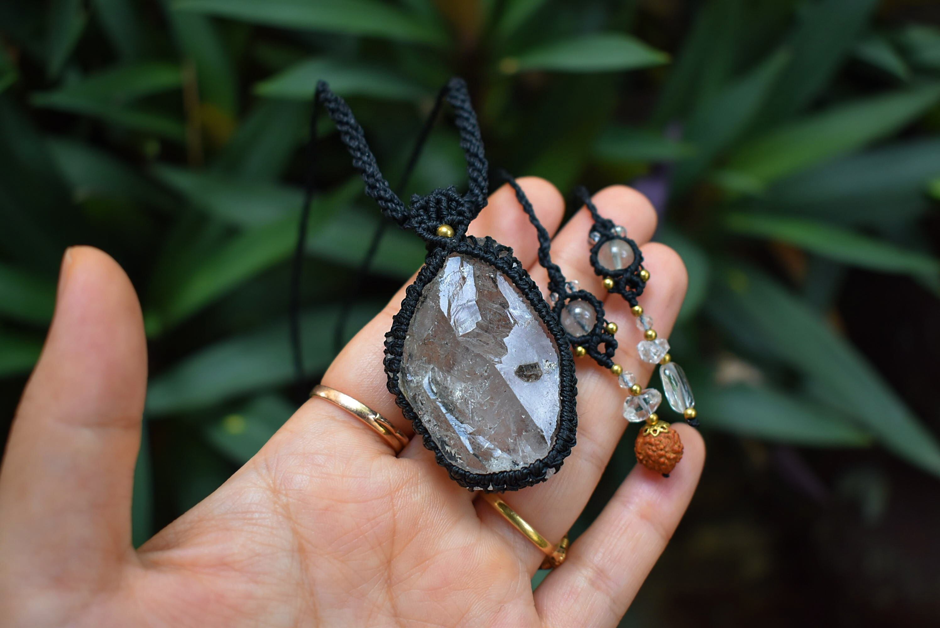 ポツンと小粒のクローライトがくっついたハーキマーダイヤモンド水晶原石。大胆に研磨されたそのままの形をマクラメ編みペンダントとして仕上げました。表面にはな七色に輝く虹のインクルージョンを見てとることができます。