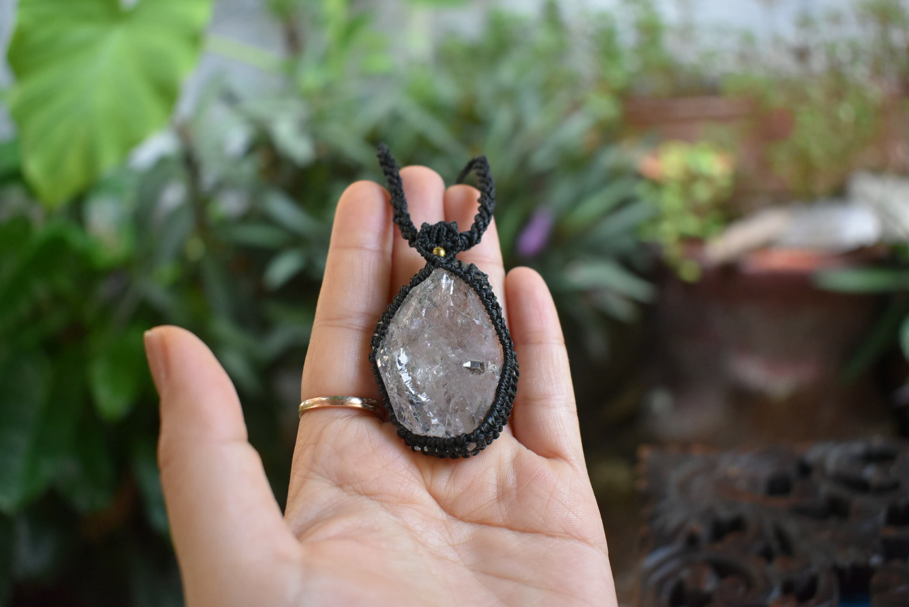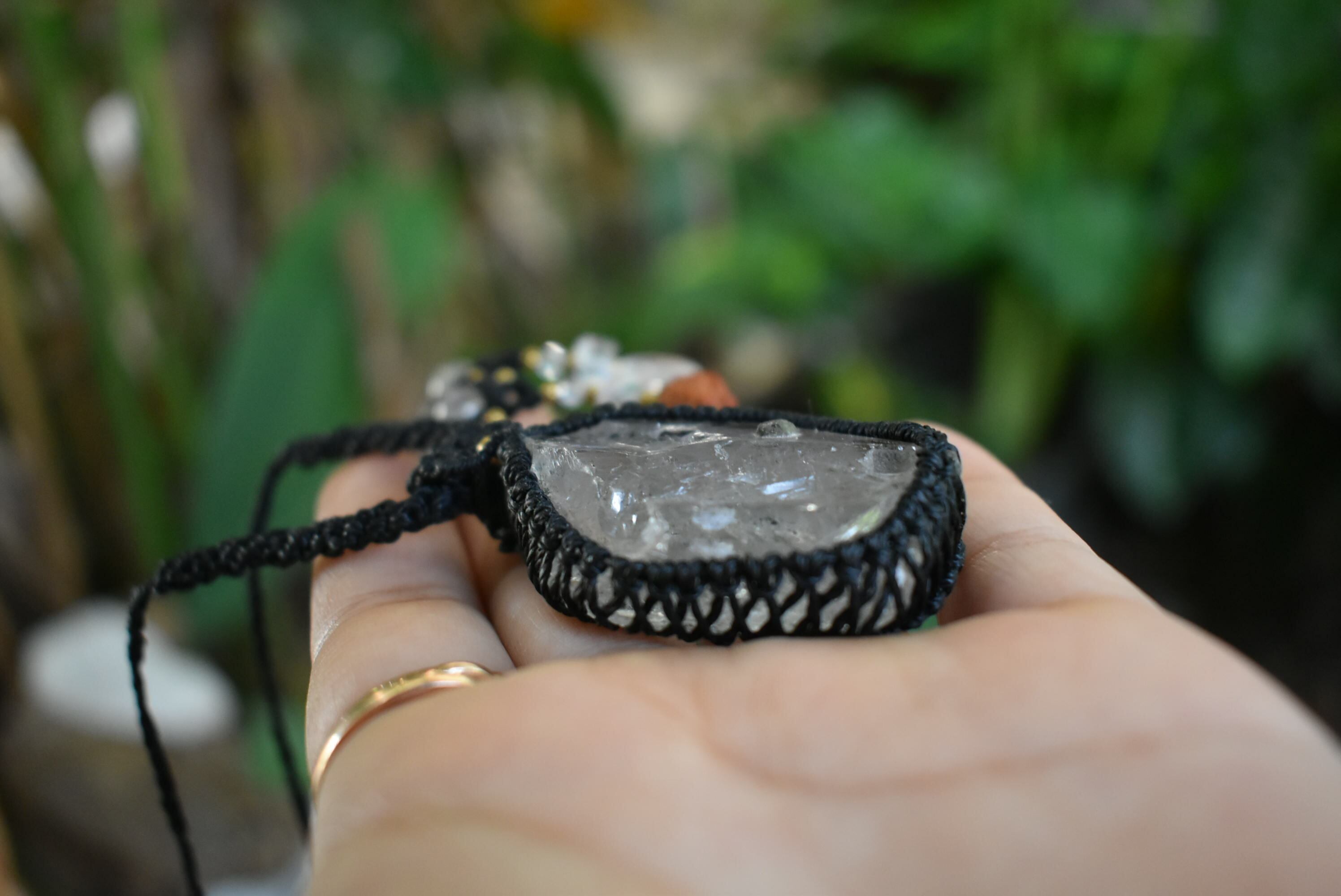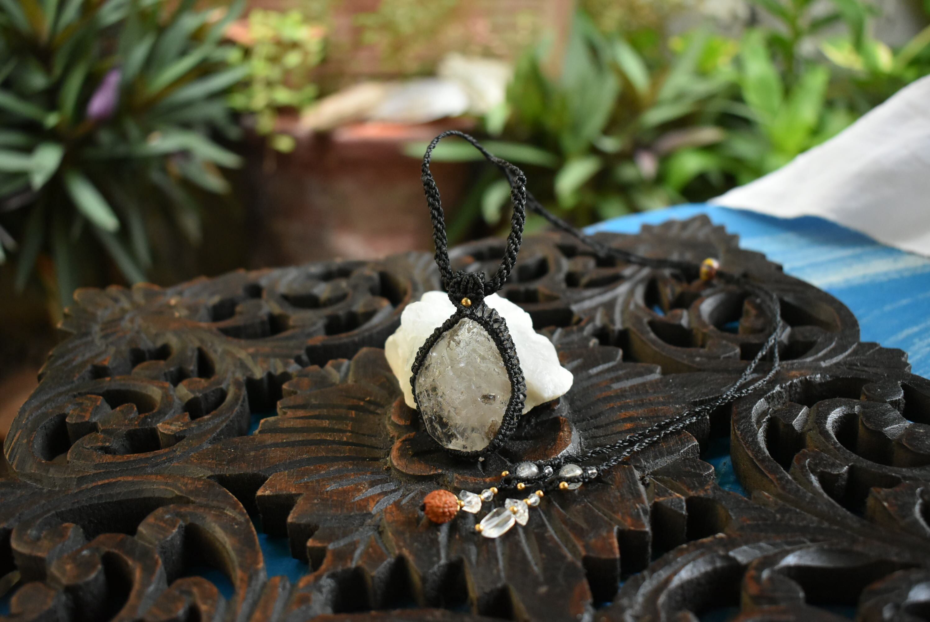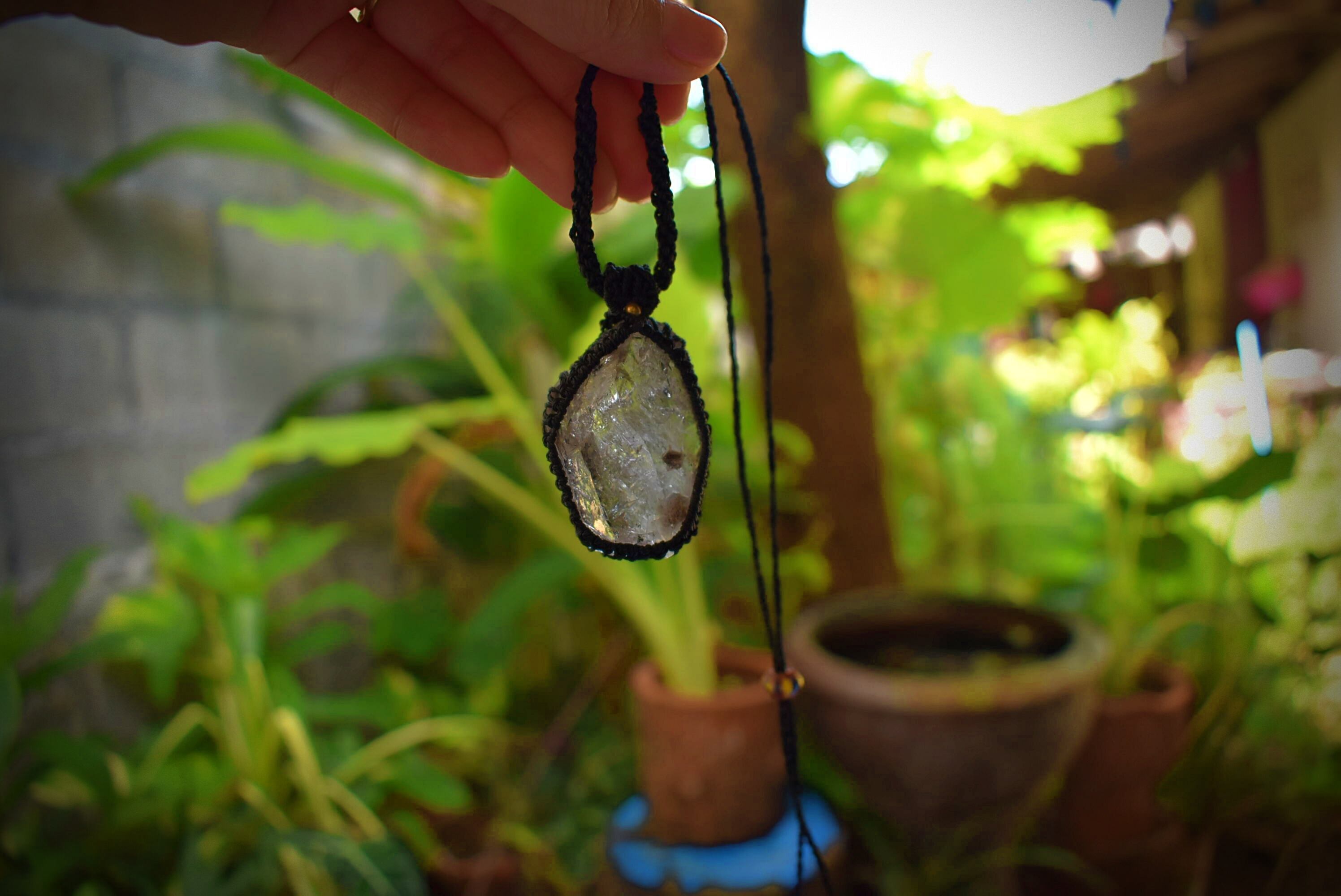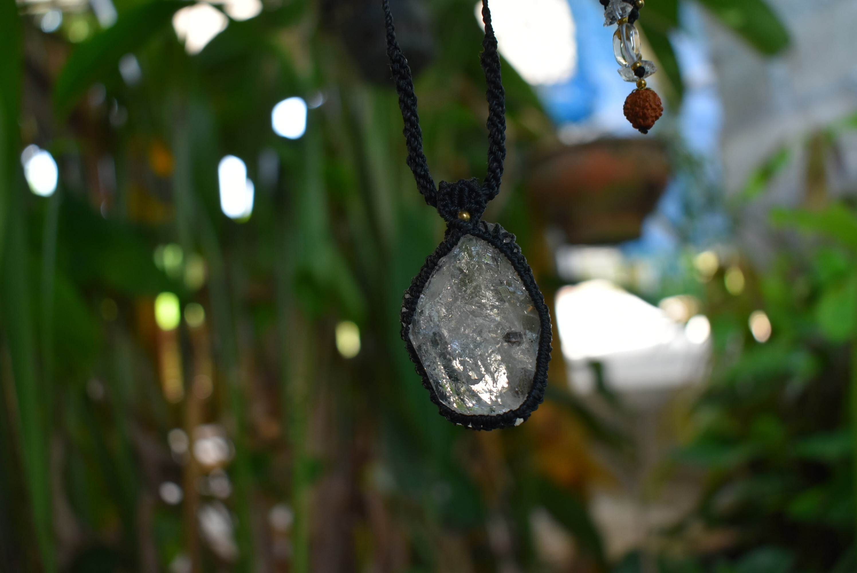 ポツンと小粒のクローライトがくっついたハーキマーダイヤモンド水晶原石。大胆に研磨されたそのままの形をマクラメ編みペンダントとして仕上げました。表面にはな七色に輝く虹のインクルージョンを見てとることができます。