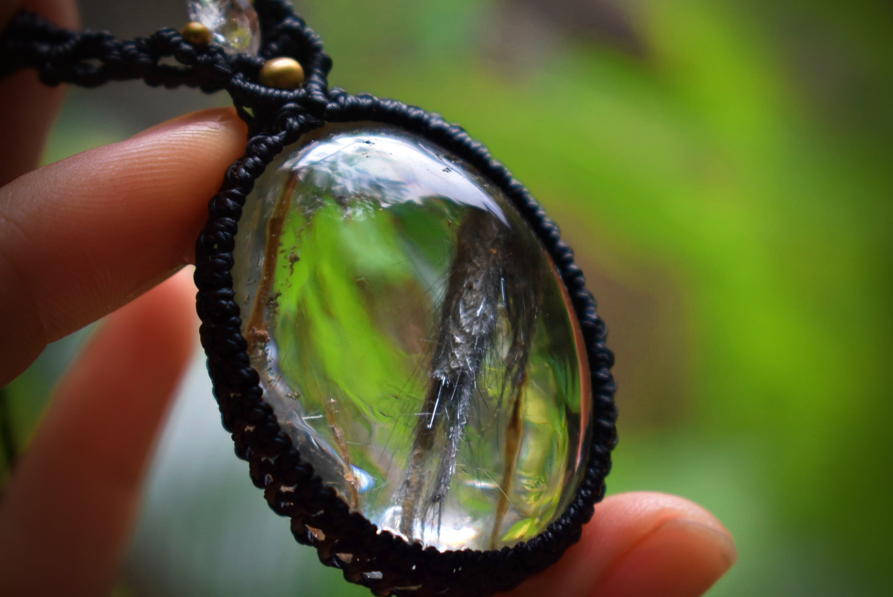プラチナカラー(シルバーカラー)と言われるルチルが水晶の中心にしっかり入り込んでいるルチルクォーツをネックレスにマクラメ編み装飾して仕上げました。プラチナからの広がる鋭いルチルとそれを取り巻く内包物、水晶の世界を堪能していただけるペンダント。