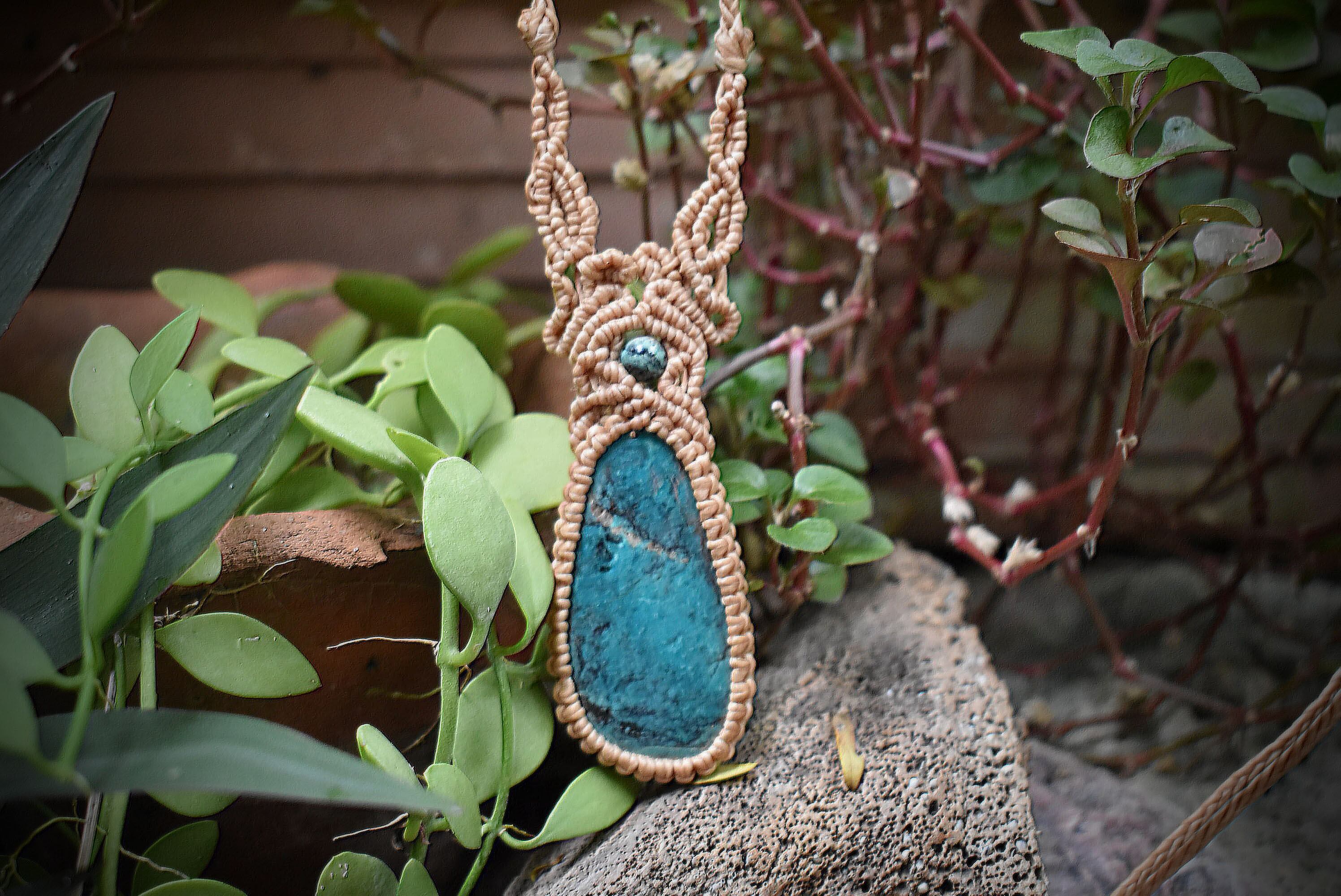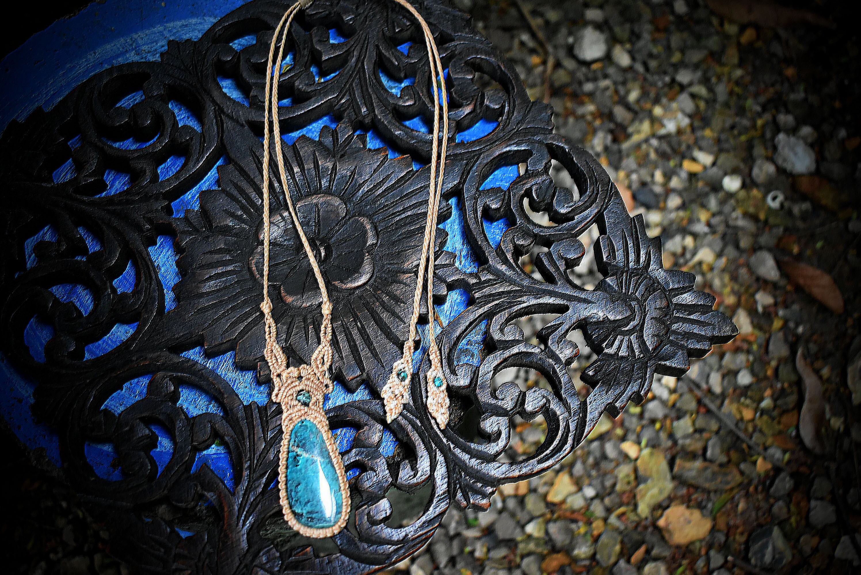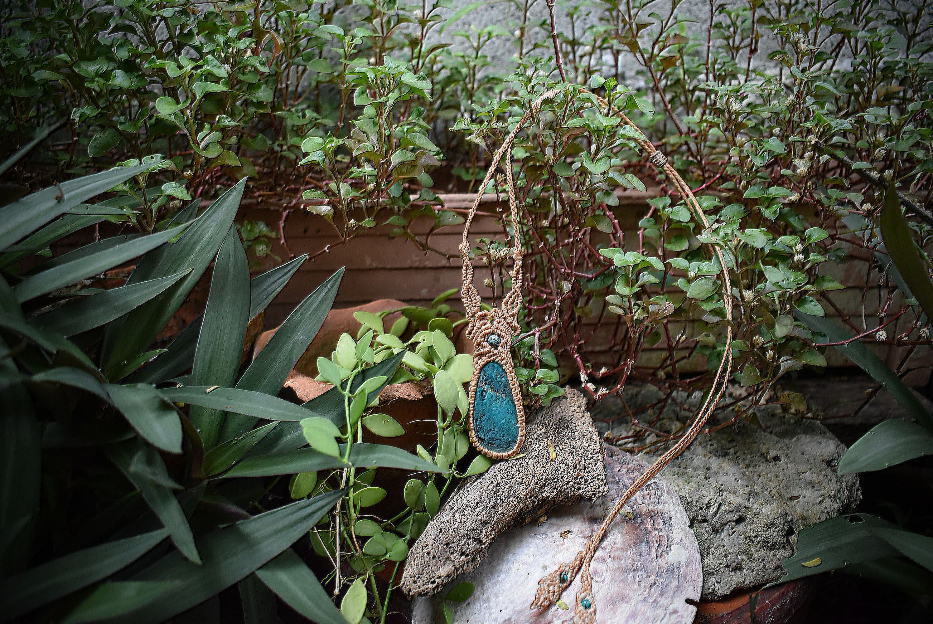 こちらは色味の美しいターコイズラフをペンダントに描いてマクラメ編み装飾を施しました。