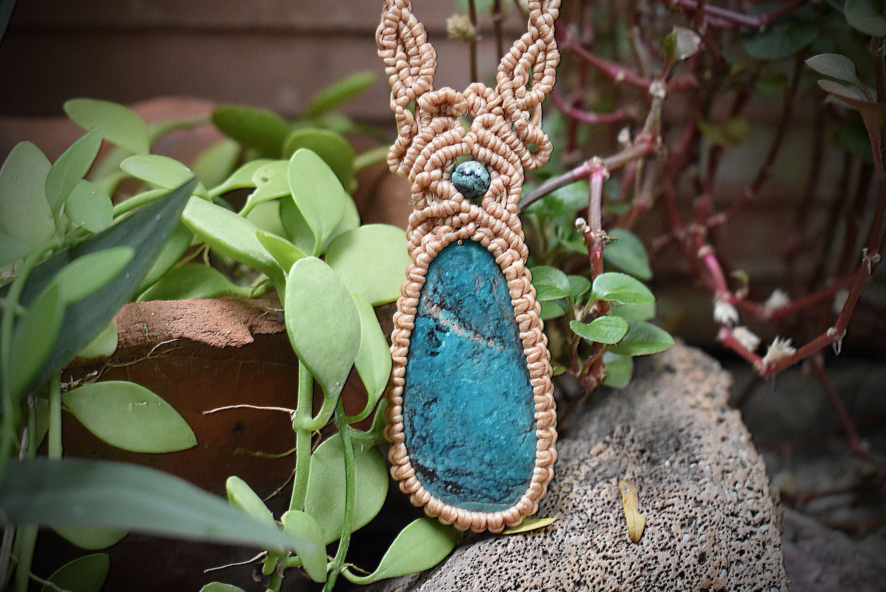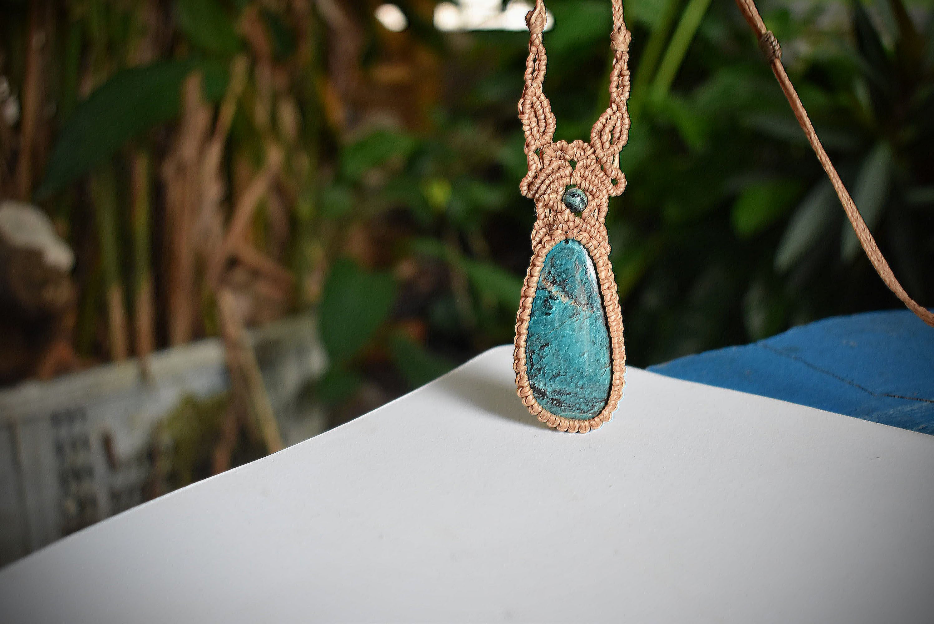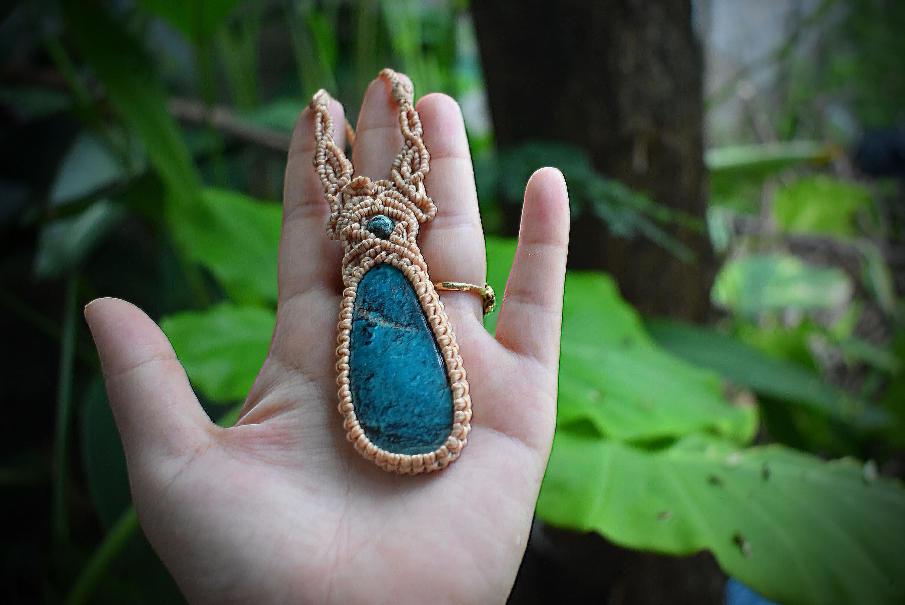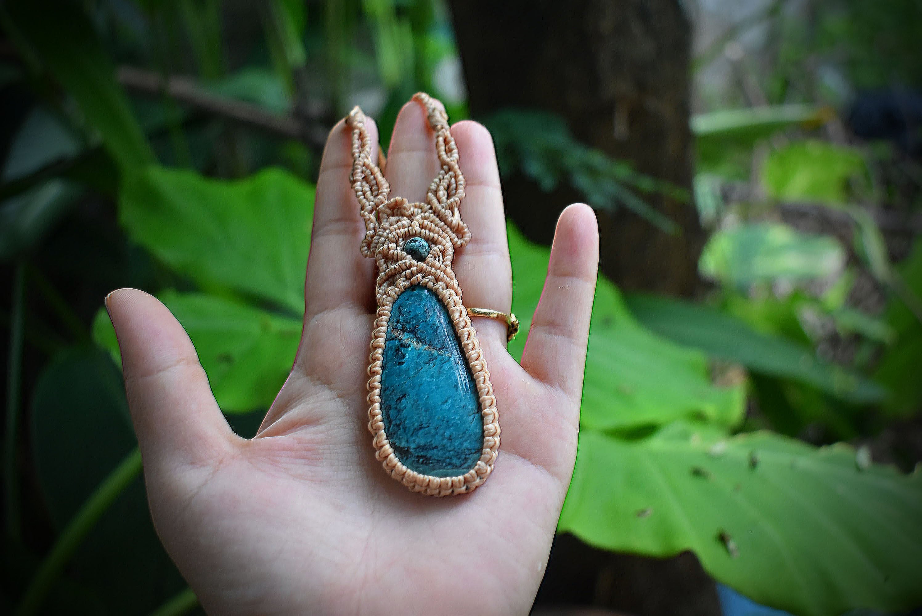 こちらは色味の美しいターコイズラフをペンダントに描いてマクラメ編み装飾を施しました。