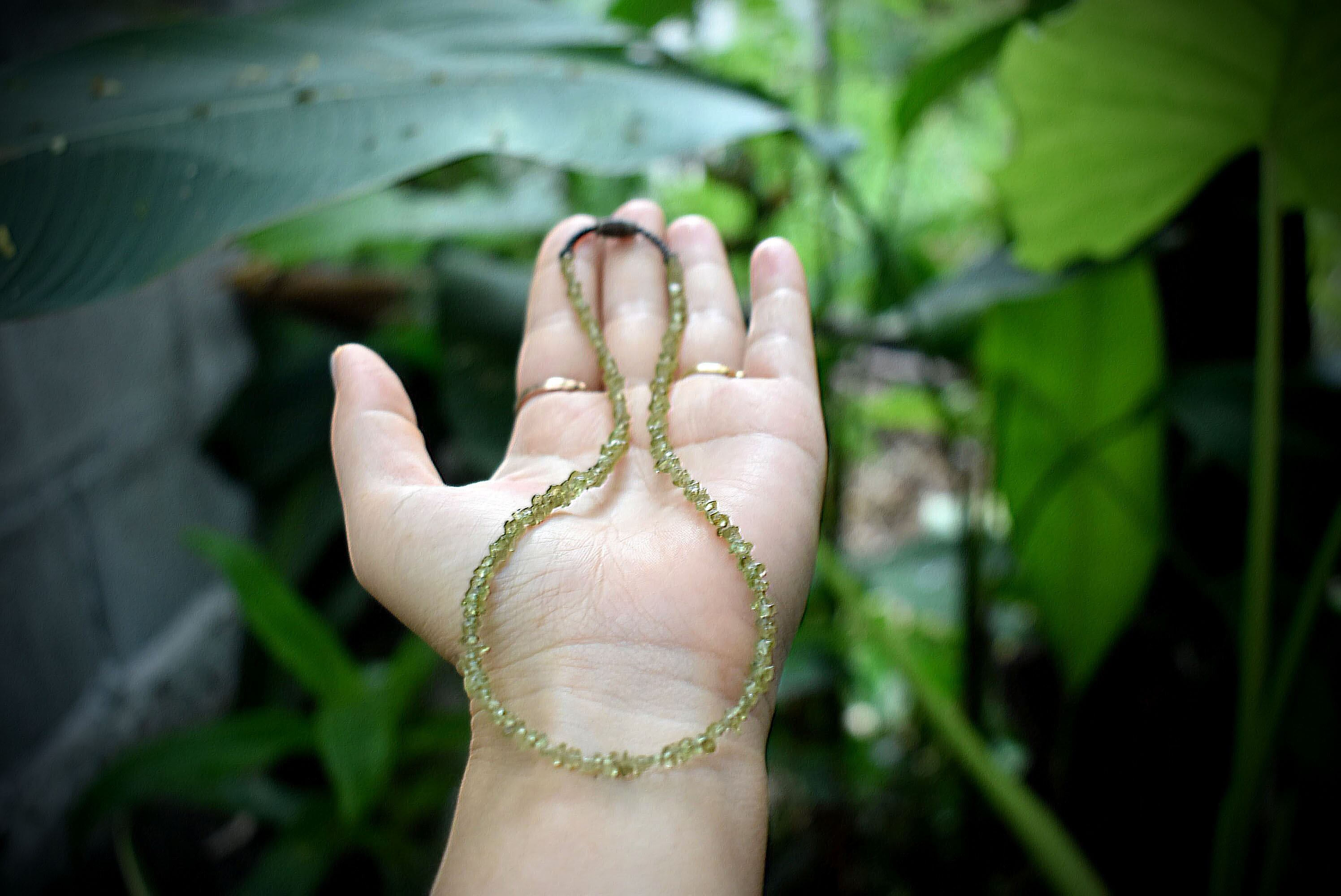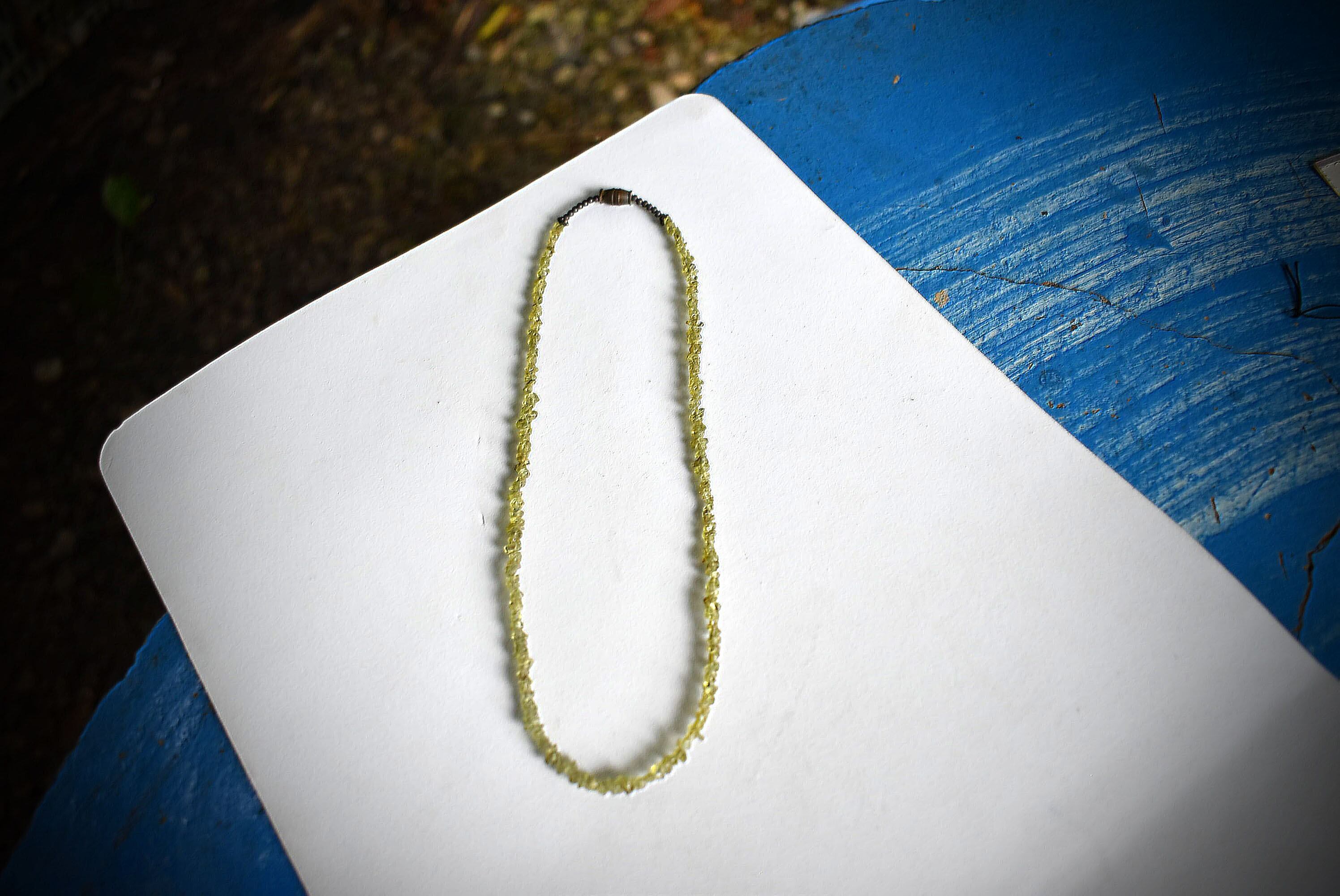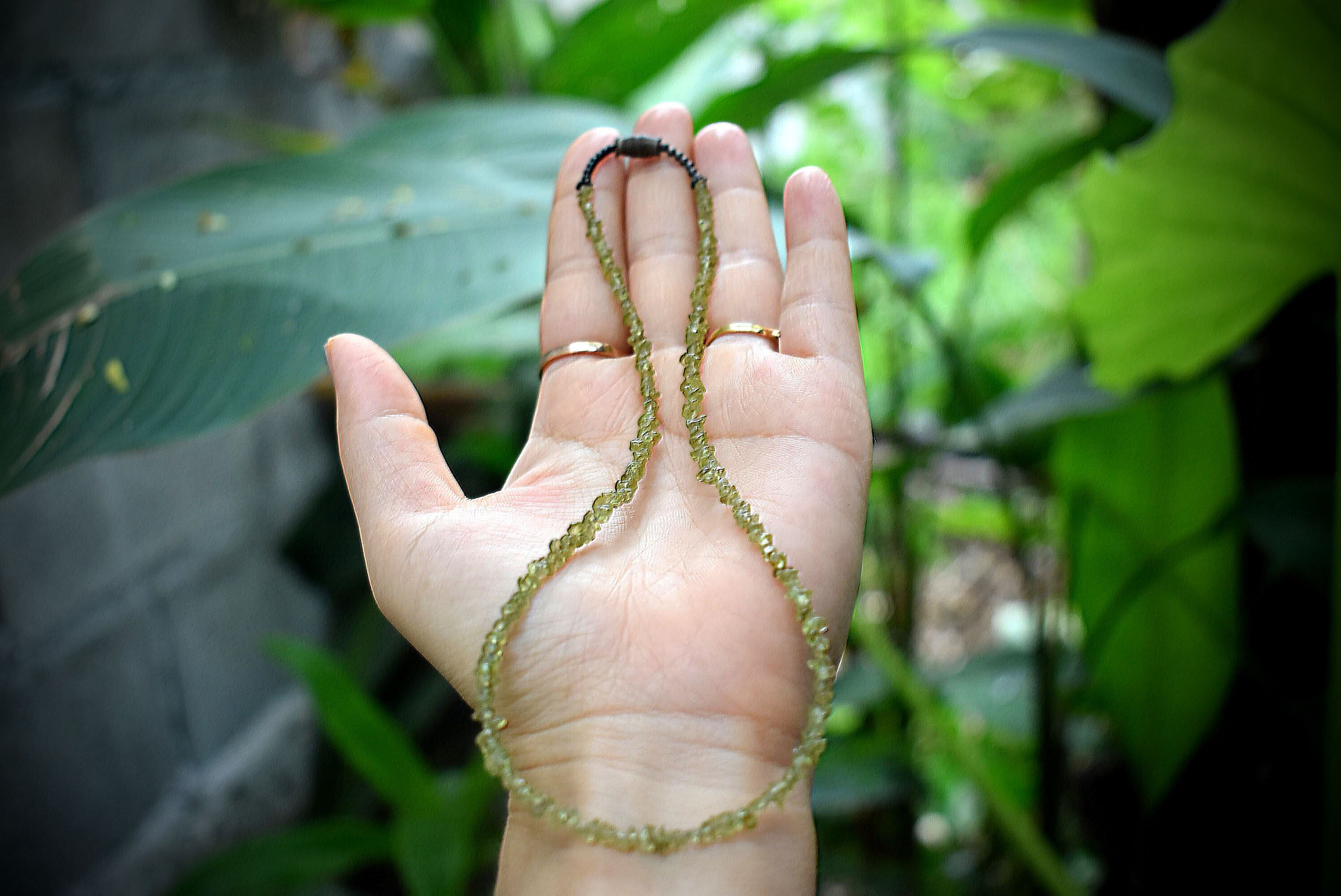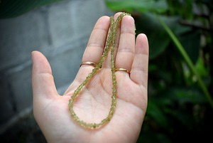 高品質なペリドット細石にひとつひとつ穴をあけ、重ね合わせたネックレスを制作しました。