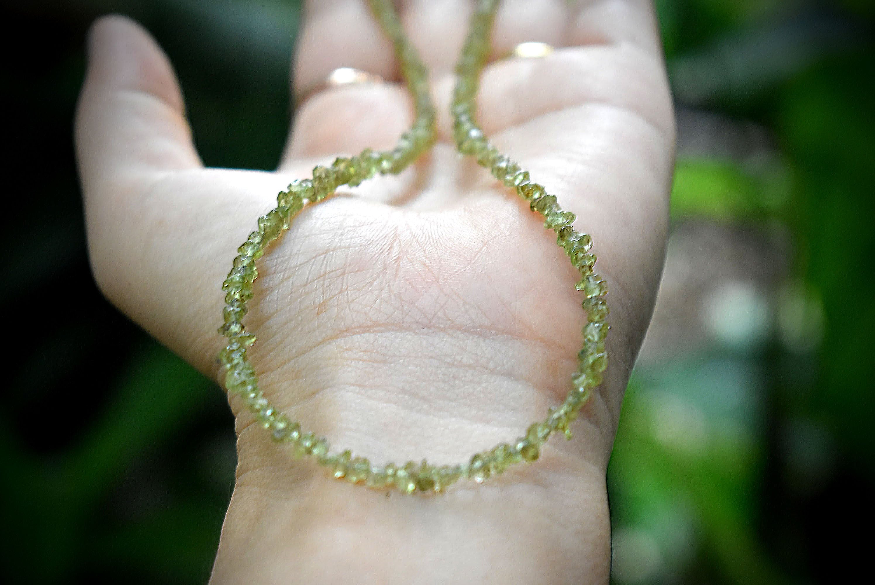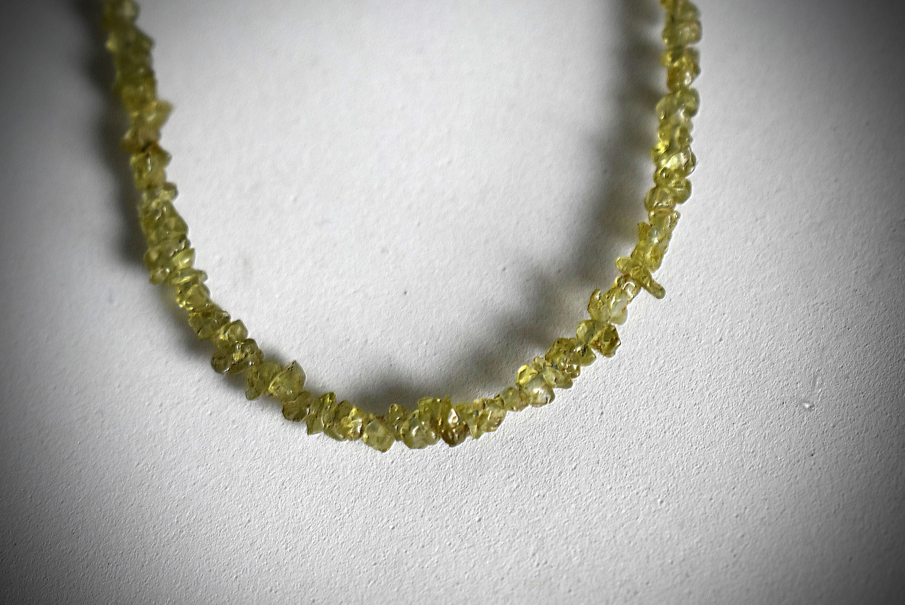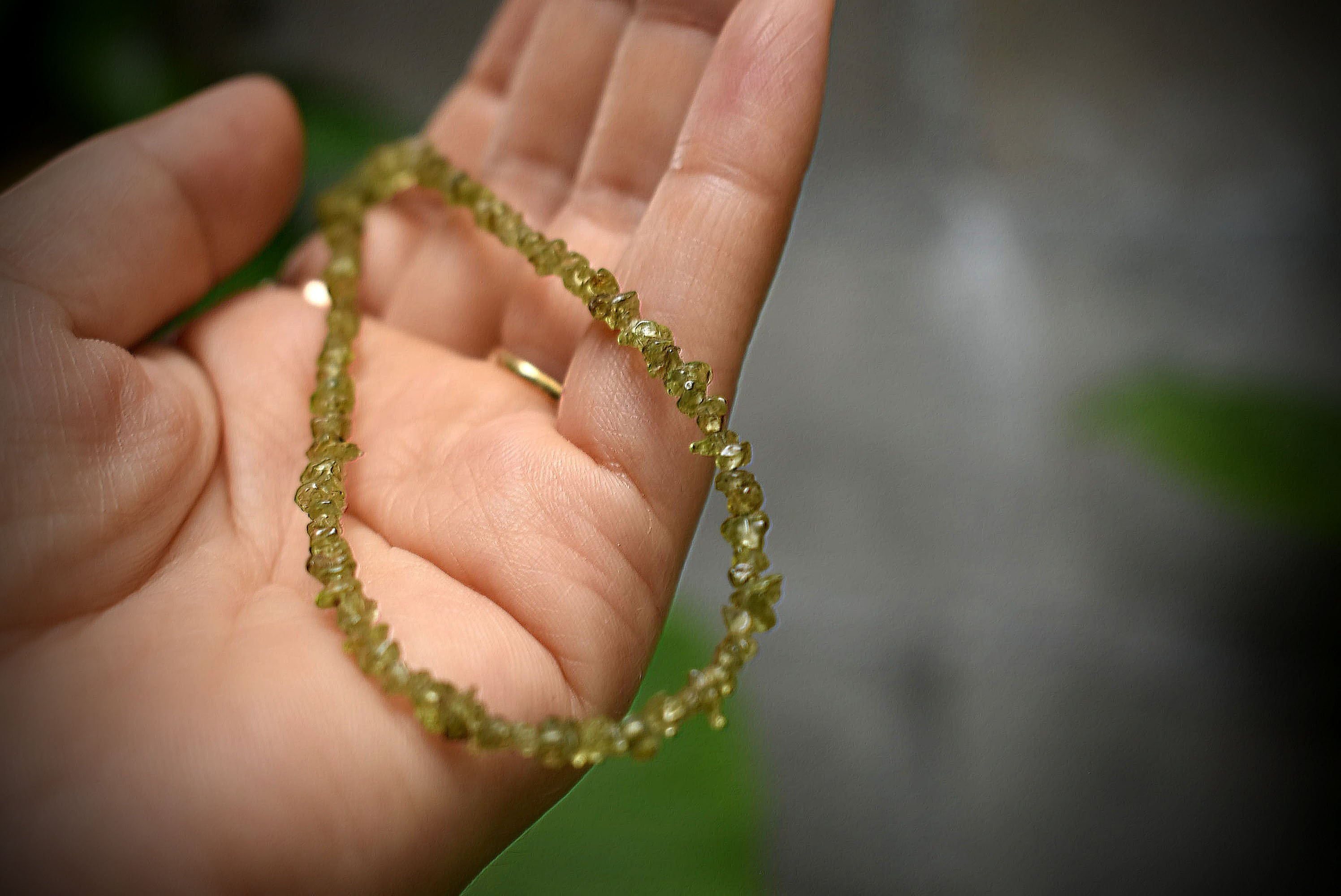 高品質なペリドット細石にひとつひとつ穴をあけ、重ね合わせたネックレスを制作しました。