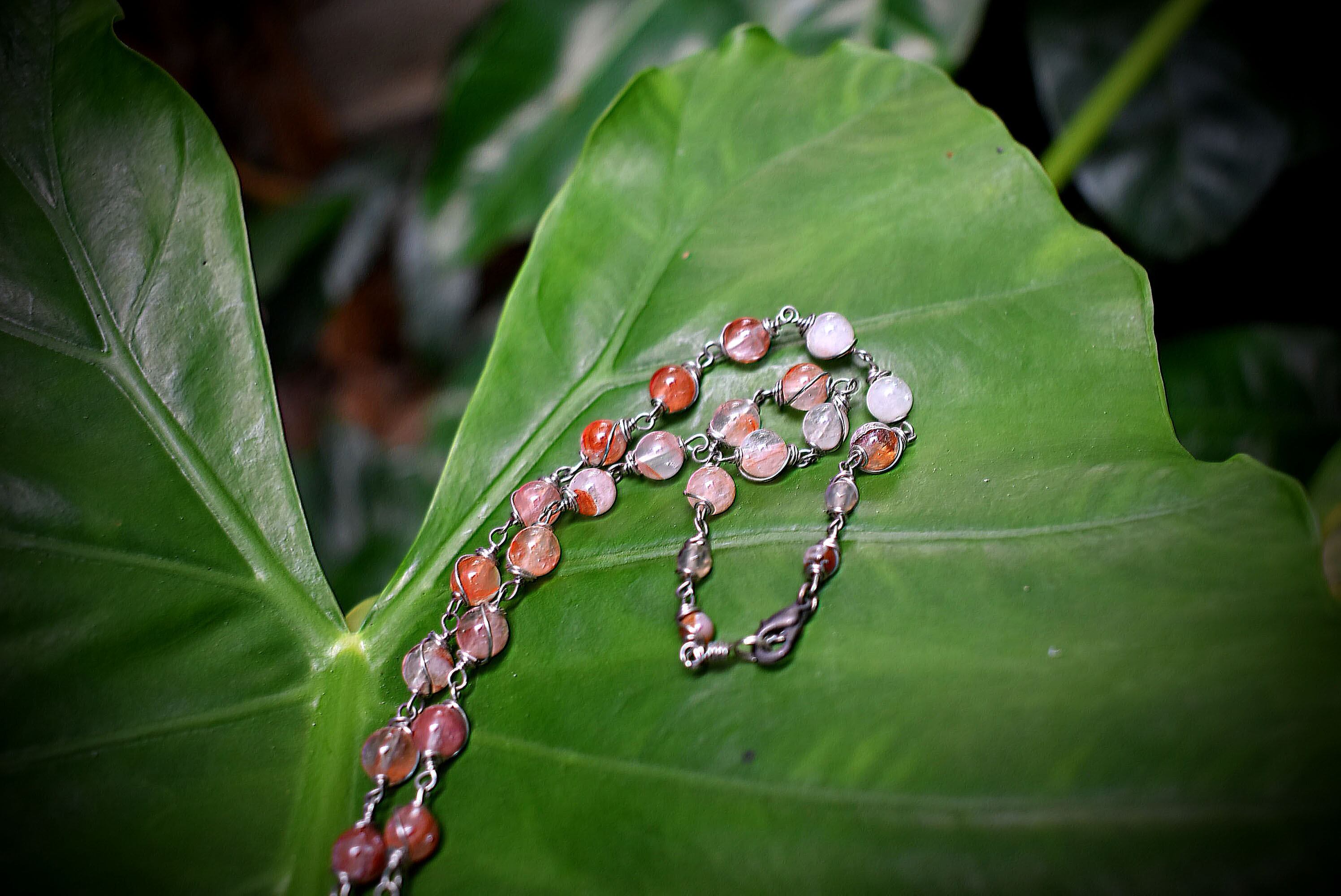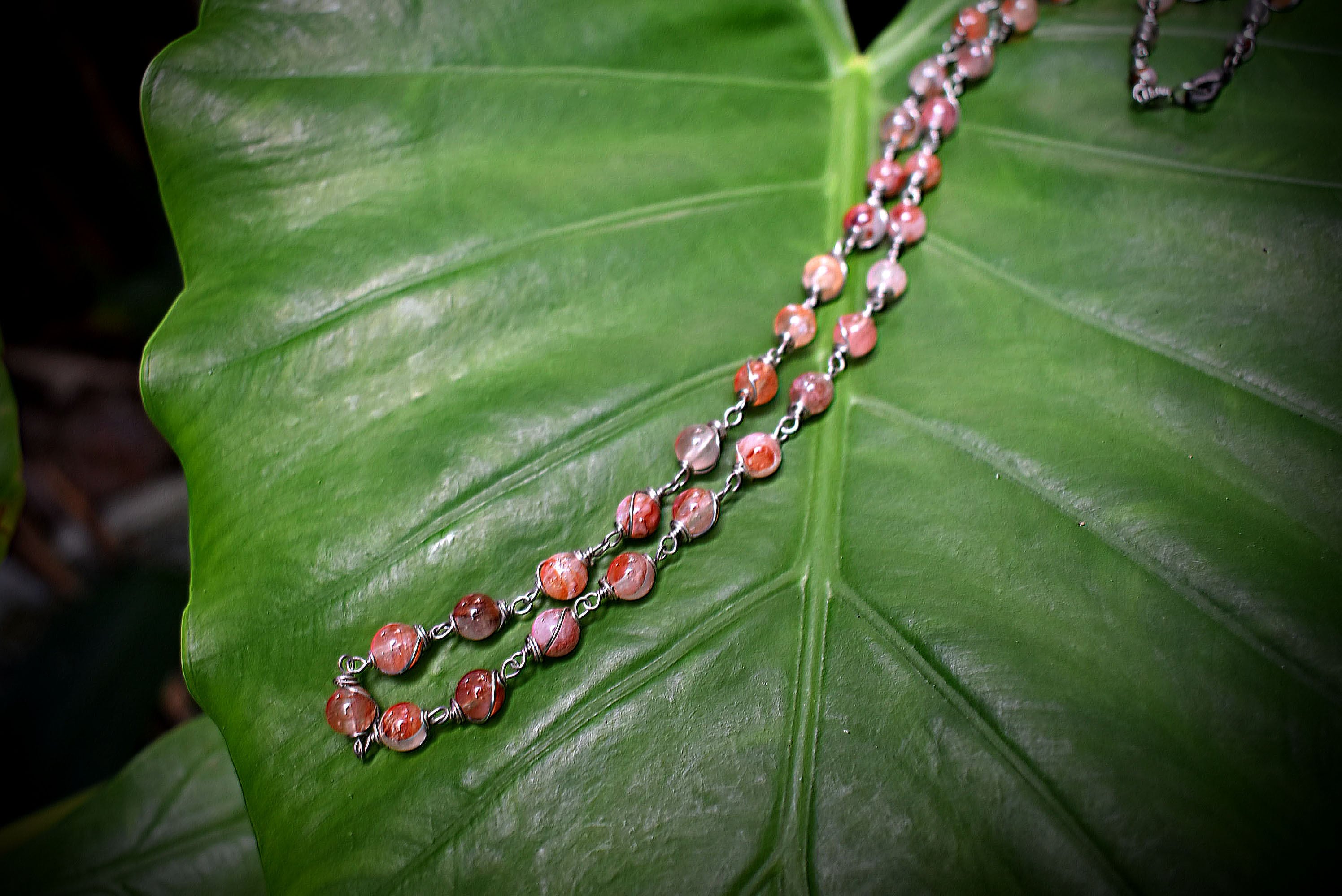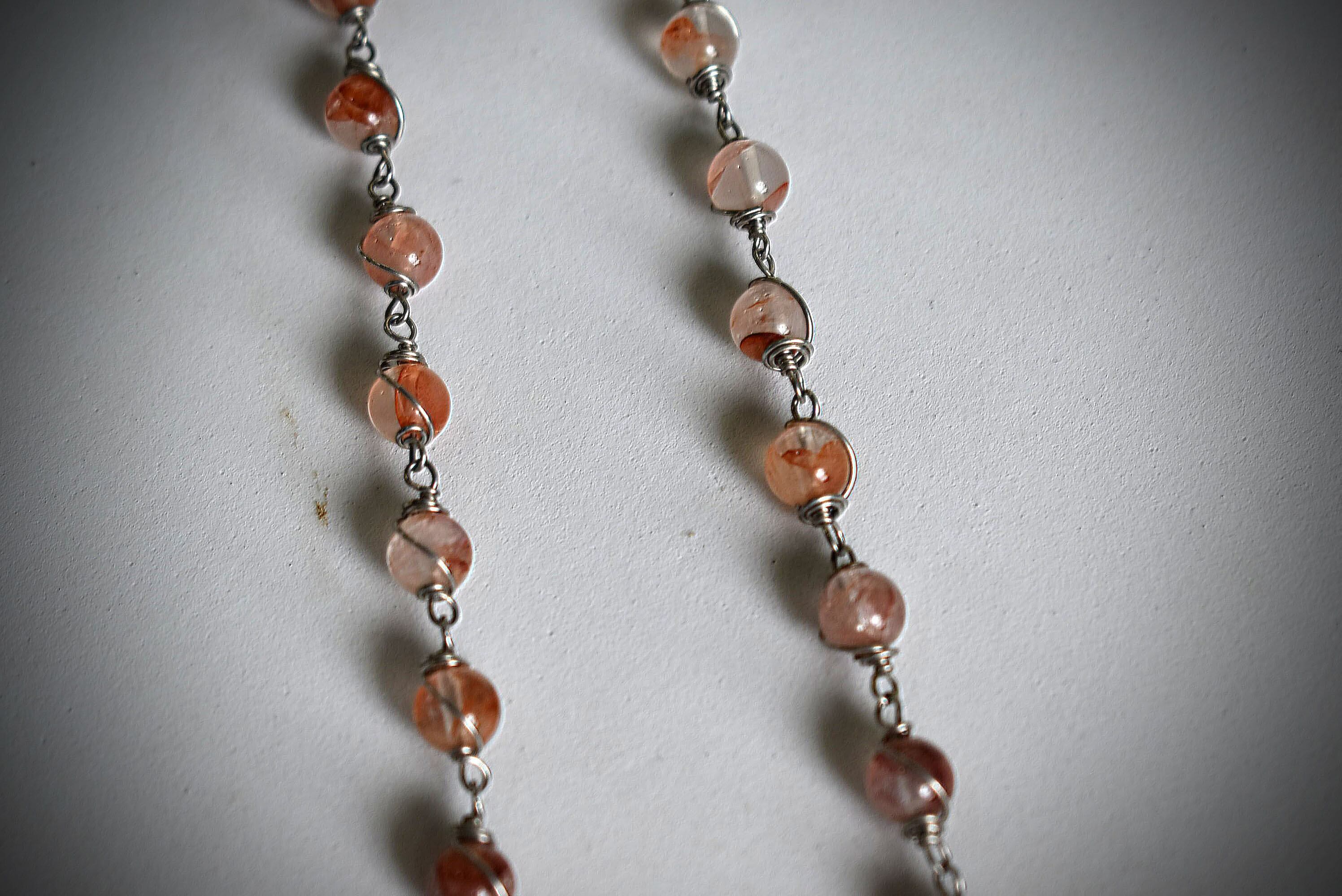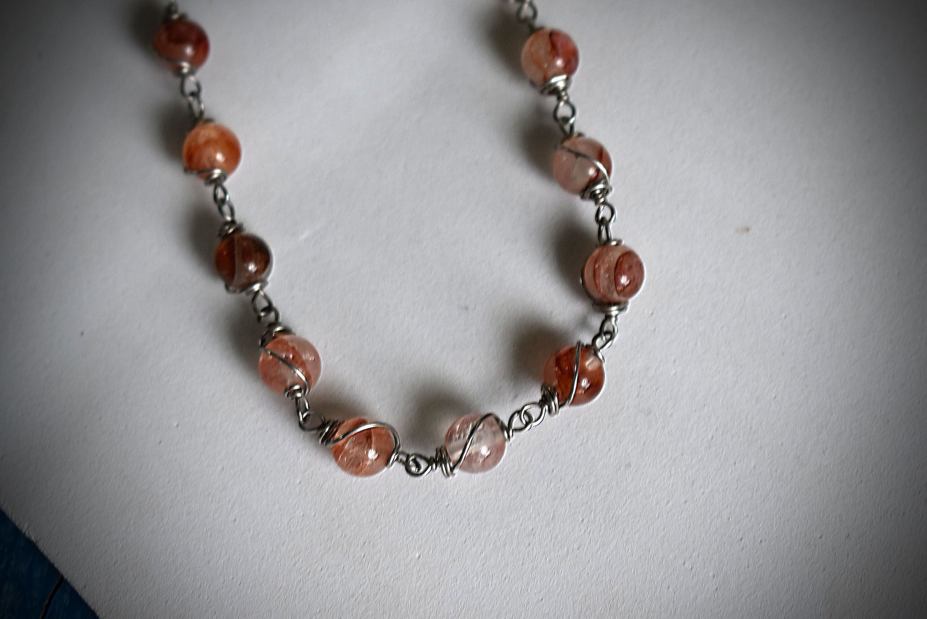 ミルキーな水晶と透明感あるビーズの中にピンク色の内包物がそれぞれ違った形で入り込んでいる愛らしいストロベリークォーツビーズをひとつひとつワイヤーで結んでネックレスに仕上げました。