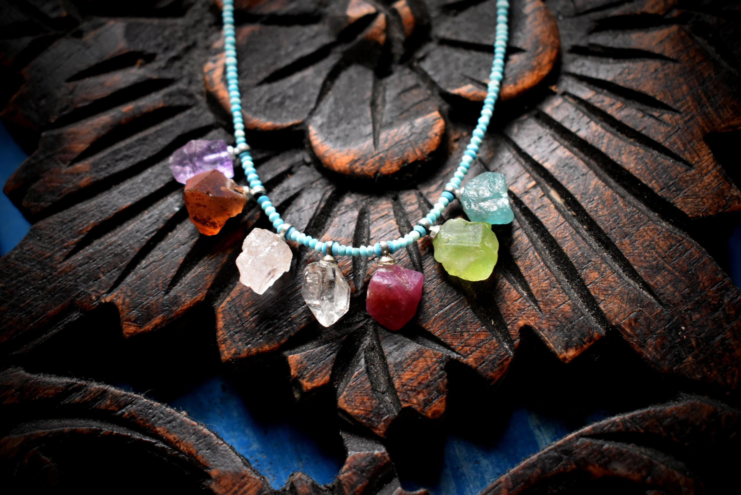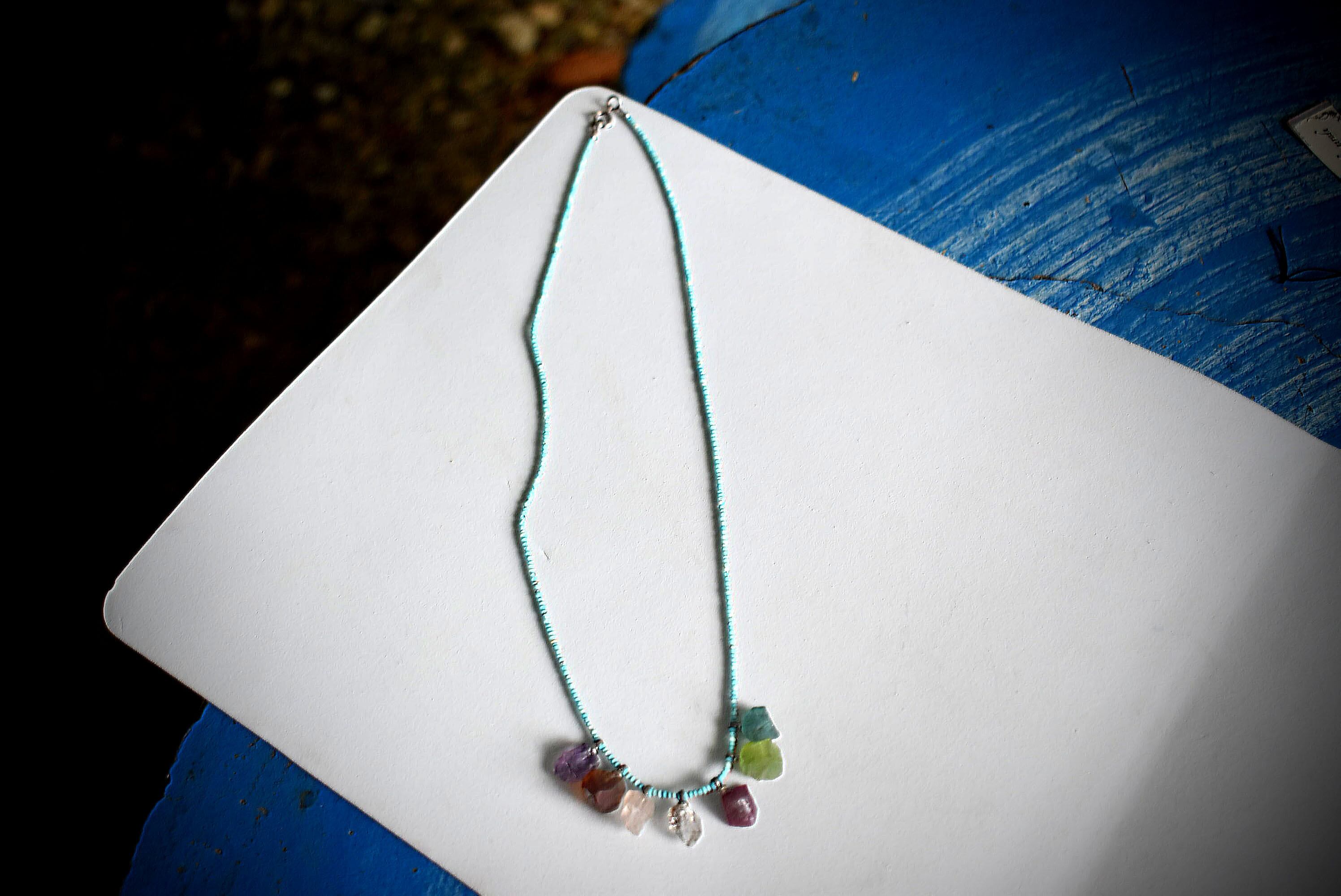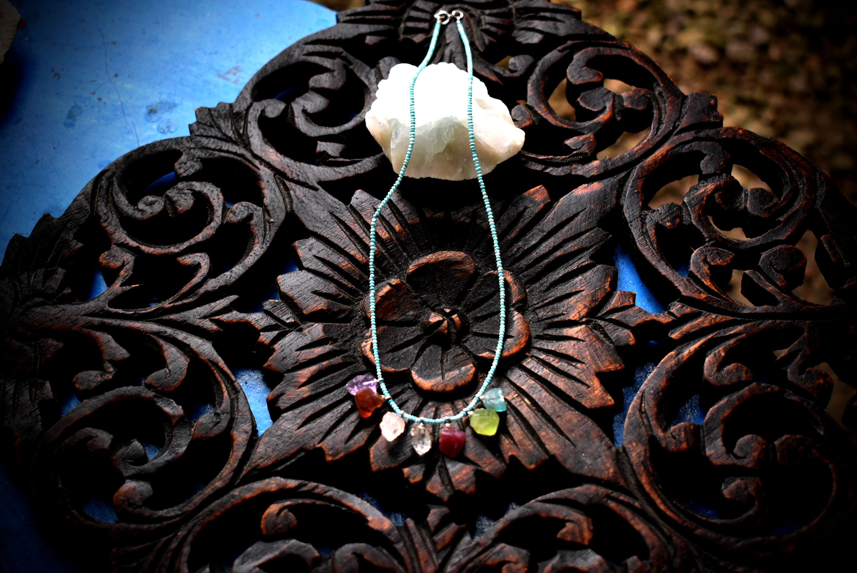 体と共鳴すると言われている7チャクラ称して原石を組み合わせて使用、制作したネックレス。