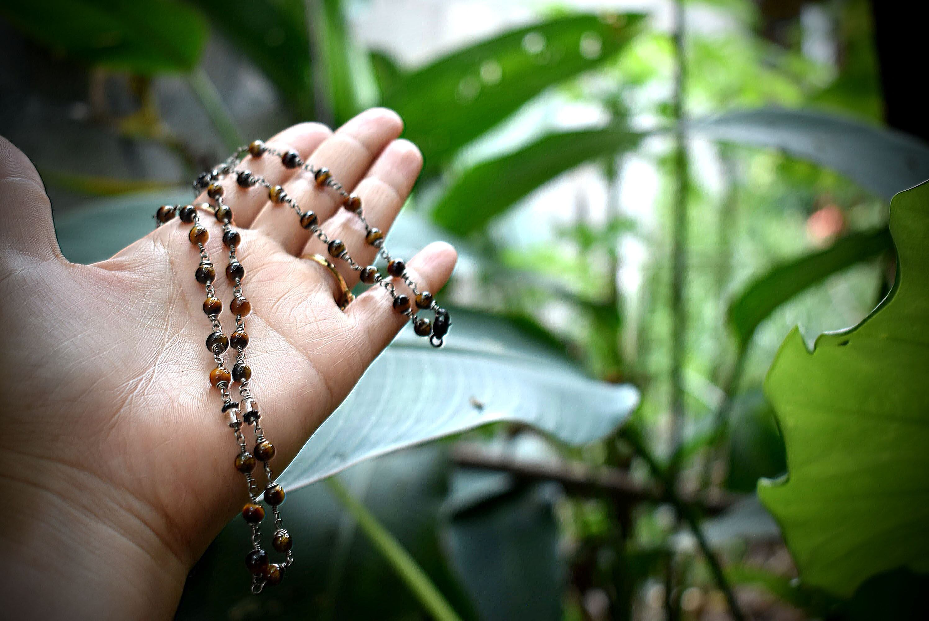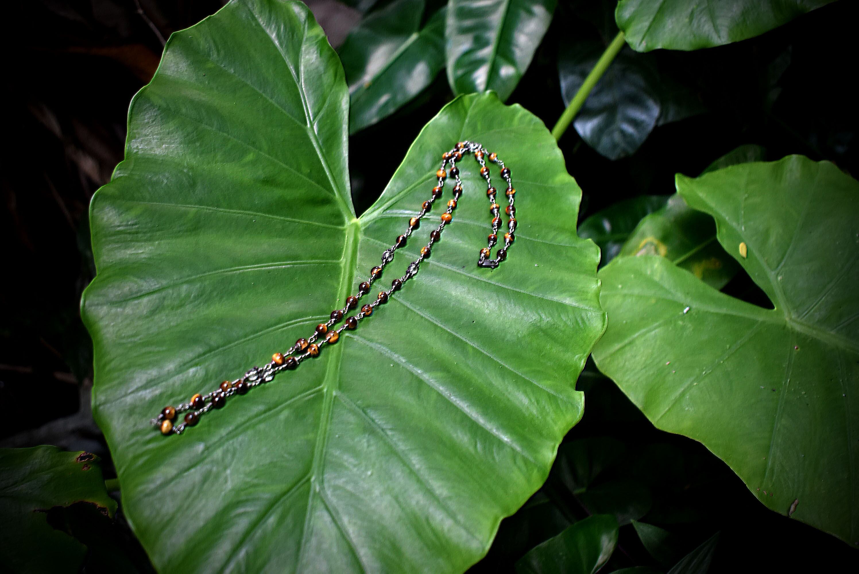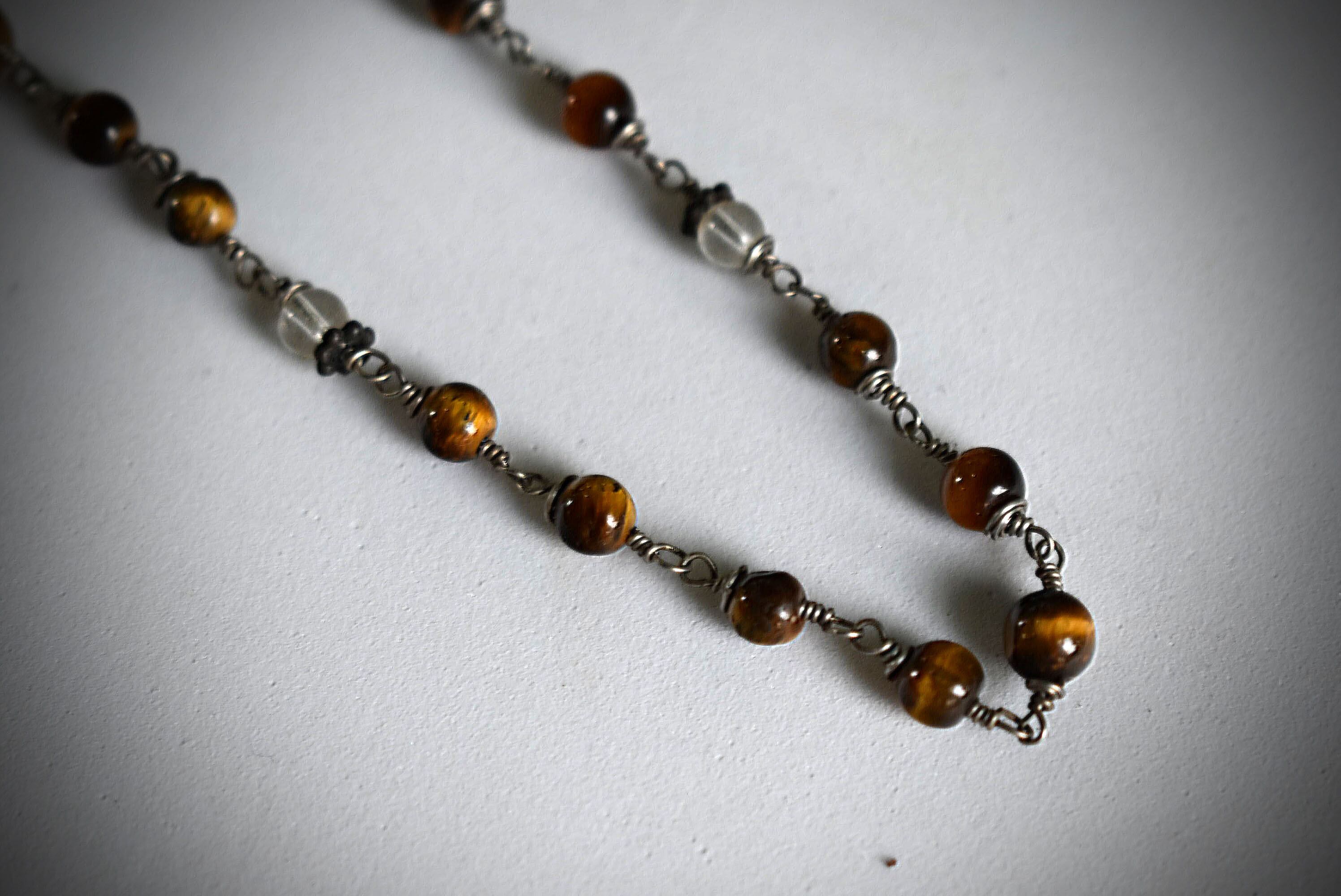 不動の人気ラッキーストーンと言われる天然石タイガーアイのビーズをひとつひとつワイヤーで結び、シルバー92.5パーツそしてフックを使用してお数珠のようなネックレスに仕上げました。