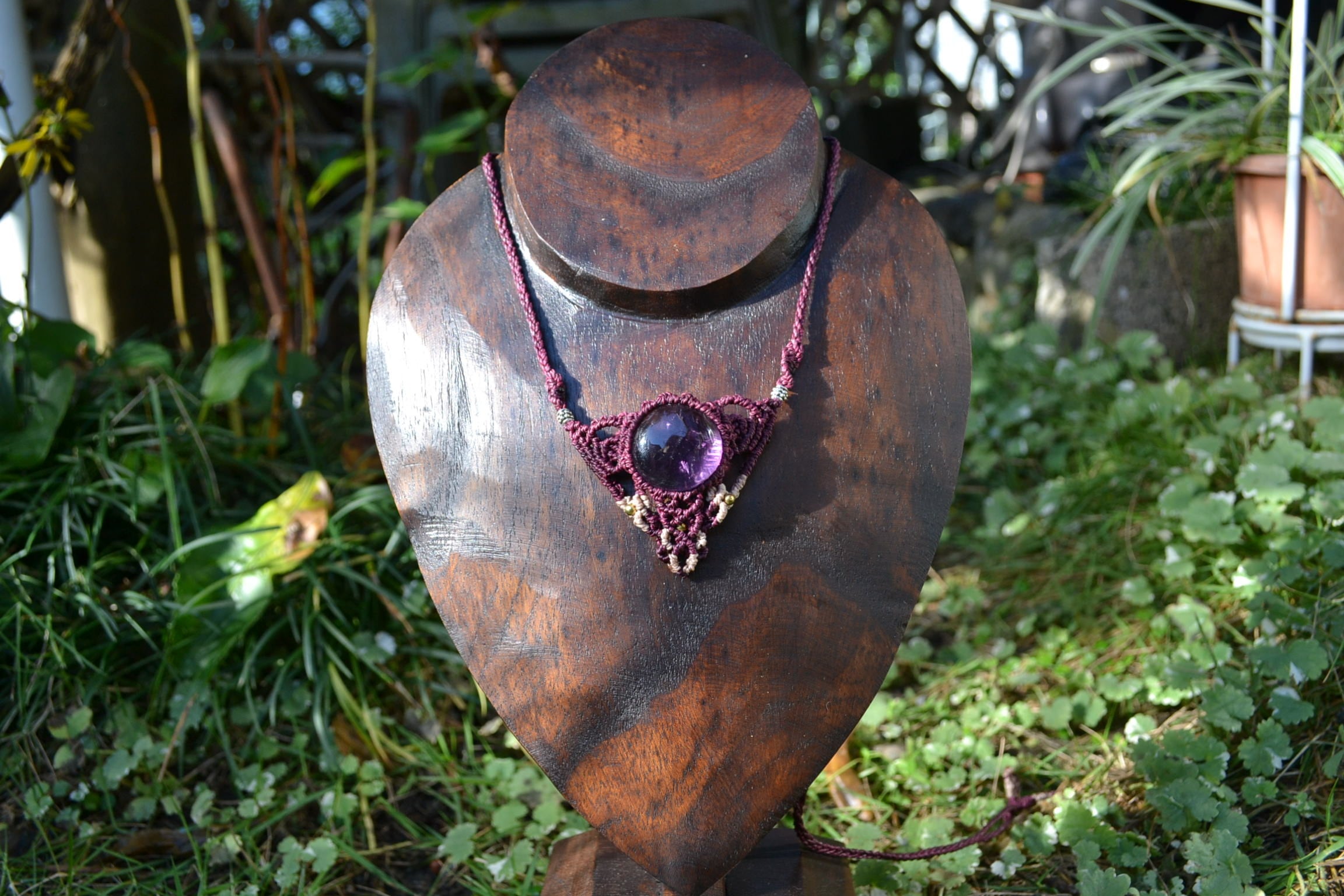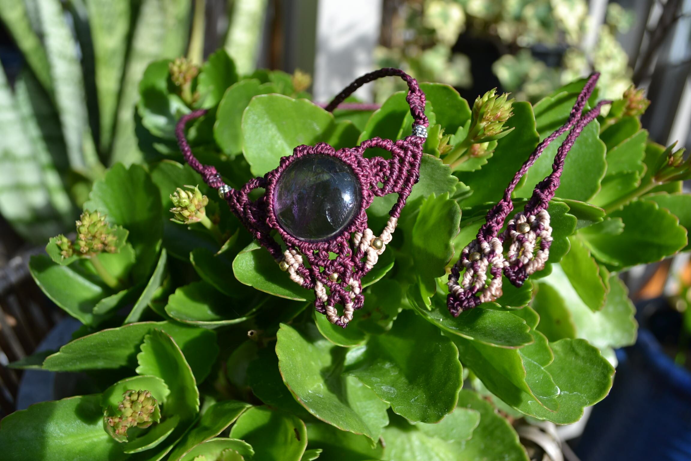 クリスタルのクリアさとアメジストの薄い紫色が体全体を保護してくれそうな美しいまんまるアメジストをペンダント型にマクラメ編み装飾を施し、ペンダント型に仕上げました。