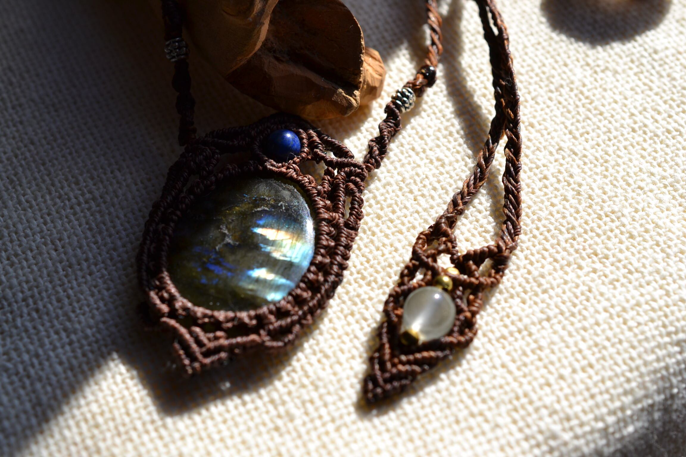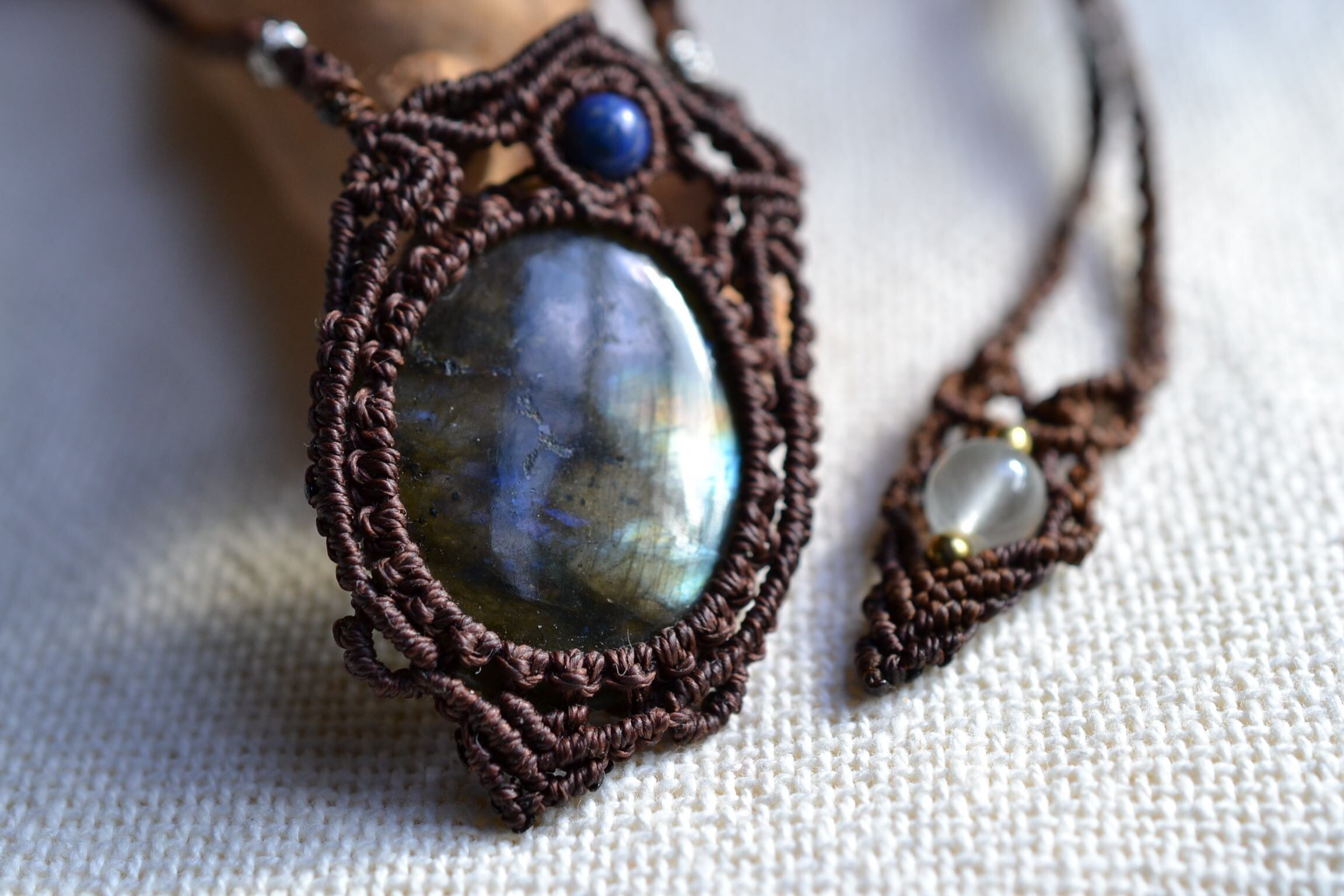 ゾッとするほど美しい色合いを魅せてくれるラブラドライドをクラシックなイメージでマクラメ編み装飾を施してネックレスペンダントに仕上げました。
